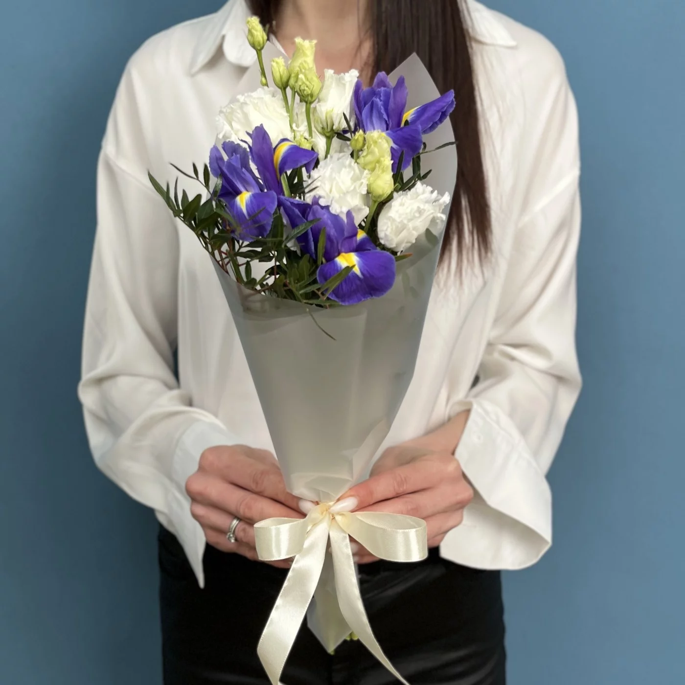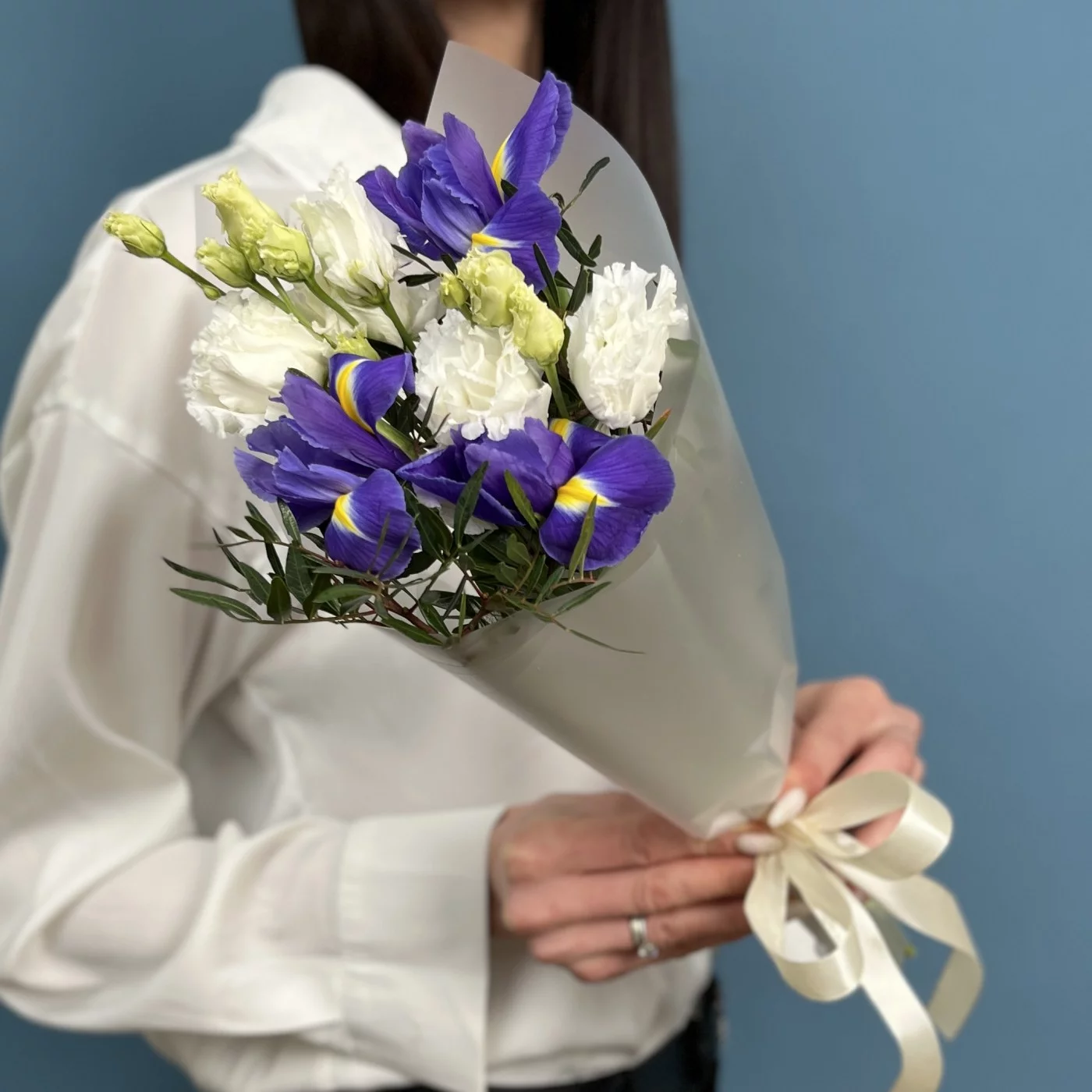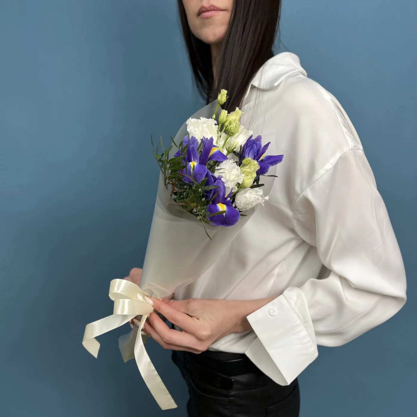 Ирисы символизируют мудрость и надежду, а белая эустома добавляет нежности и утонченности.