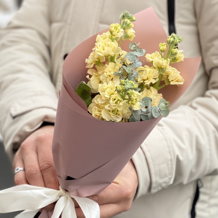 Нежный небольшой букет кремовых ароматных маттиол и эвкалипта станет прекрасным подарком для ваших сотрудников на 8 марта. Также такой букетик можно подарить дочке на день рождения.