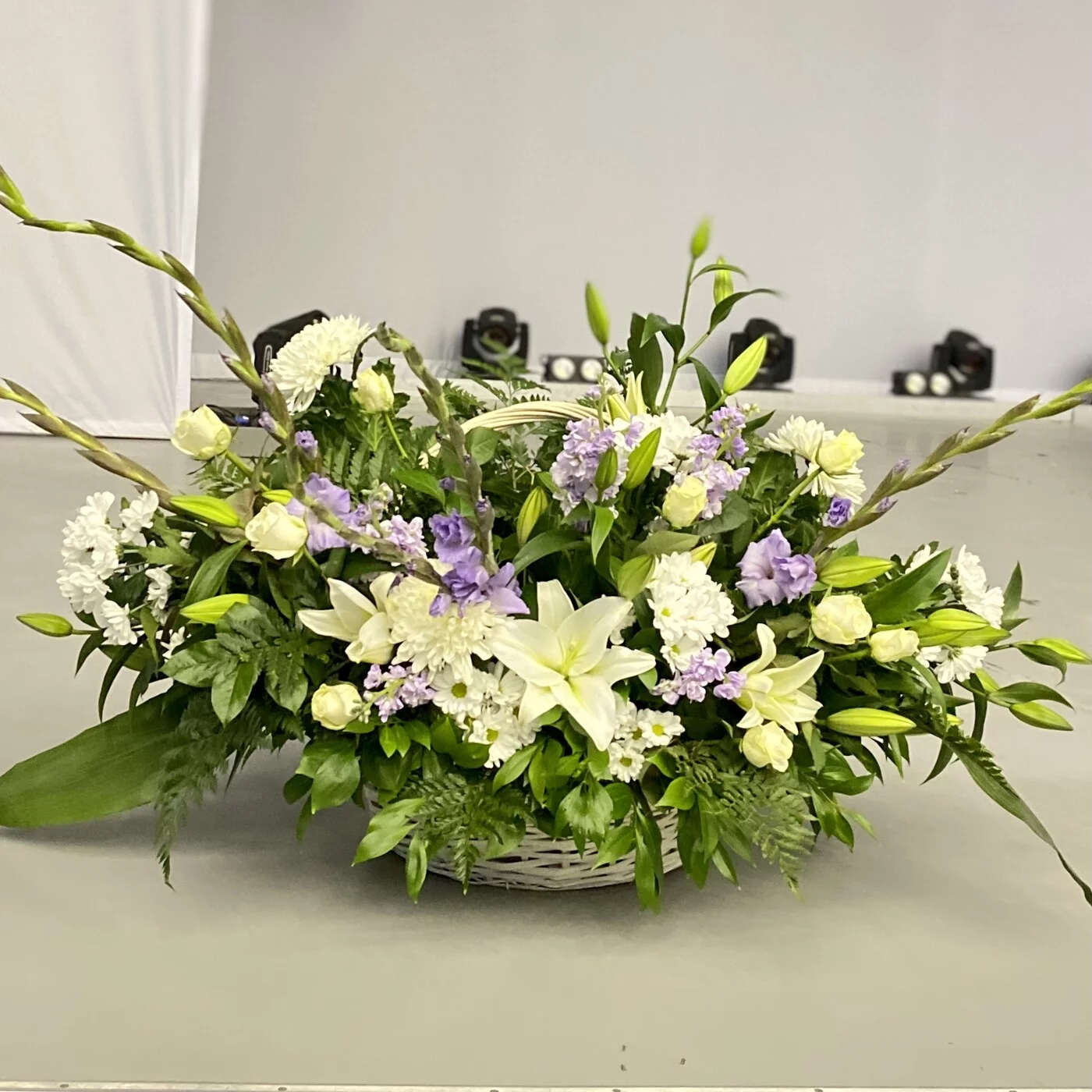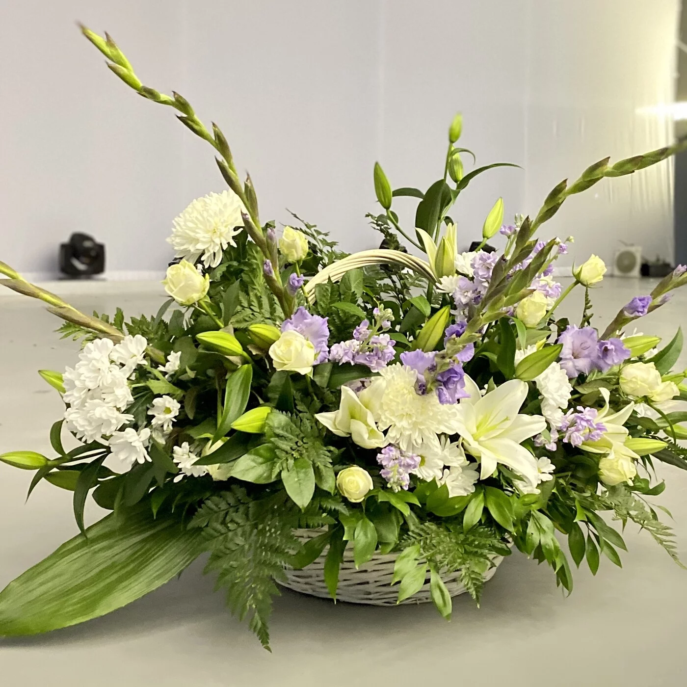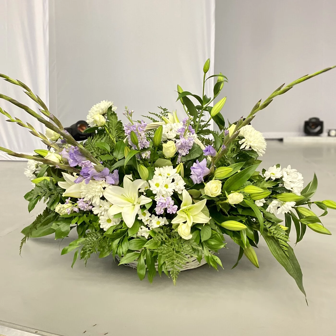 Корзина имеет овальную, вытянутую форму, в ее составе ароматные лилии, маттиолы, хризантемы.