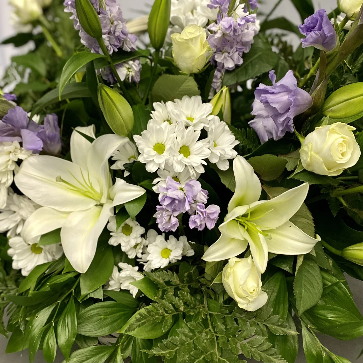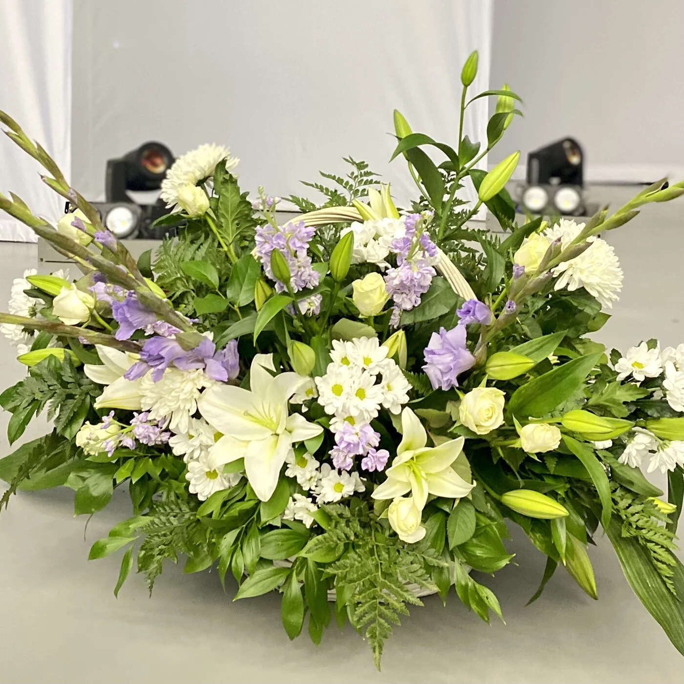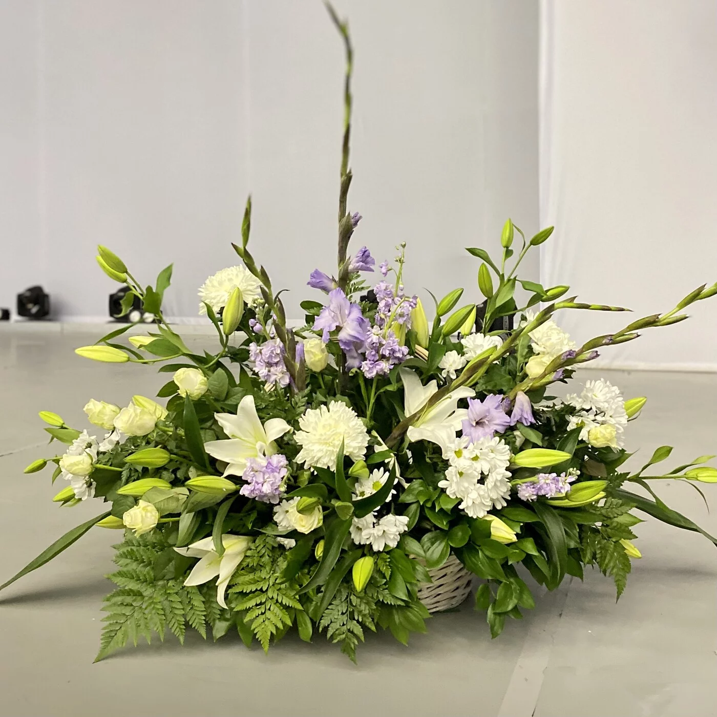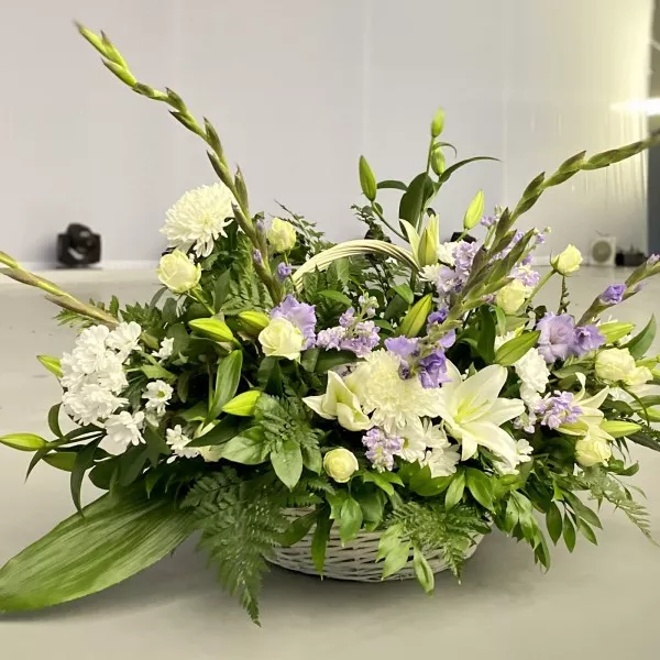 Корзина имеет овальную, вытянутую форму, в ее составе ароматные лилии, маттиолы, хризантемы.