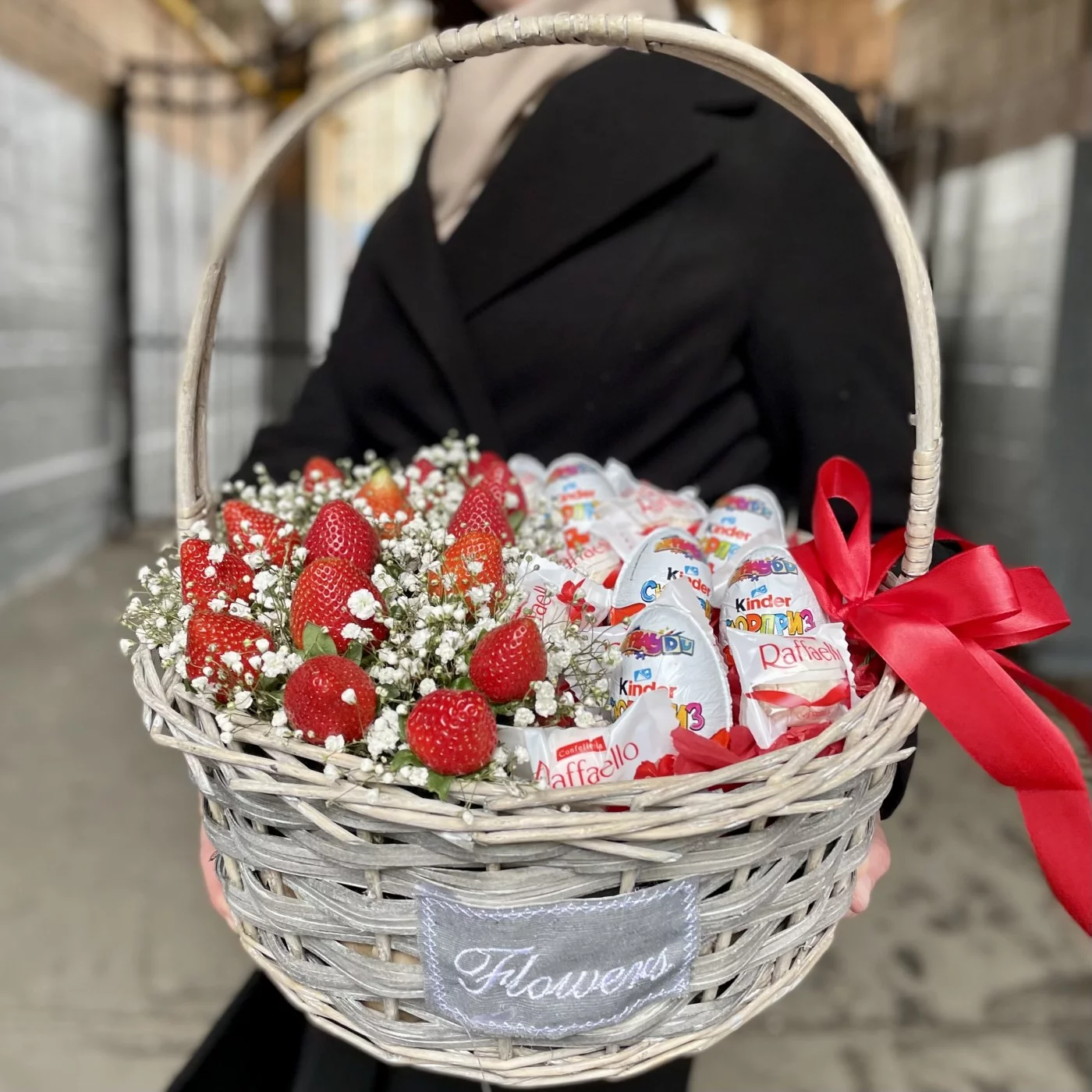 Торжественная корзина с киндер сюрпризами, рафаэлло и ароматной клубникой. Такую корзину очень приятно получить в подарок и взрослому и ребенку. Этот шоколад любят все с детства а конфеты рафаэлло тем более. Такую вкусную корзину можно подарить не только на день рождения, но и на 8 марта или прислать в качестве комплимента.