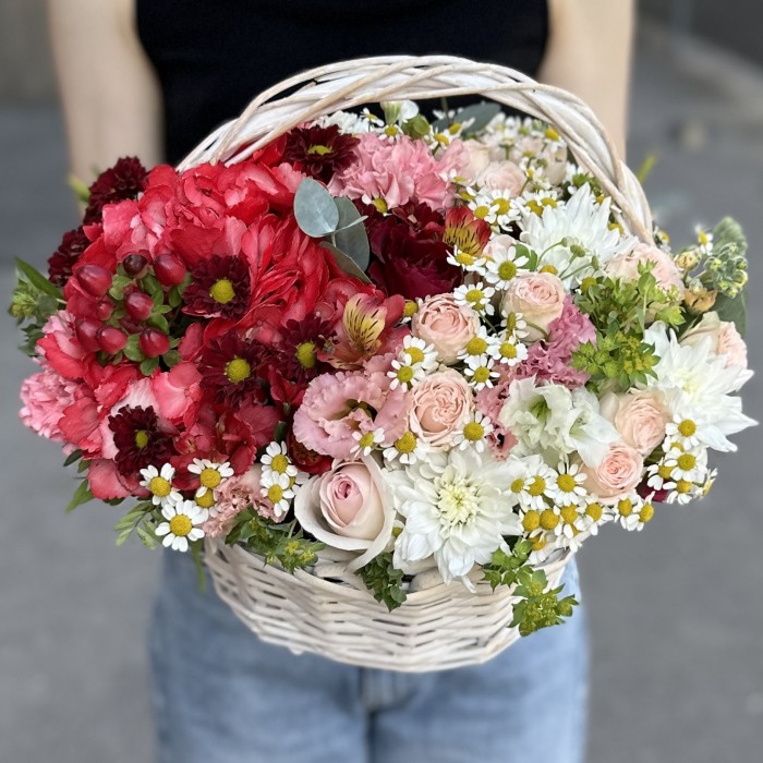 Подарочная корзина с цветами. Прекрасный подарок на юбилей или день рождения. Такая композиция поднимет настроение и будет радовать получателя долгое время.