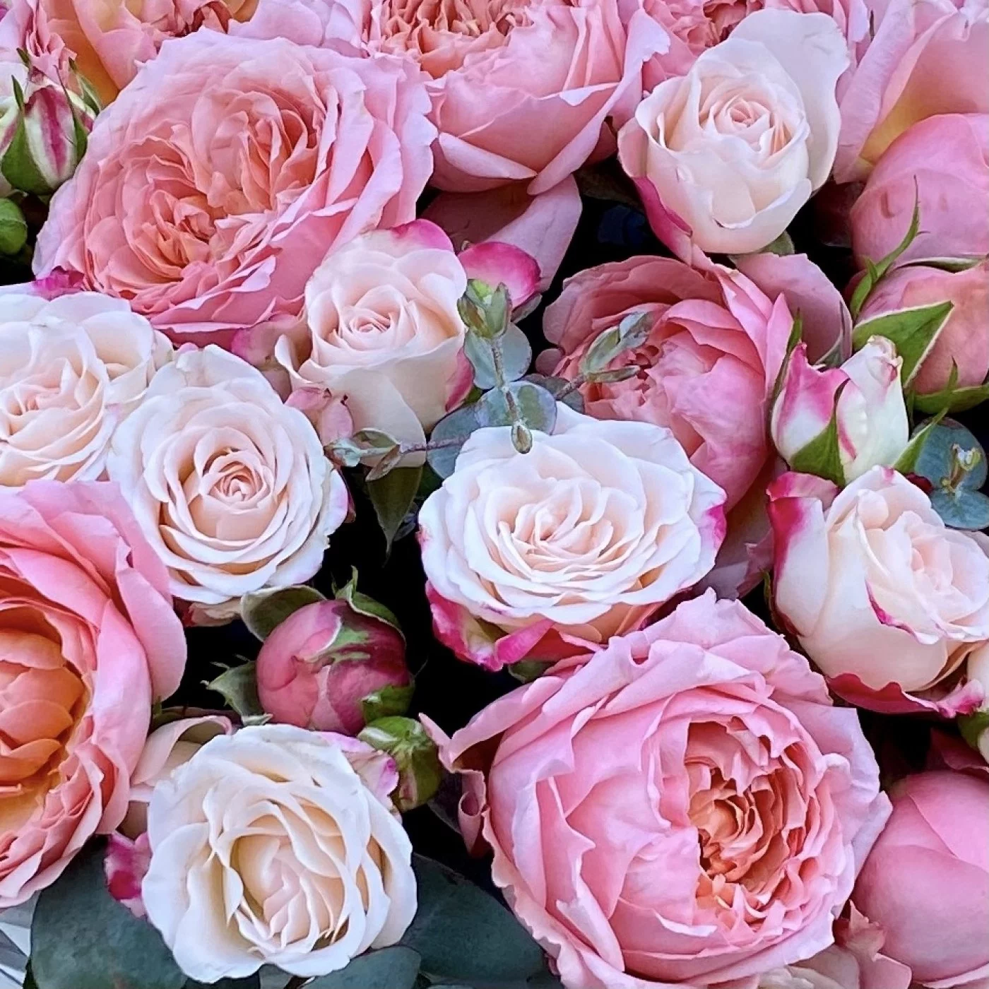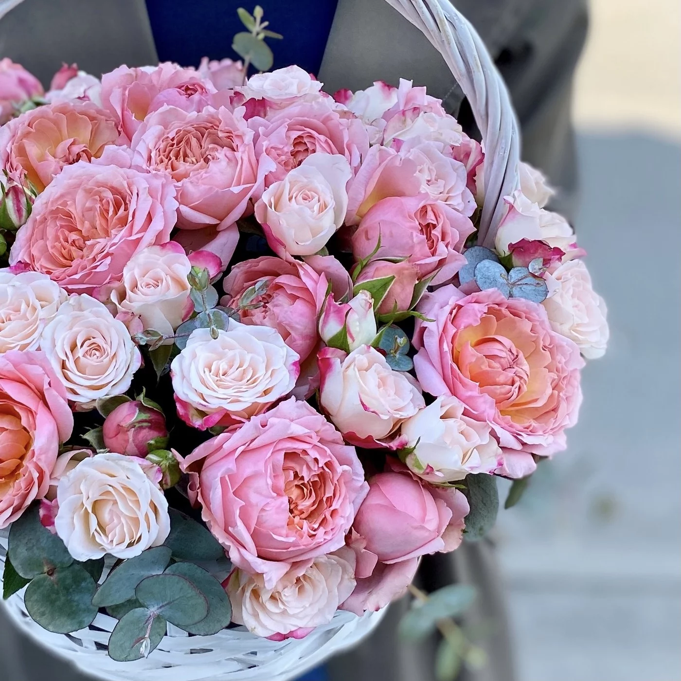 Корзина из кустовых пионовидных роз сорта Джульетта и кустовых роз Рефлекс. Нежная композиция в корзине станет прекрасным дополнением к подарку.