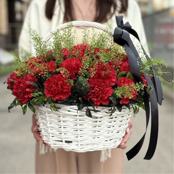 Корзина с красными гвоздиками, для возложения возле памятников великой отечественной войне. Торжественная композиция с гвоздиками и гринбелом.