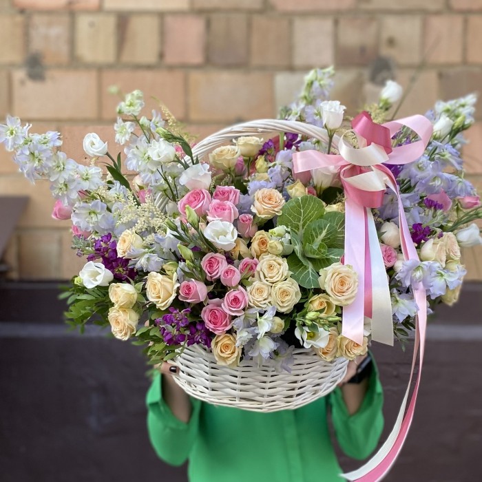 Нежная и пышная корзина с розами и ароматной маттиолой будет долго радовать получателя своей красотой.