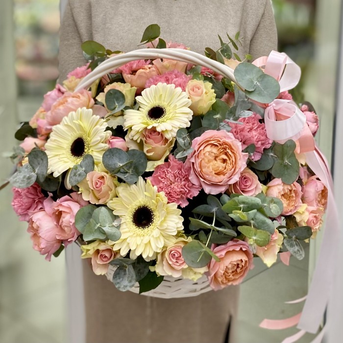 Корзина в персиковом оттенке станет запоминающимся подарком к любому торжеству. Нежные розы дополнены герберами будут радовать получателя своей красотой.