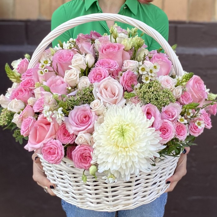 Корзина в розовом оттенке станет запоминающимся подарком к любому торжеству. Нежные розы дополнены хризантемой будут радовать получателя своей красотой.