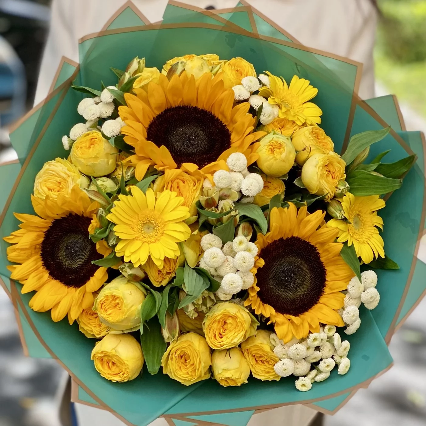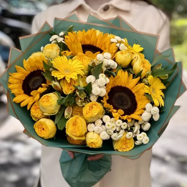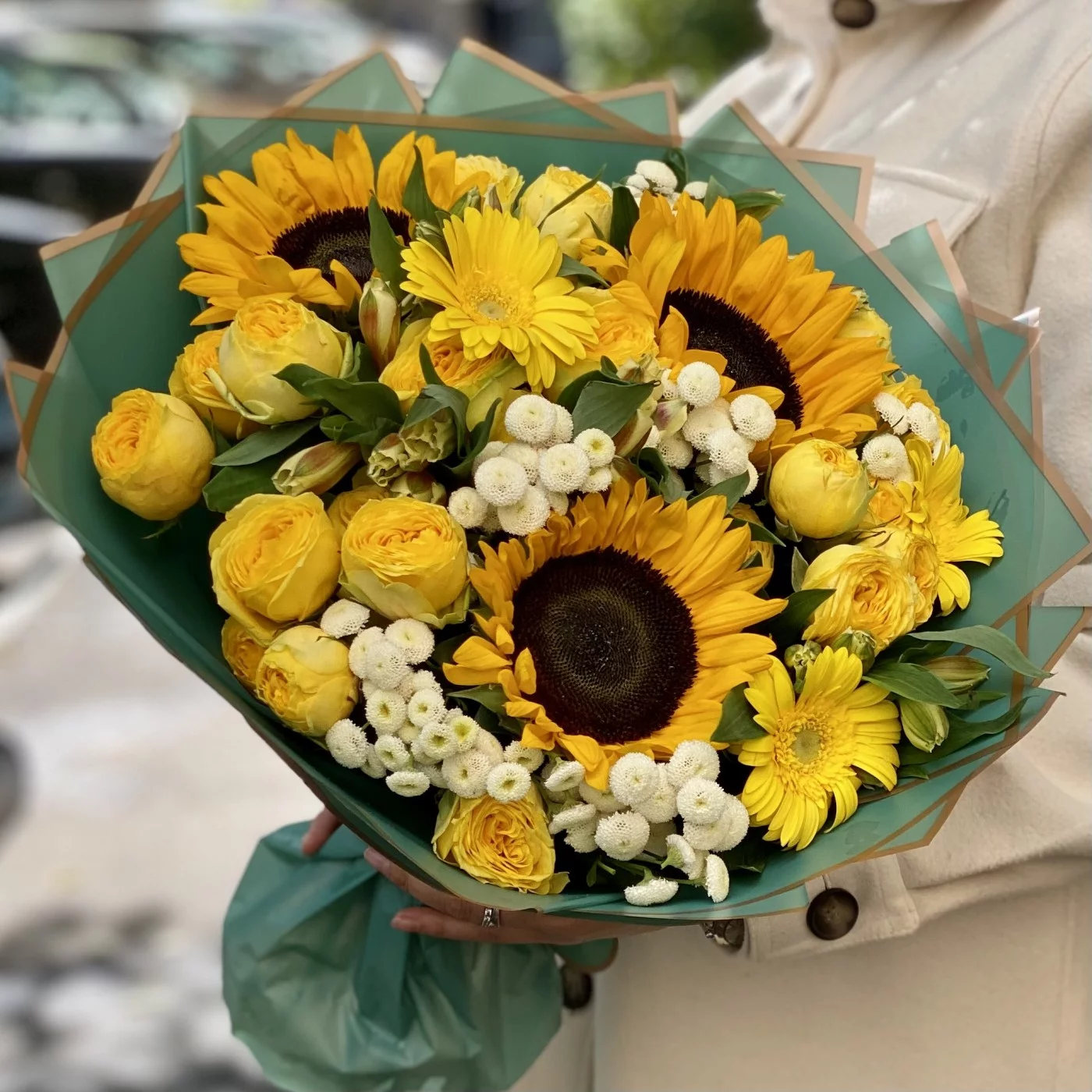 Букет с необычными желтыми пионовидными розами и подсолнухами цвета жаркого летнего солнца. Заряжен на тепло, хорошую погоду в доме и удачу.