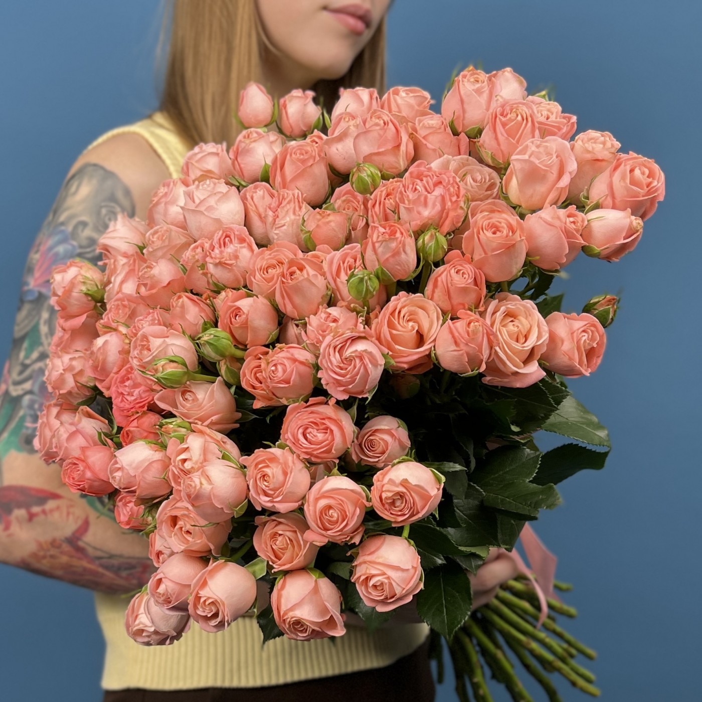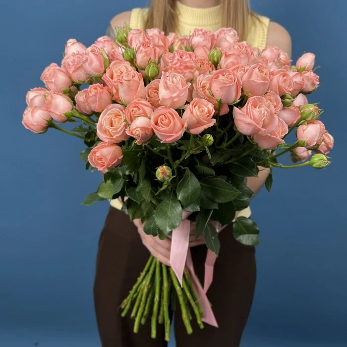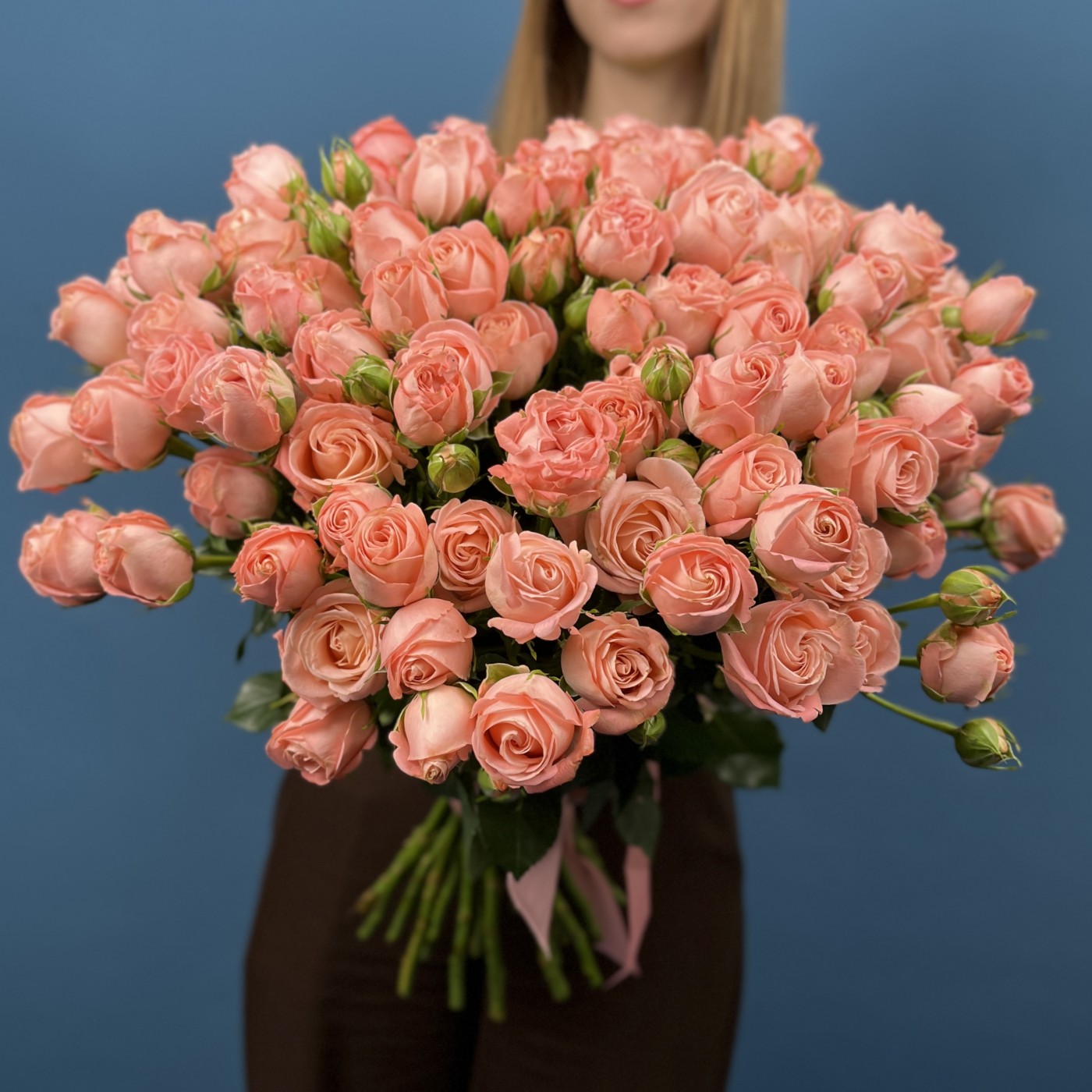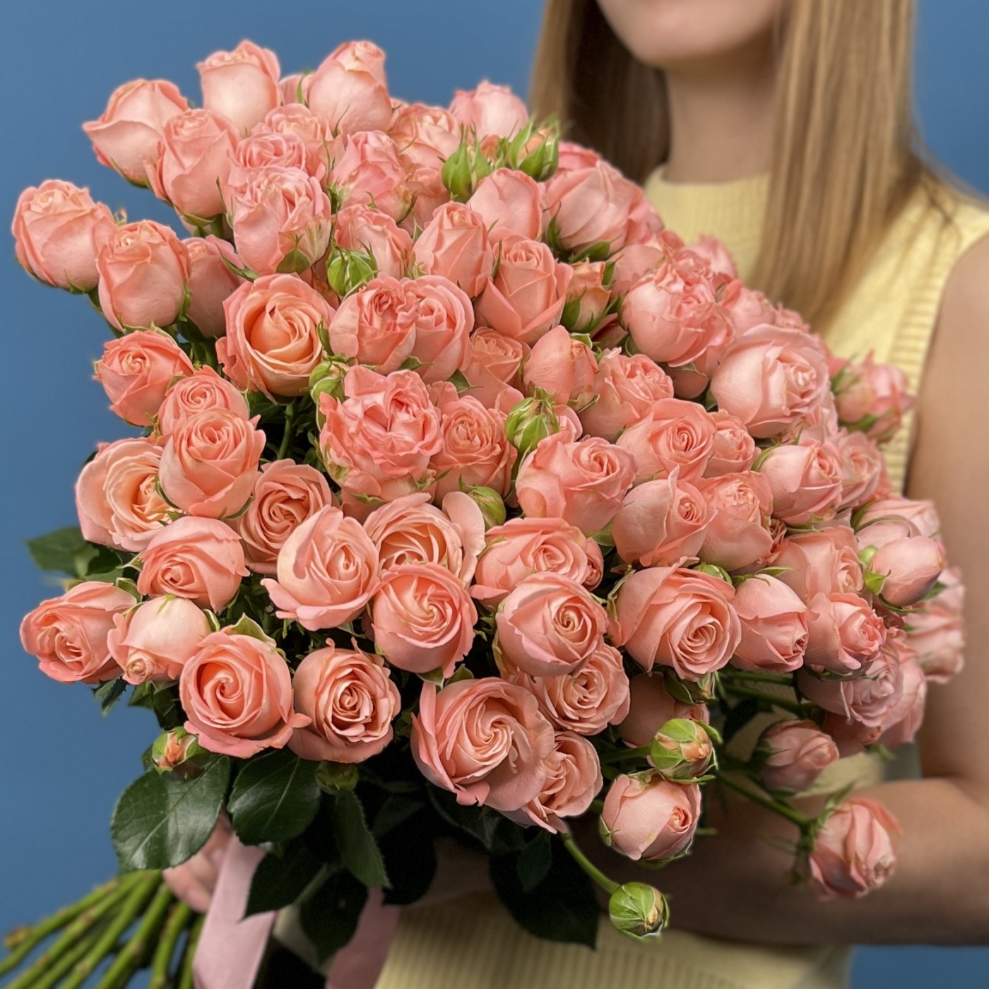 Нежная коралловая пионовидная роза Амэйзинг мэджик 50 см словно рождает теплое сияние розового цвета. Плотные атласные головки роз, округлые и нежные, наполняют воздух волной цветочной свежести и неповторимого аромата.