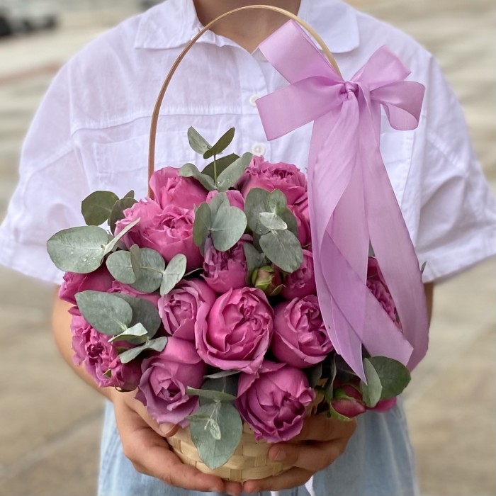 Яркая композиция из кустовой пионовидной розы Мисти баблс с добавлением ароматного эвкалипта. Композиция размещена в плетеной корзиночке с атласной лентой. Это отличный подарок коллеге или подруге в день рождения. Доставляем букеты и композиции по Москве и Подмосковью круглосуточно!