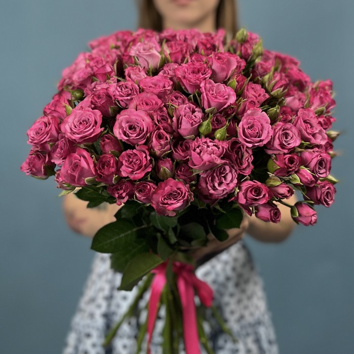 Кустовая пионовидная роза Пурпл Куин высотой 40 см — это изящное сочетание насыщенного пурпурного оттенка и пышной пионовидной формы цветка