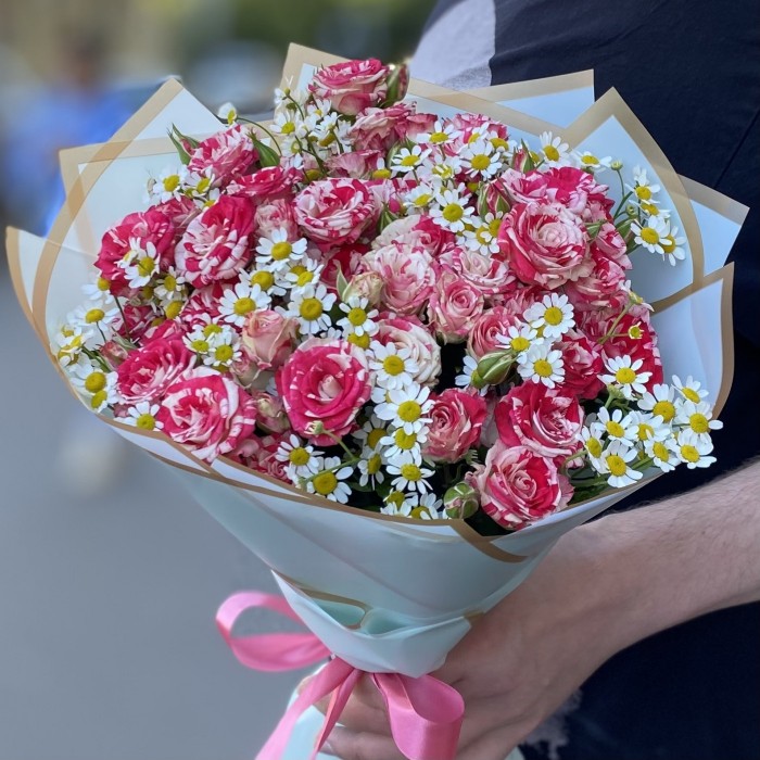Этот букет – воплощение нежности и радости, созданный для того, чтобы подарить улыбку и теплоту. Он состоит из кустовой розы и ромашки, гармонично сочетающихся в элегантной композиции.