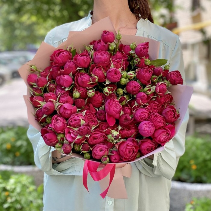 Букет из кустовых роз вишневого цвета. Бутон розы имеет круглую форму, а лепестки - волнистую. Такой букет можно взять с собой на свидание или подарить на любой праздник. Цена указана без упаковки, с помощью специальной кнопки вы можете выбрать упаковку.