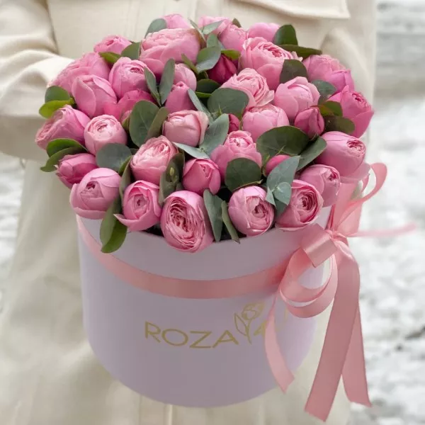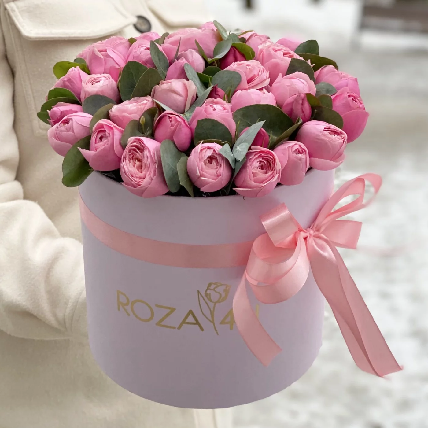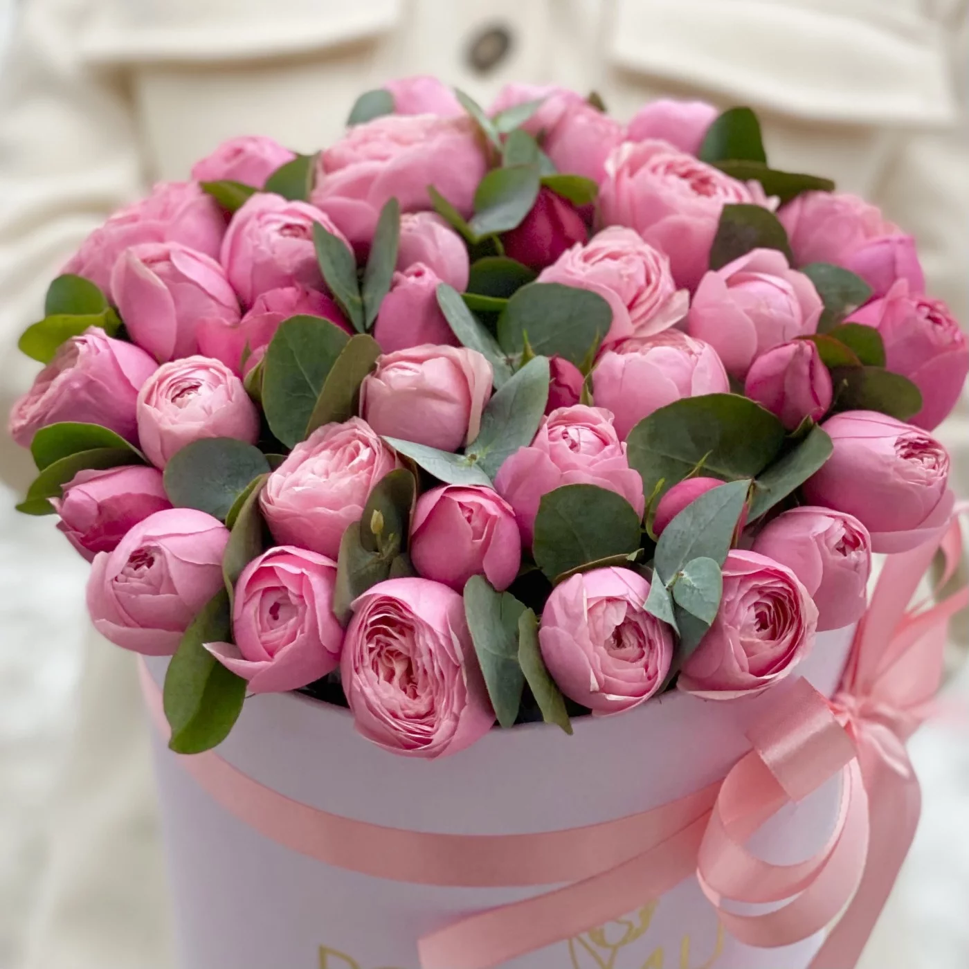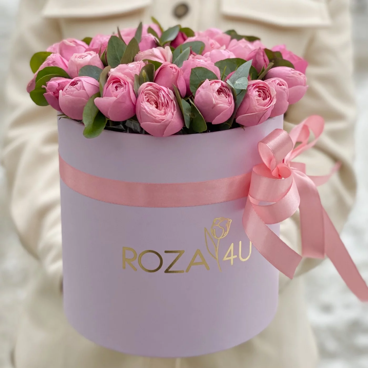 Букет из пионовидной розы сорта Сильва Пинк в круглой коробке - модный и красивый комплимент женской красоте! Удивите прекрасную леди этим роскошным подарком, который обязательно заставит её улыбнуться.