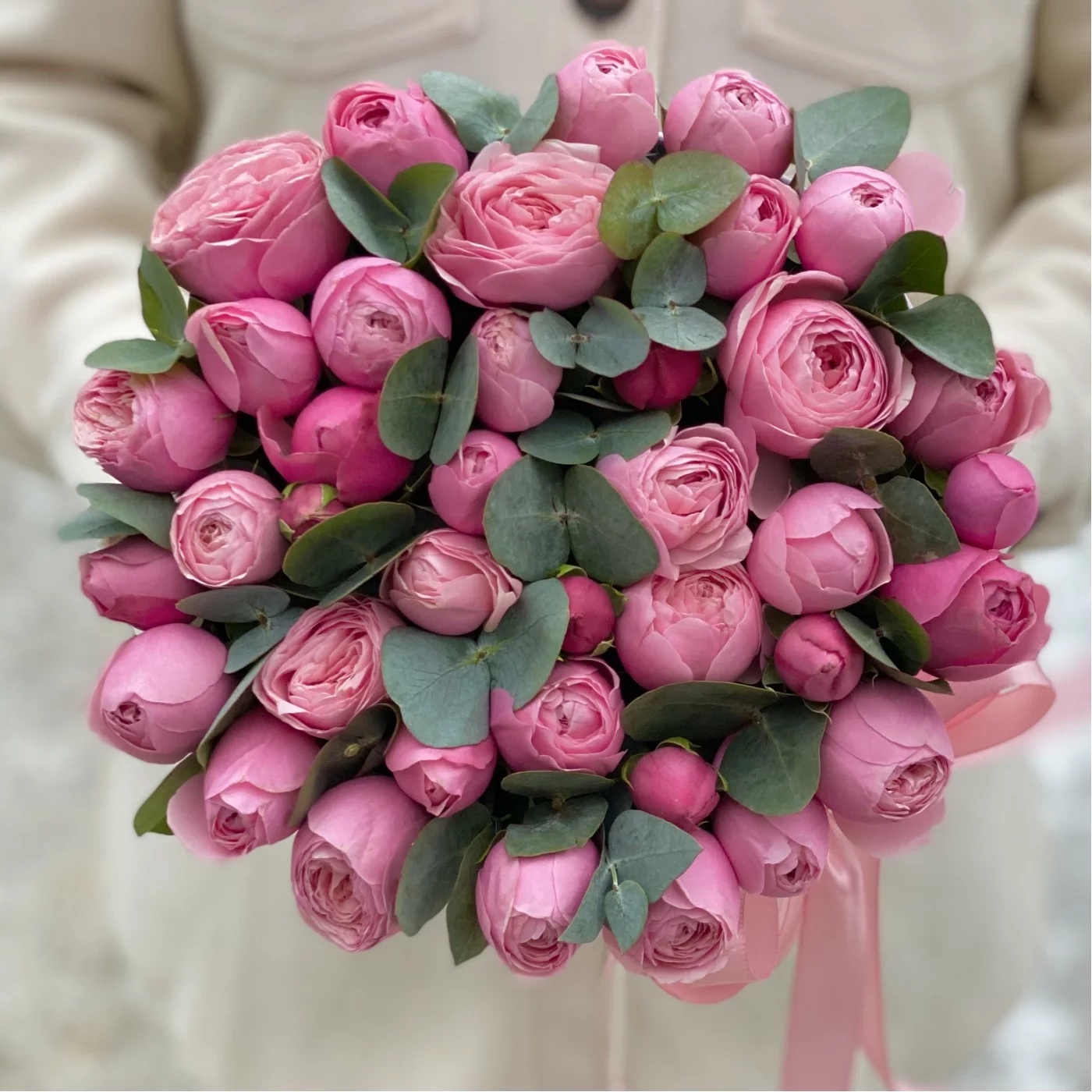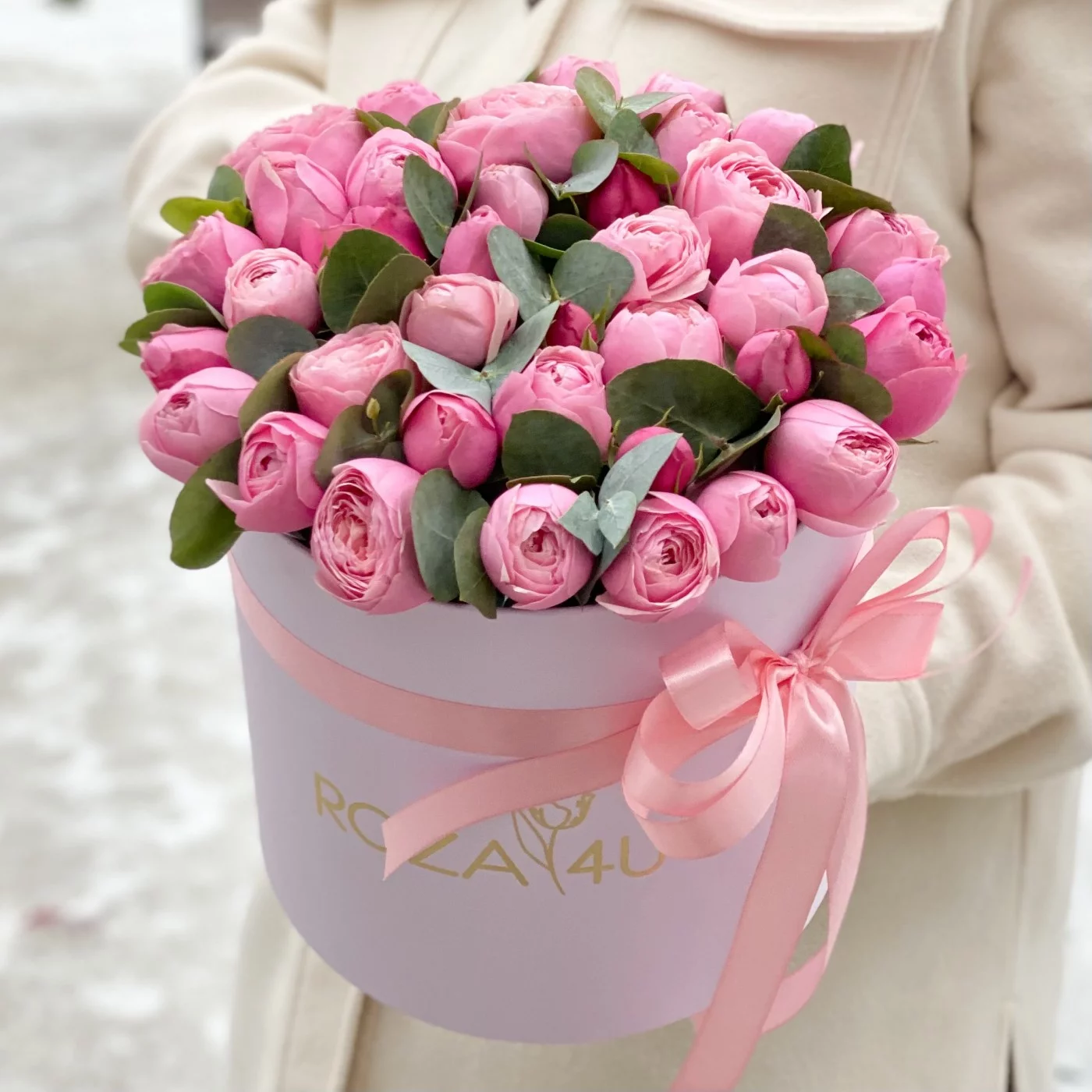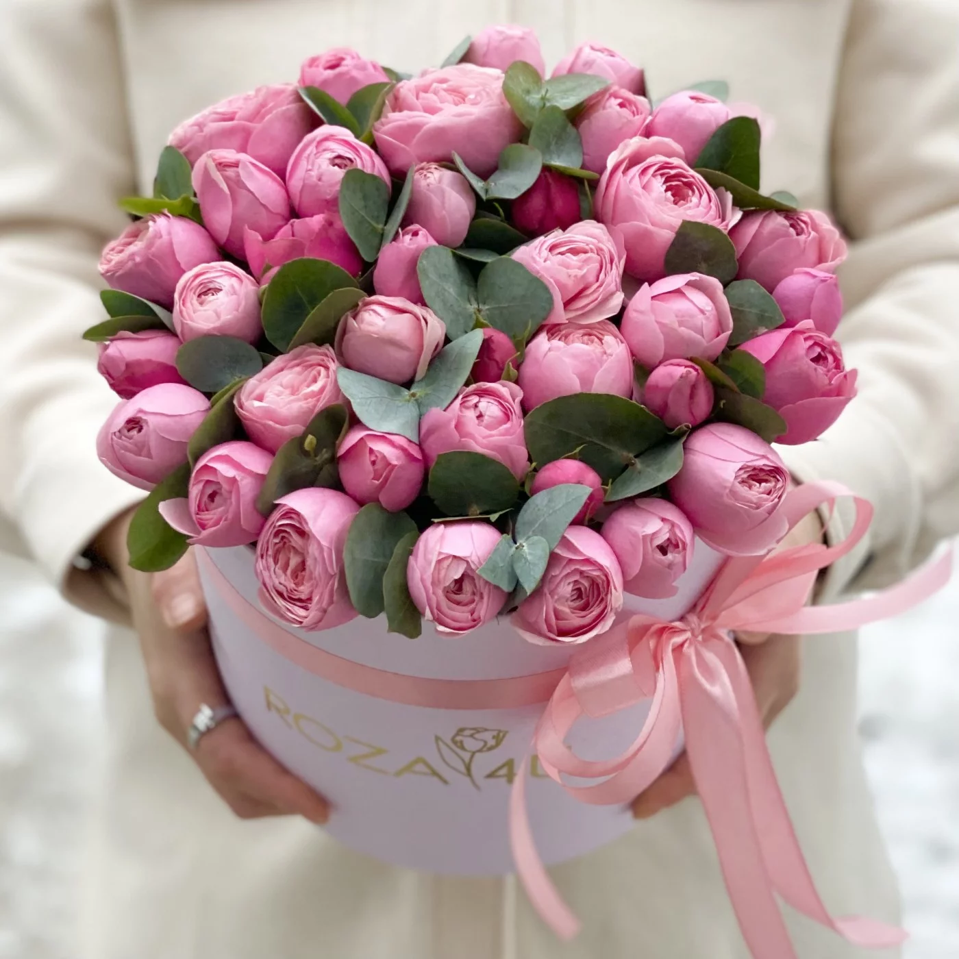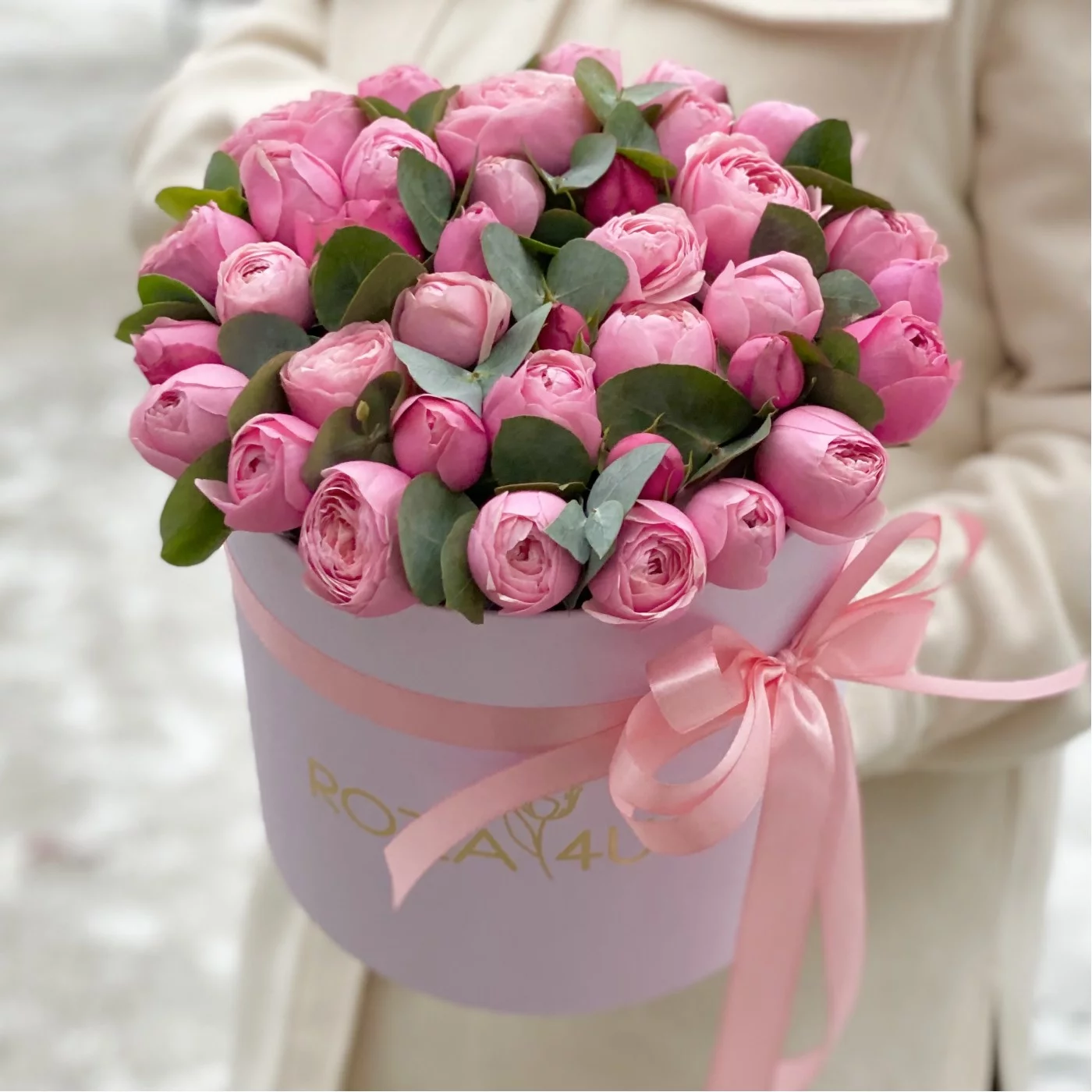 Букет из пионовидной розы сорта Сильва Пинк в круглой коробке - модный и красивый комплимент женской красоте! Удивите прекрасную леди этим роскошным подарком, который обязательно заставит её улыбнуться.
