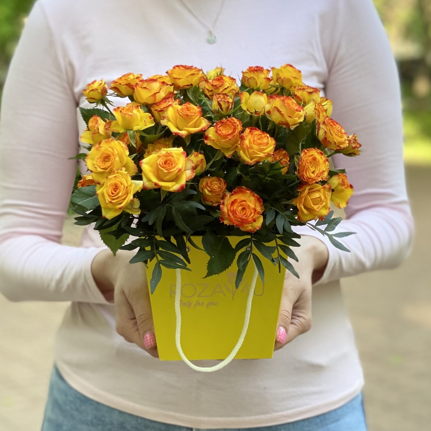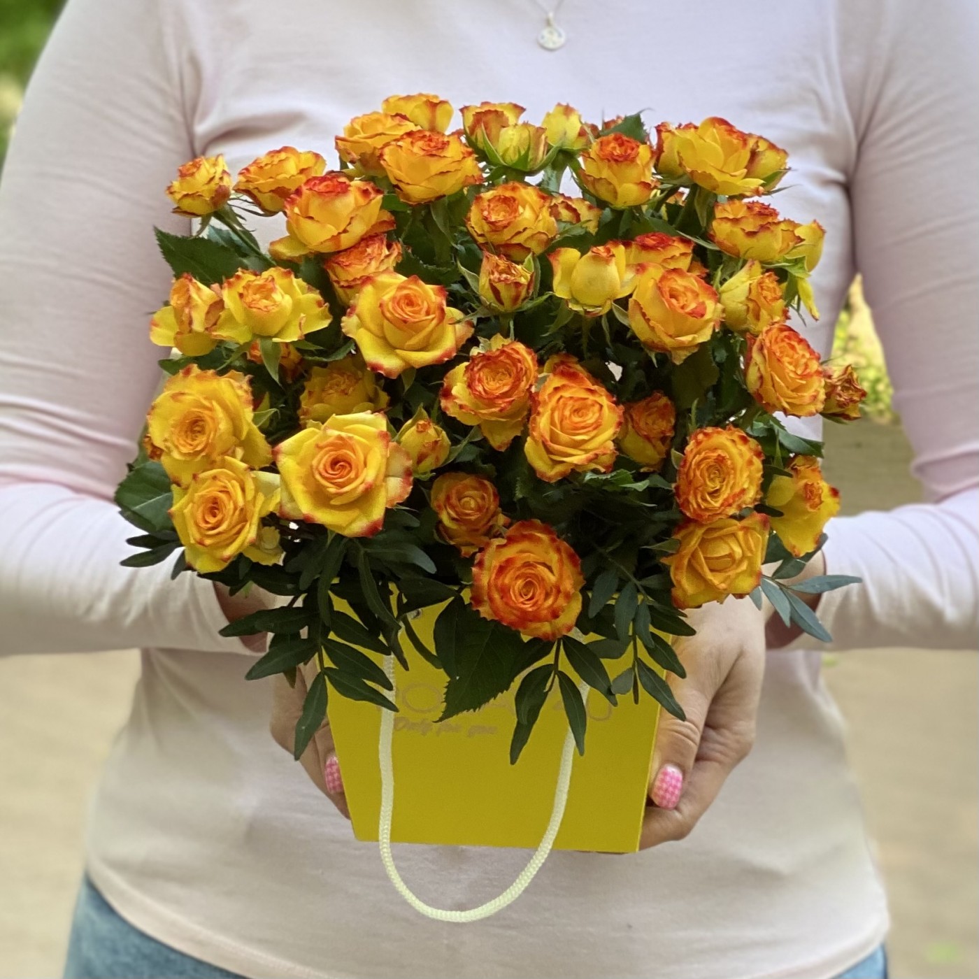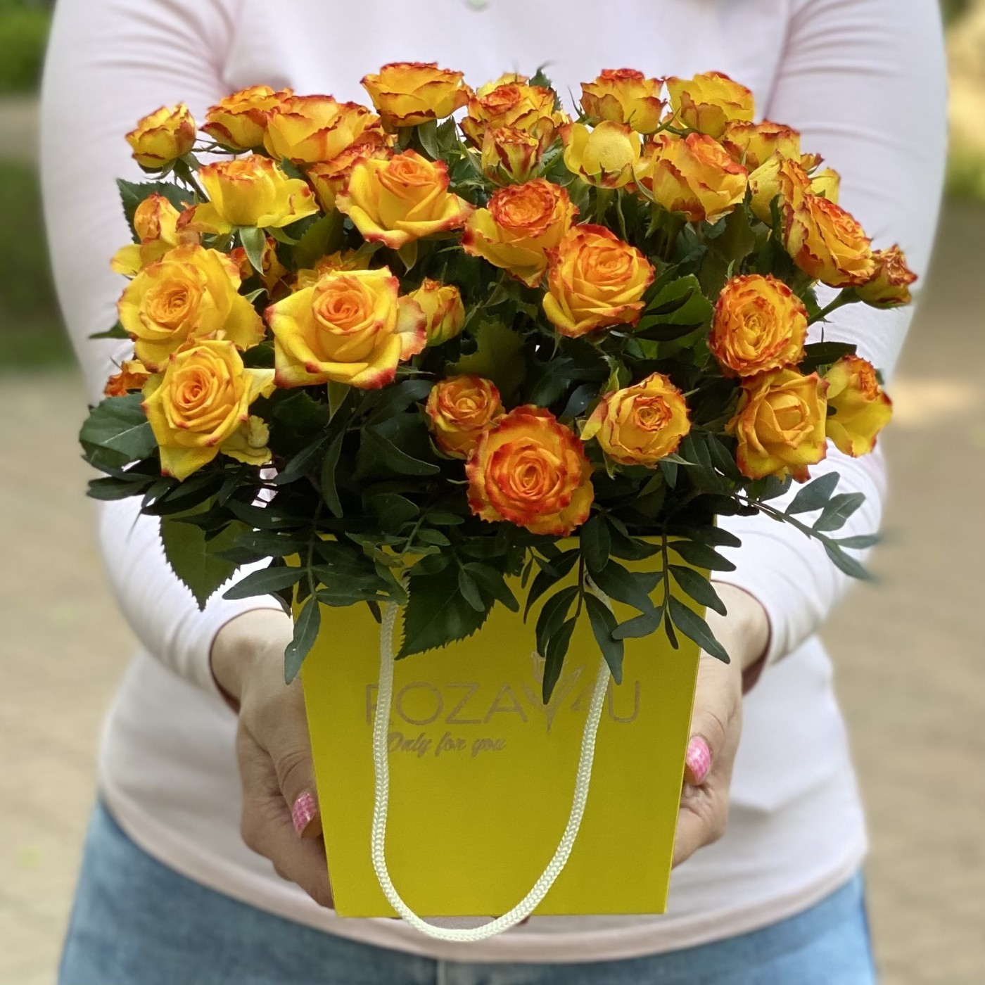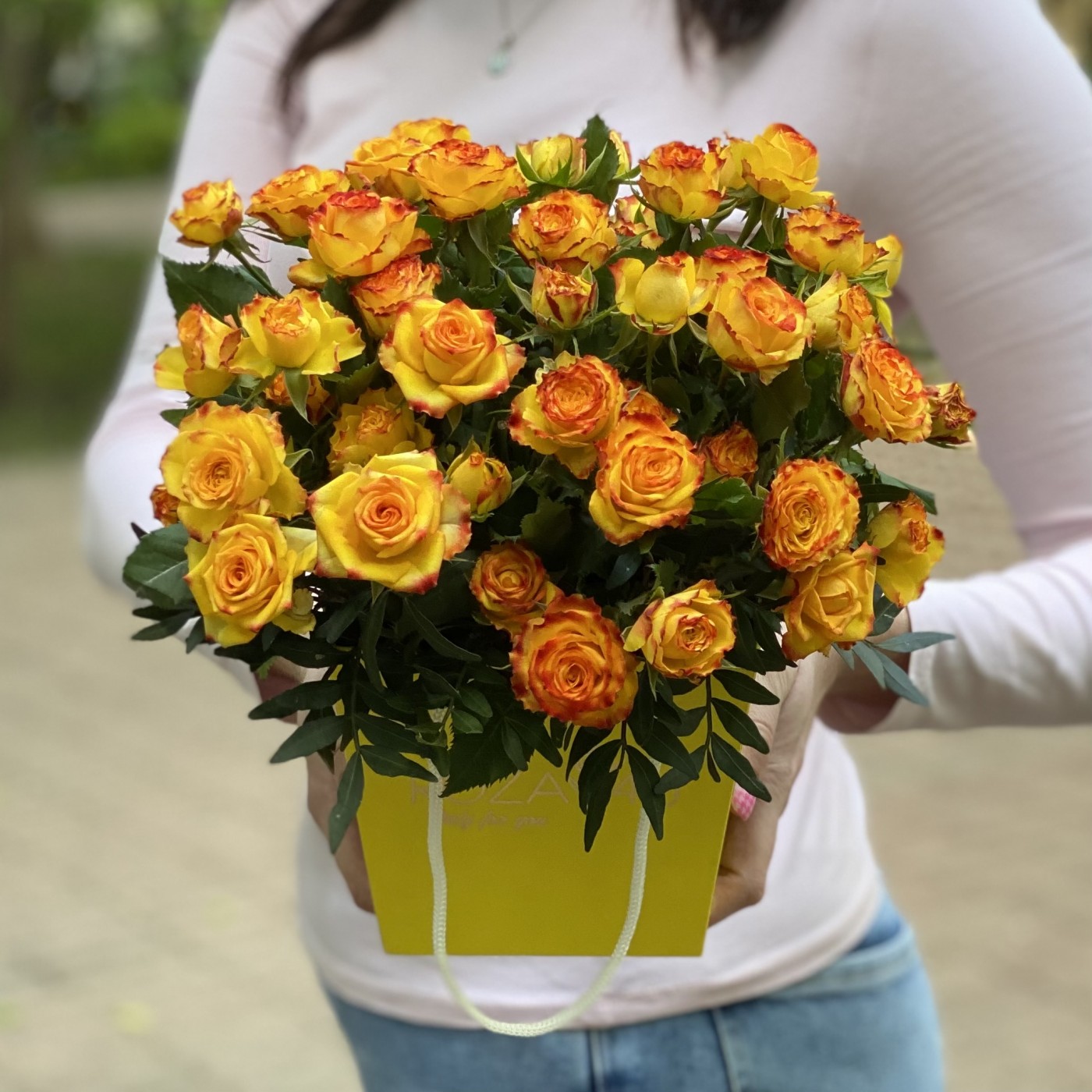 Кустовые розы элегантны и притягательны. А эта композиция по-своему уникальна! Мы взяли 10 веток желто-красных кустовых роз сорта Айлайнер, добавили сочно-зеленый писташ и упаковали в красивую квадратную коробку с веревочными ручками — получился оригинальный подарок, который порадует собой любого цветочного фаната.