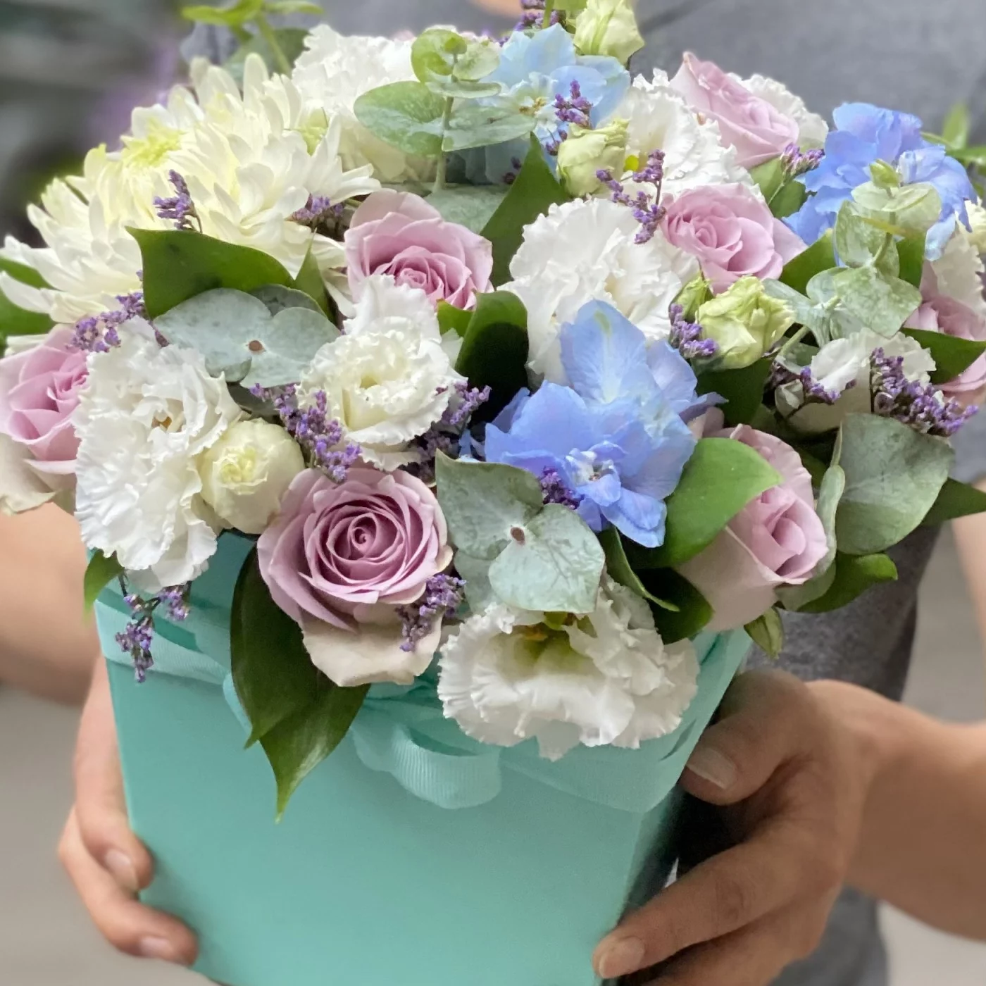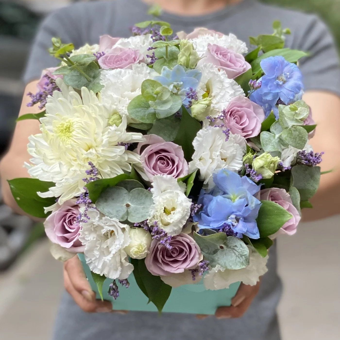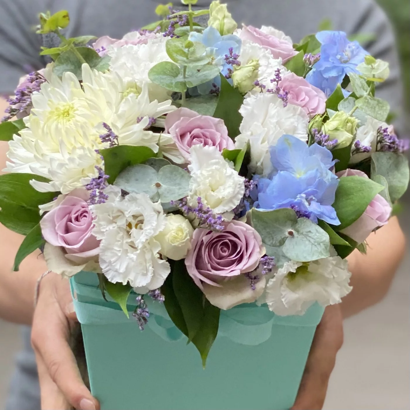 Композиция в коробке "Ласковый ветер". Светлая композиция будет гармонично смотреться как украшение стола, подарок на встречу, знак внимания или альтернатива чувственному комплименту.