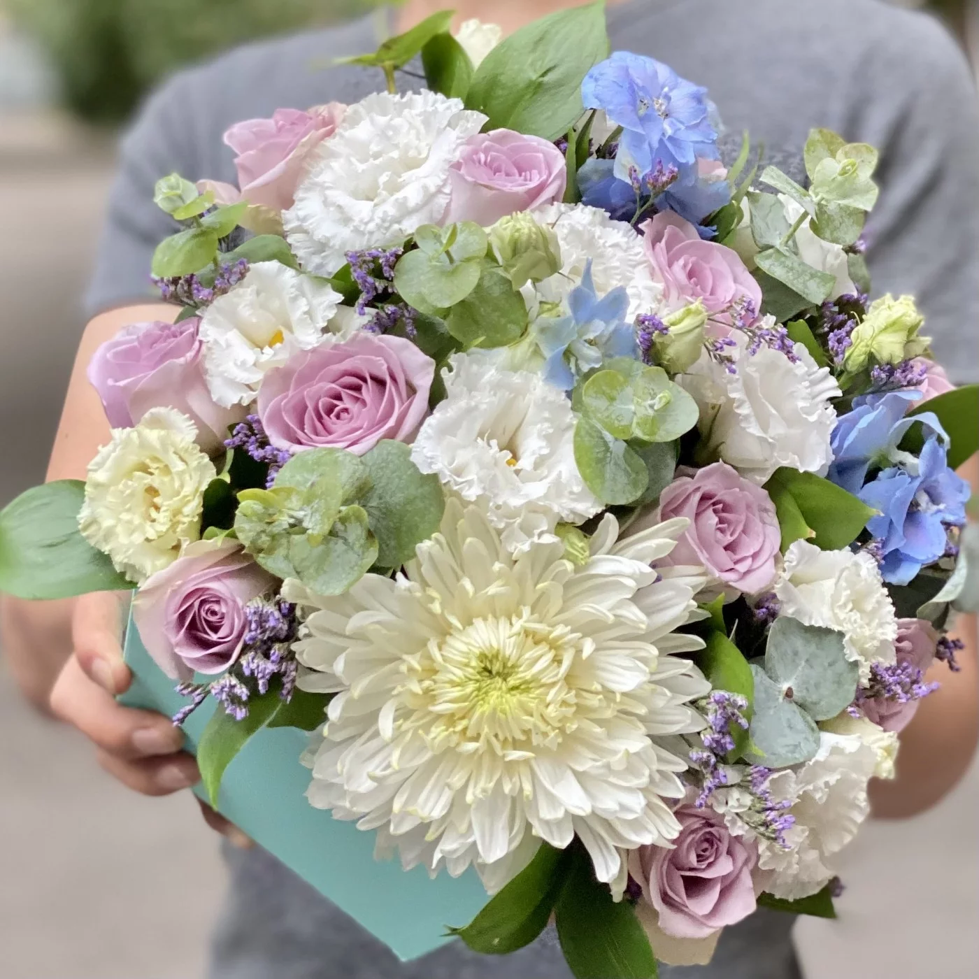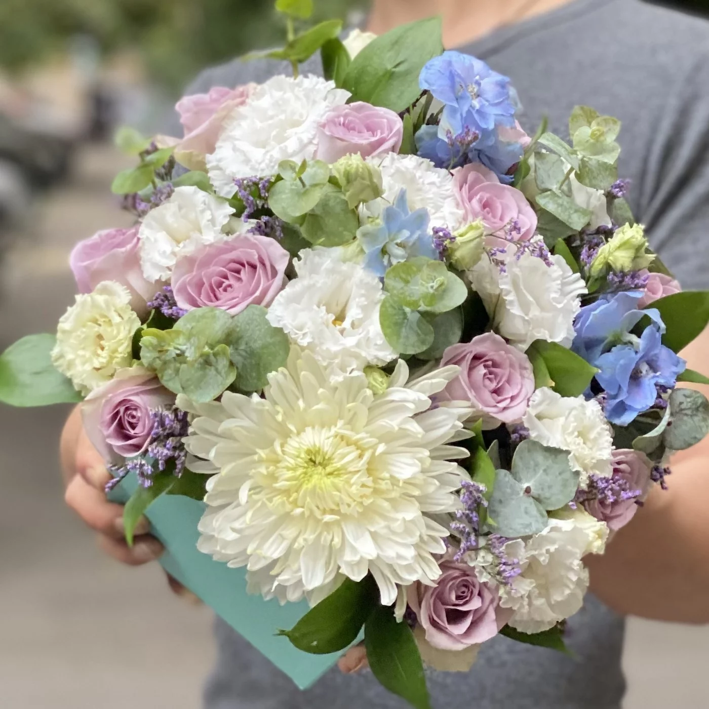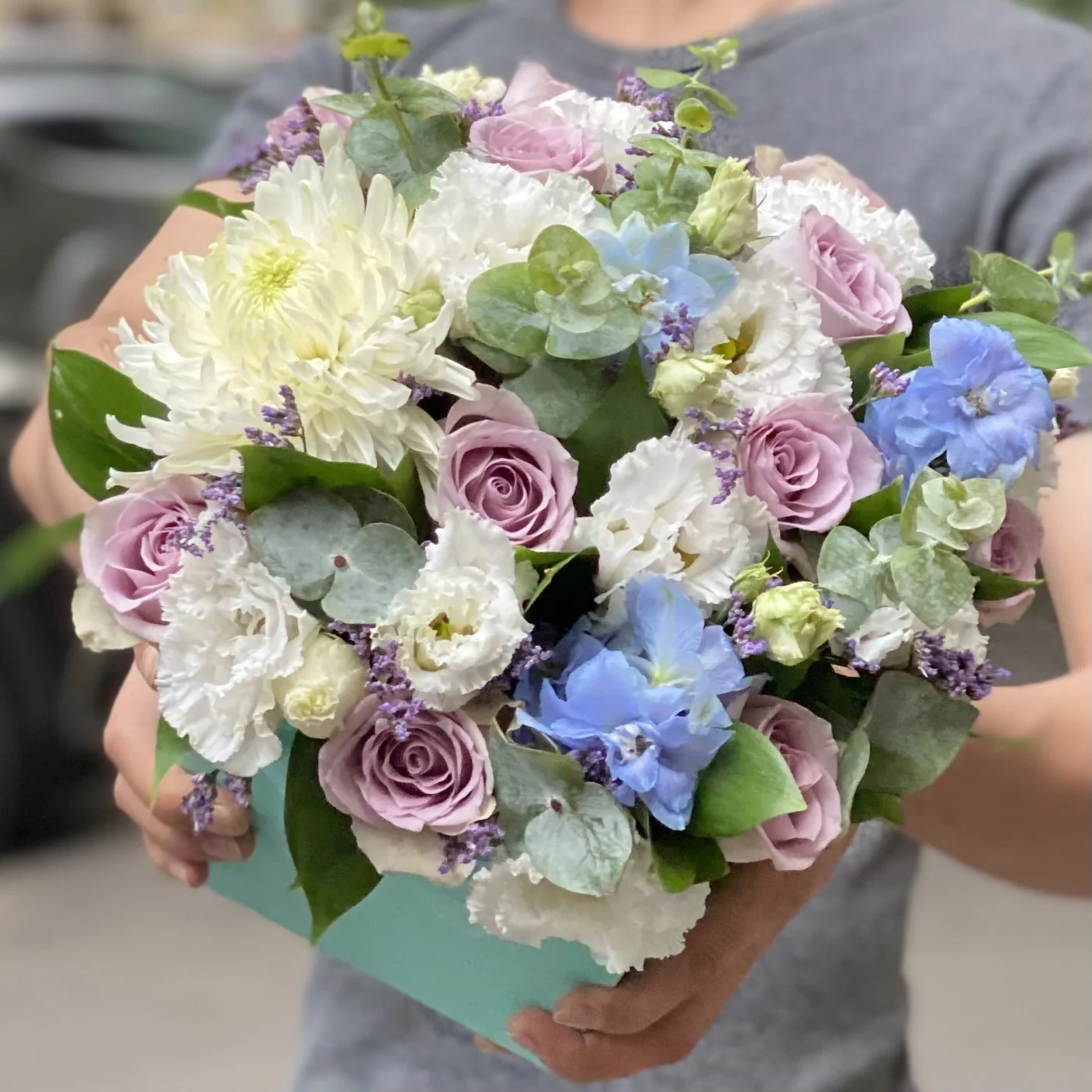 Композиция в коробке "Ласковый ветер". Светлая композиция будет гармонично смотреться как украшение стола, подарок на встречу, знак внимания или альтернатива чувственному комплименту.