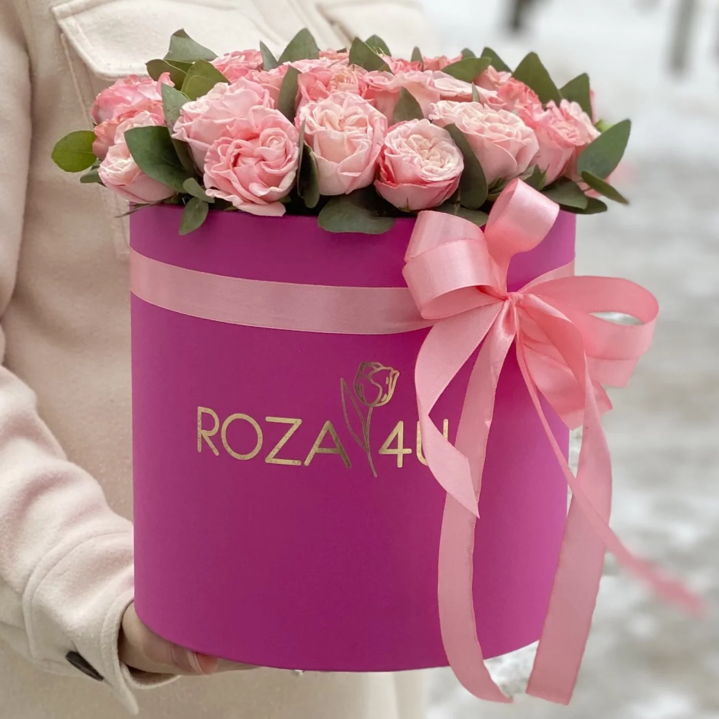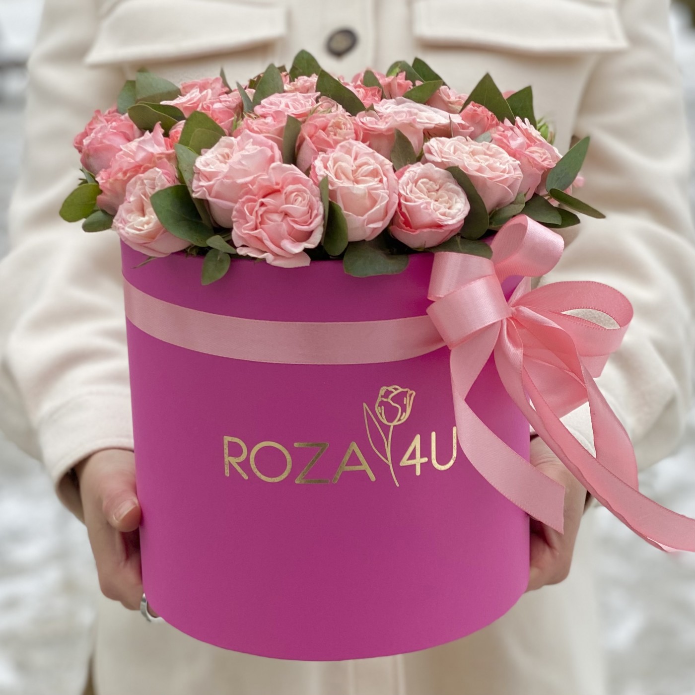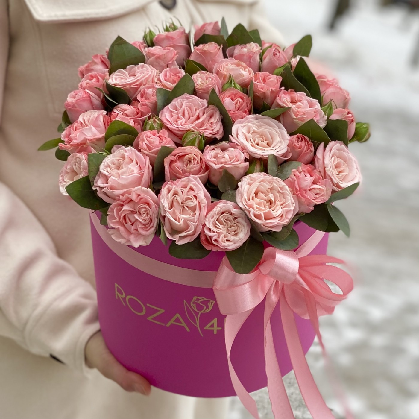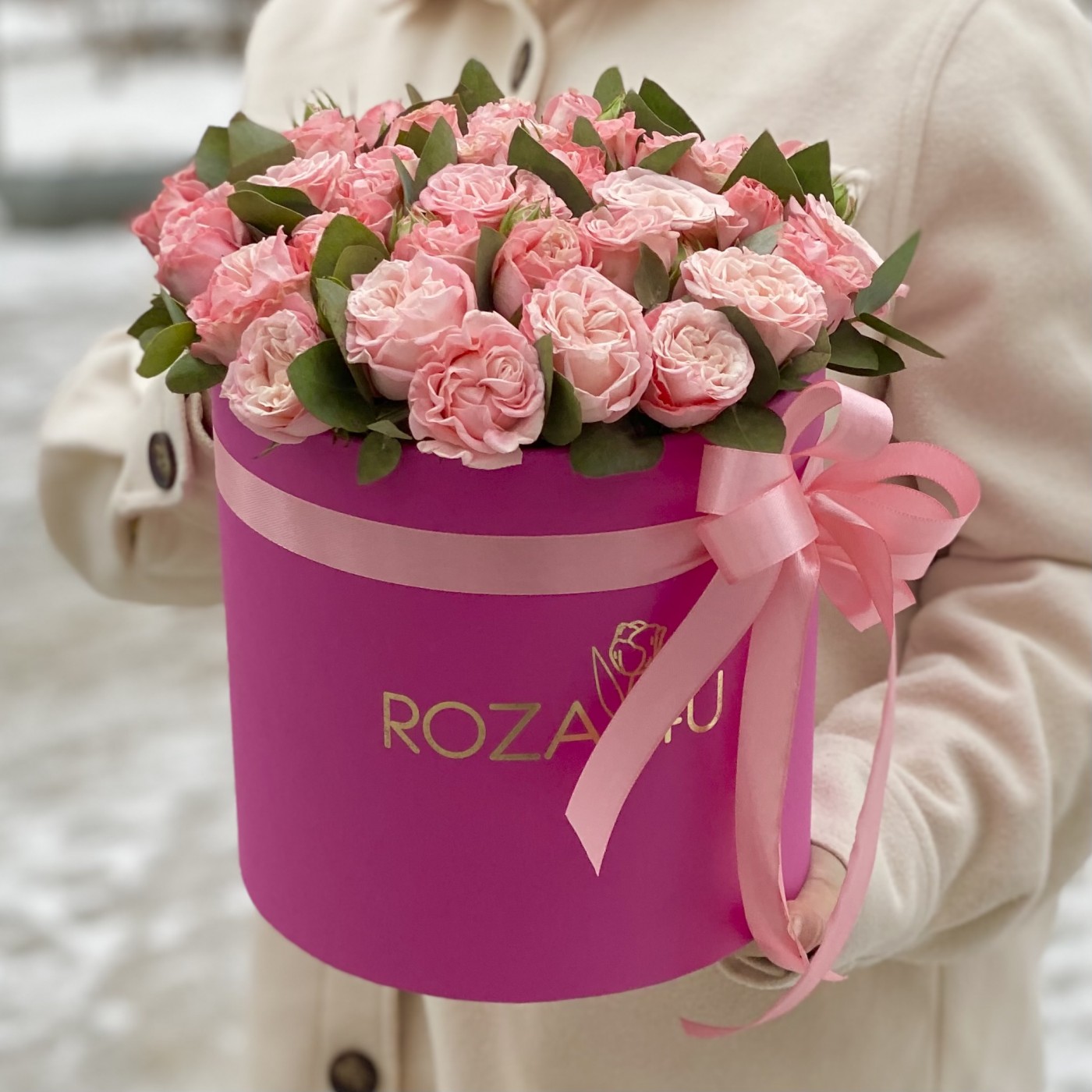 Игривый и самодостаточный букет из пионовидной кустовой розы сорта Мадам Бомбастик с веточками эвкалипта. Каждый элемент этой композиции находится на своём месте. В ней есть уникальная нежность и нет избытка детского очарования, присутствует взрослая деликатность и отсутствует чрезмерная сдержанность. А элегантная шляпная коробка эффектно дополняет всю флористическую композицию и избавляет от необходимости перемещения букета в отдельную вазу.