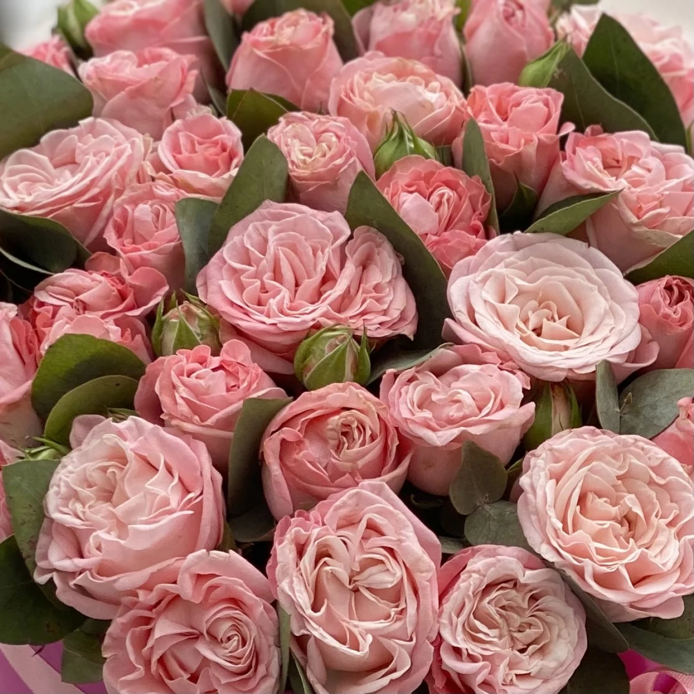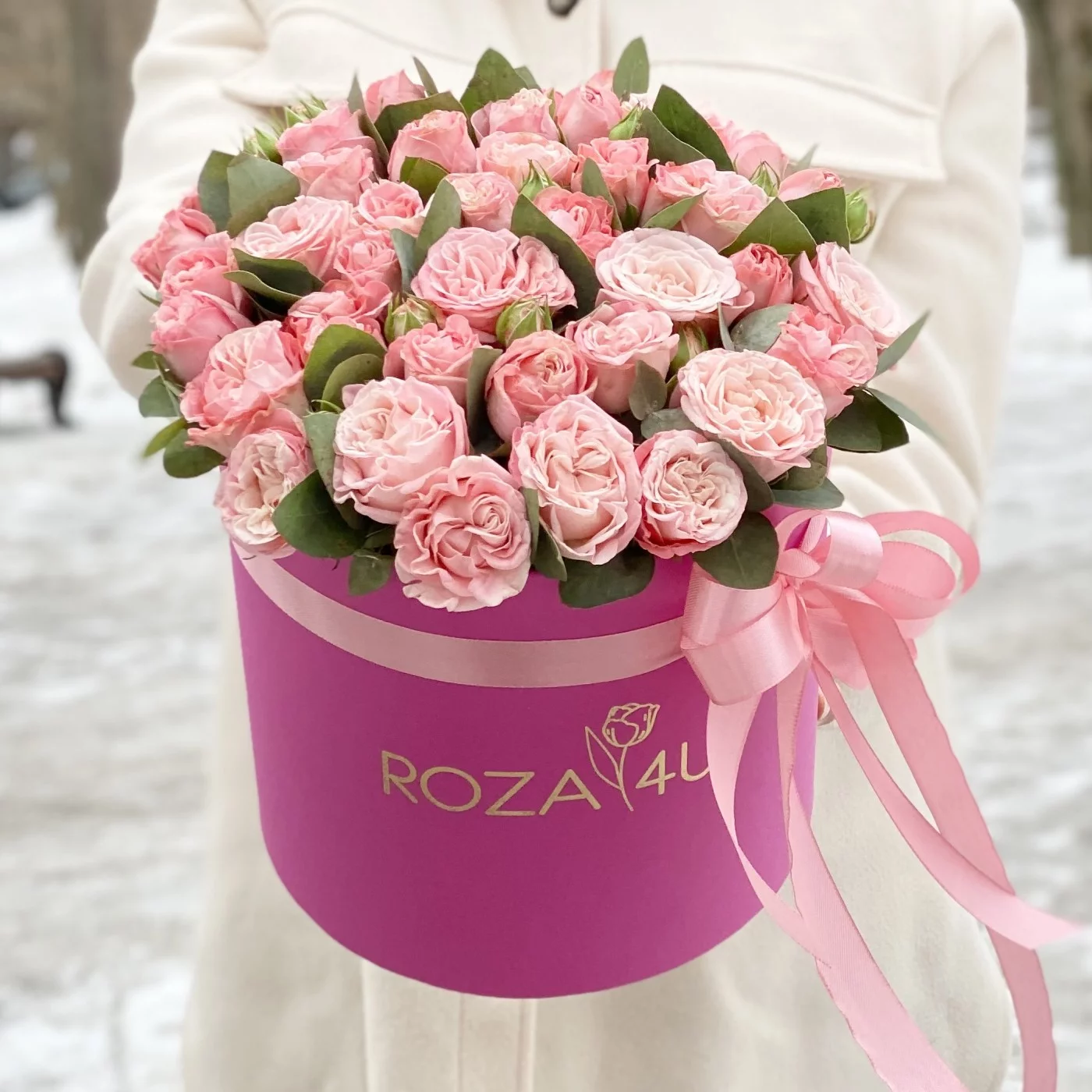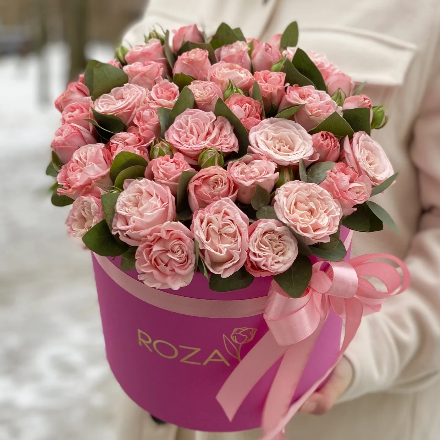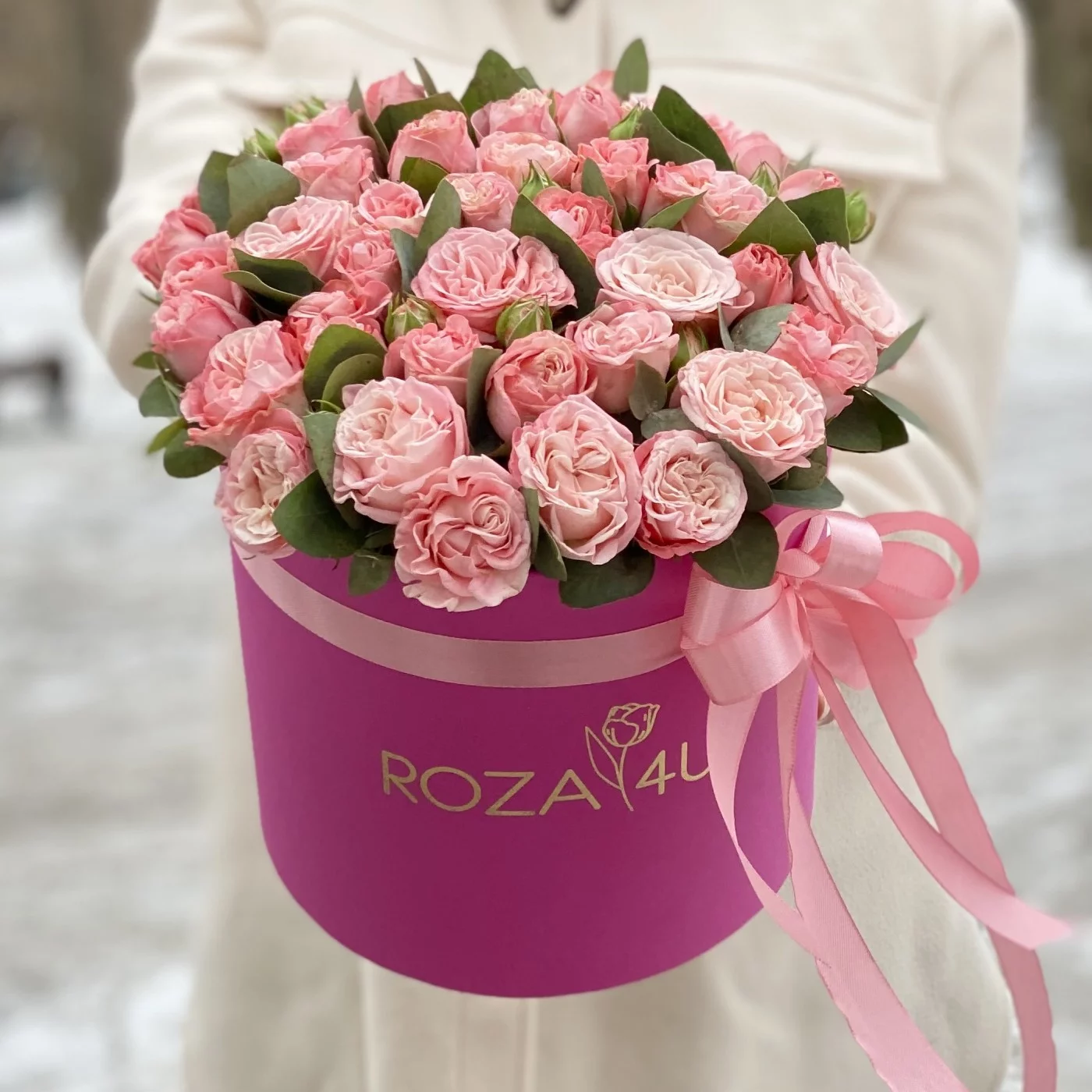Игривый и самодостаточный букет из пионовидной кустовой розы сорта Мадам Бомбастик с веточками эвкалипта. Каждый элемент этой композиции находится на своём месте. В ней есть уникальная нежность и нет избытка детского очарования, присутствует взрослая деликатность и отсутствует чрезмерная сдержанность. А элегантная шляпная коробка эффектно дополняет всю флористическую композицию и избавляет от необходимости перемещения букета в отдельную вазу.