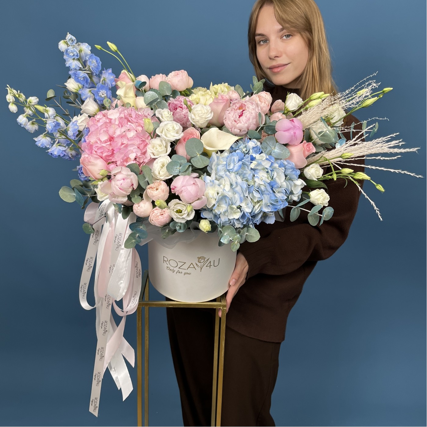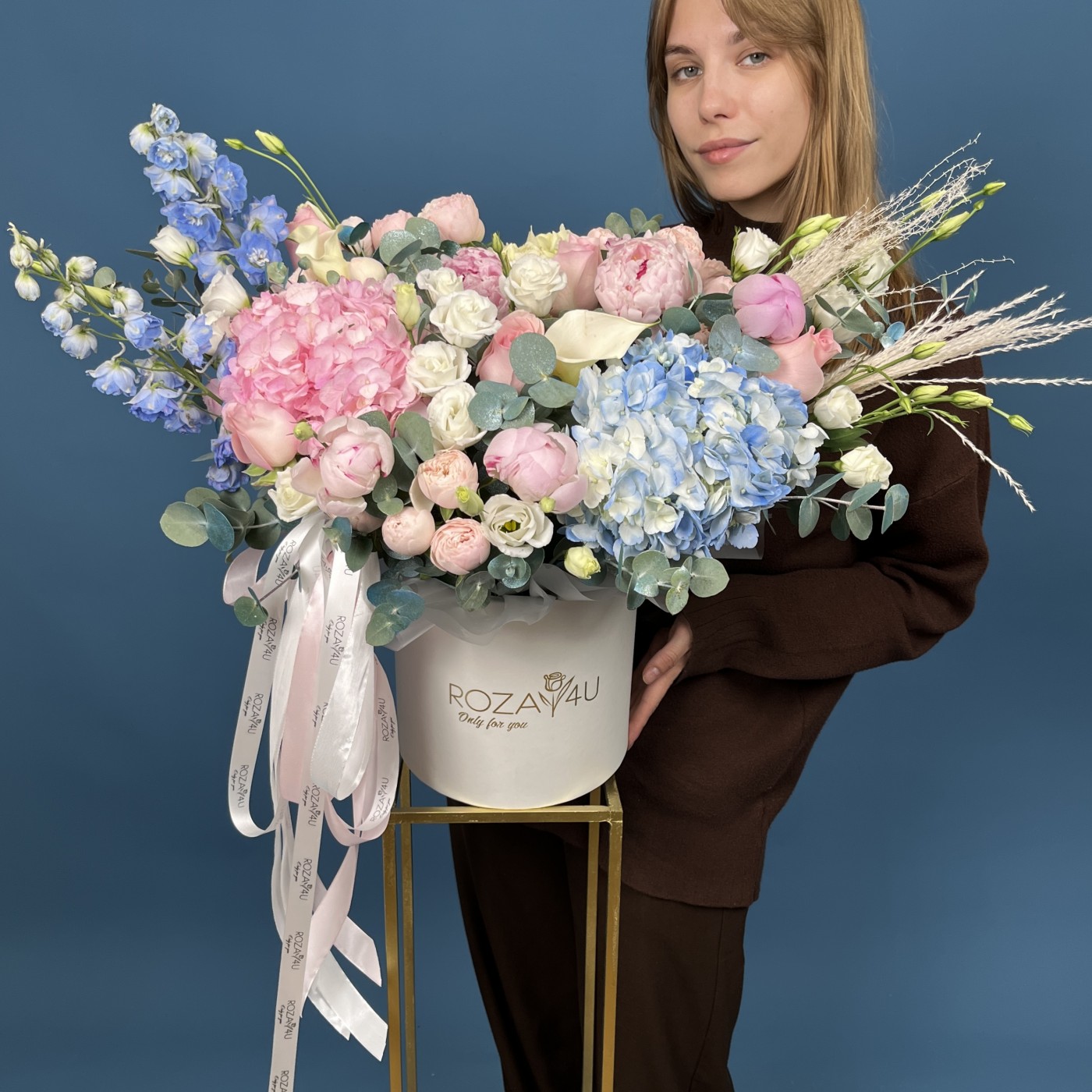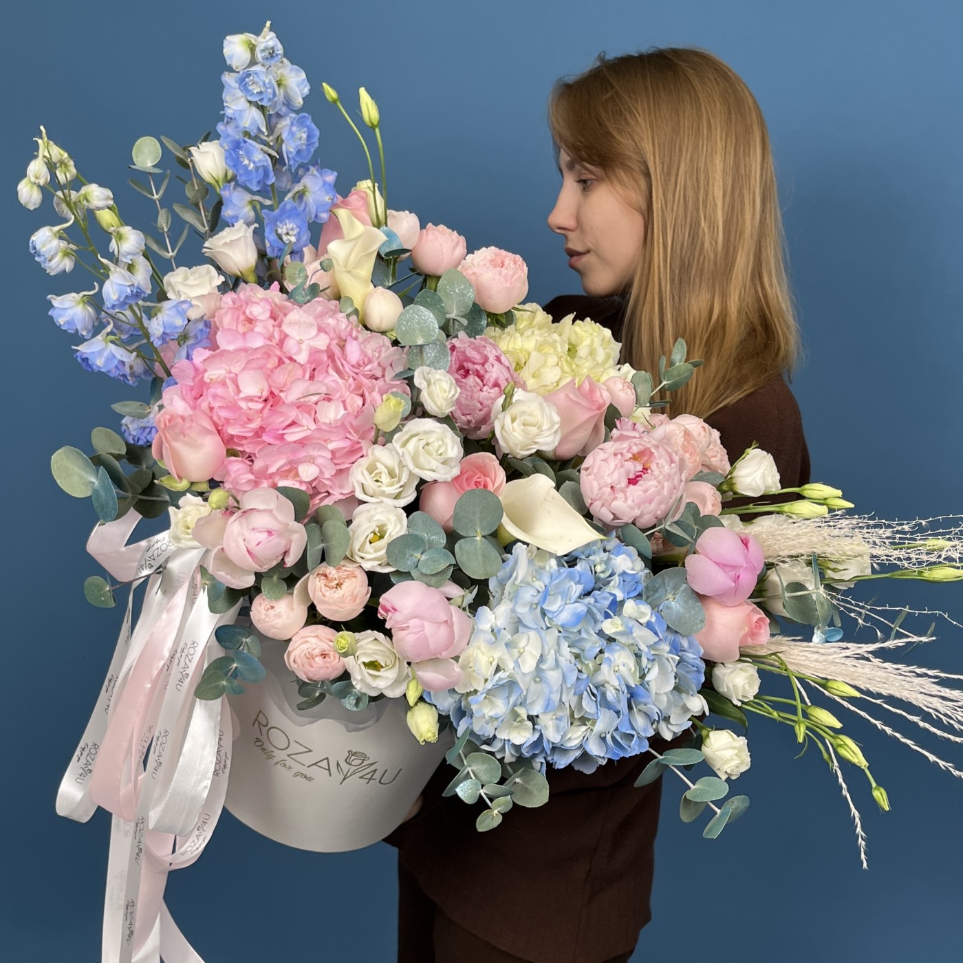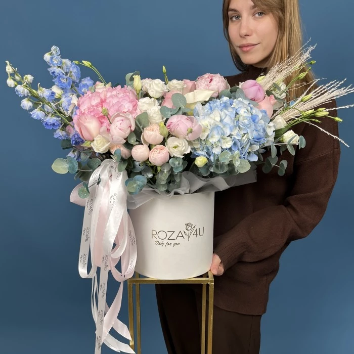 Нежная композиция в голубых и розовых оттенках – это воплощение элегантности и утонченности. Позвольте себе или своим близким насладиться этой красотой, которая привнесет в вашу жизнь нотку волшебства и гармонии.