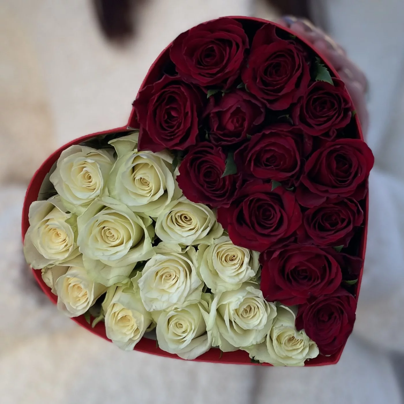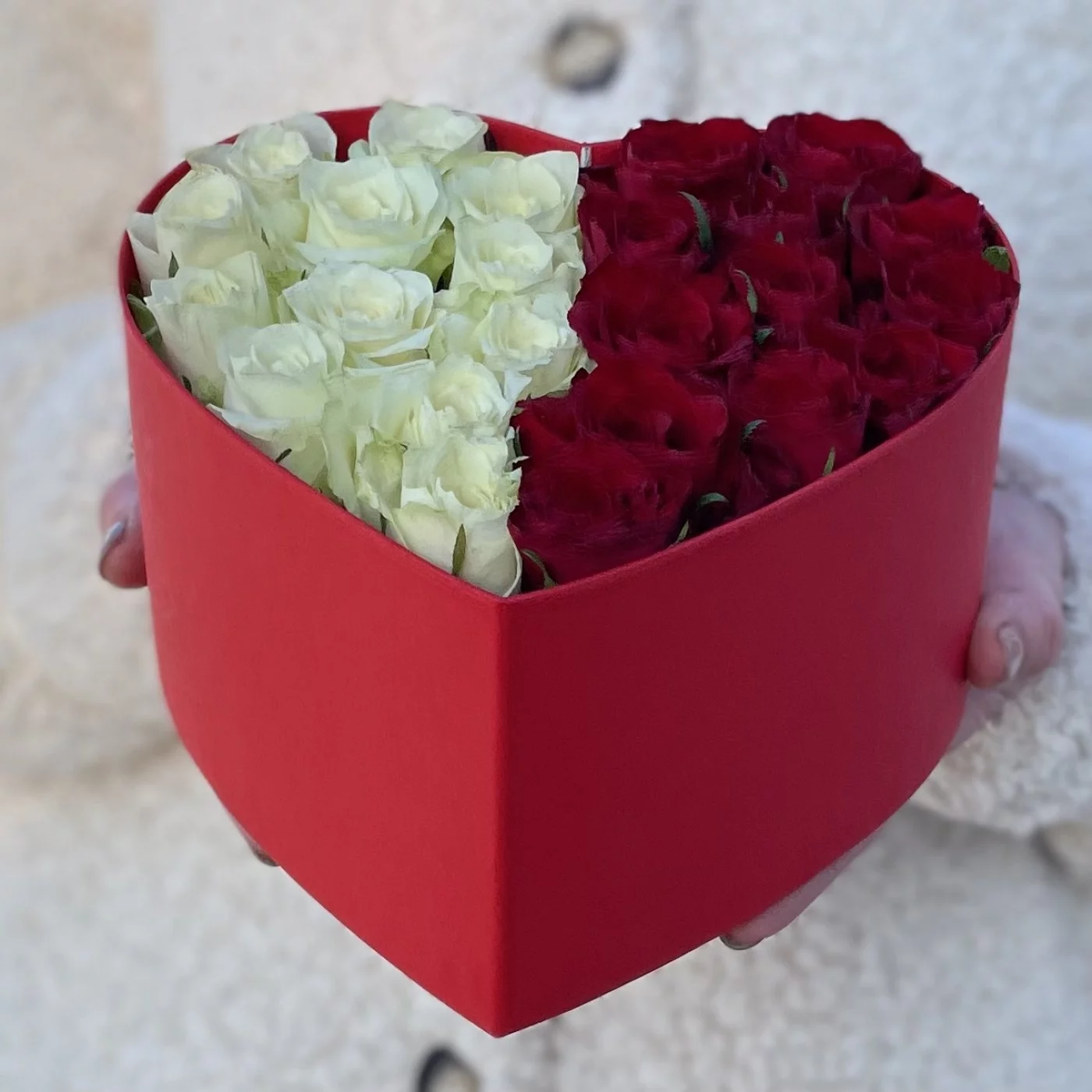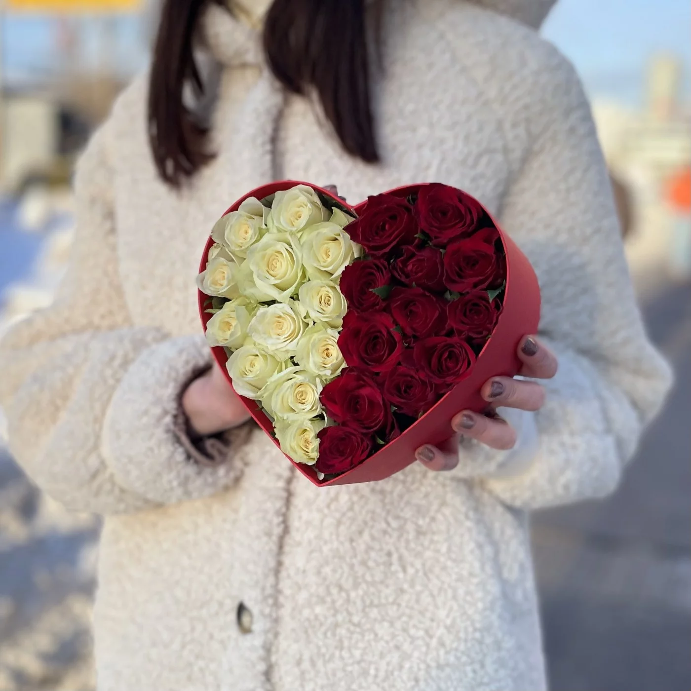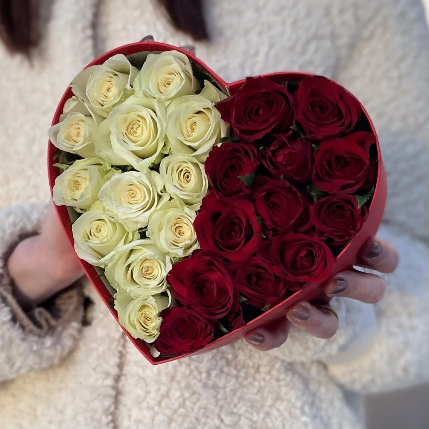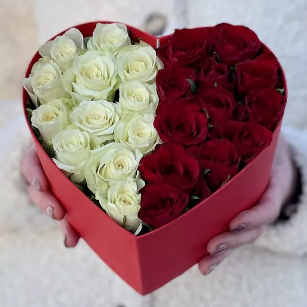 Маленькая коробка Сердце с красными и белыми розами подарит романтичное настроение.