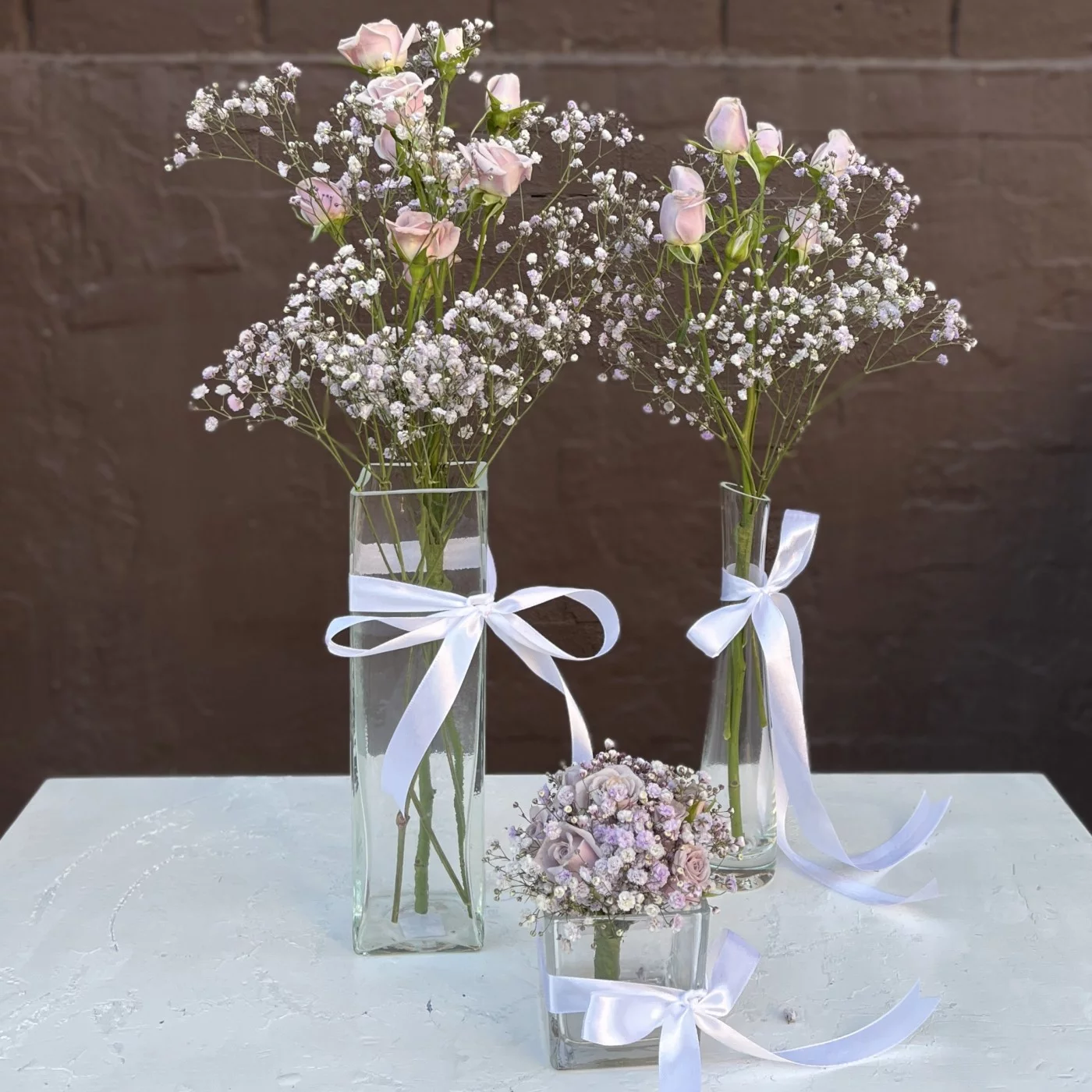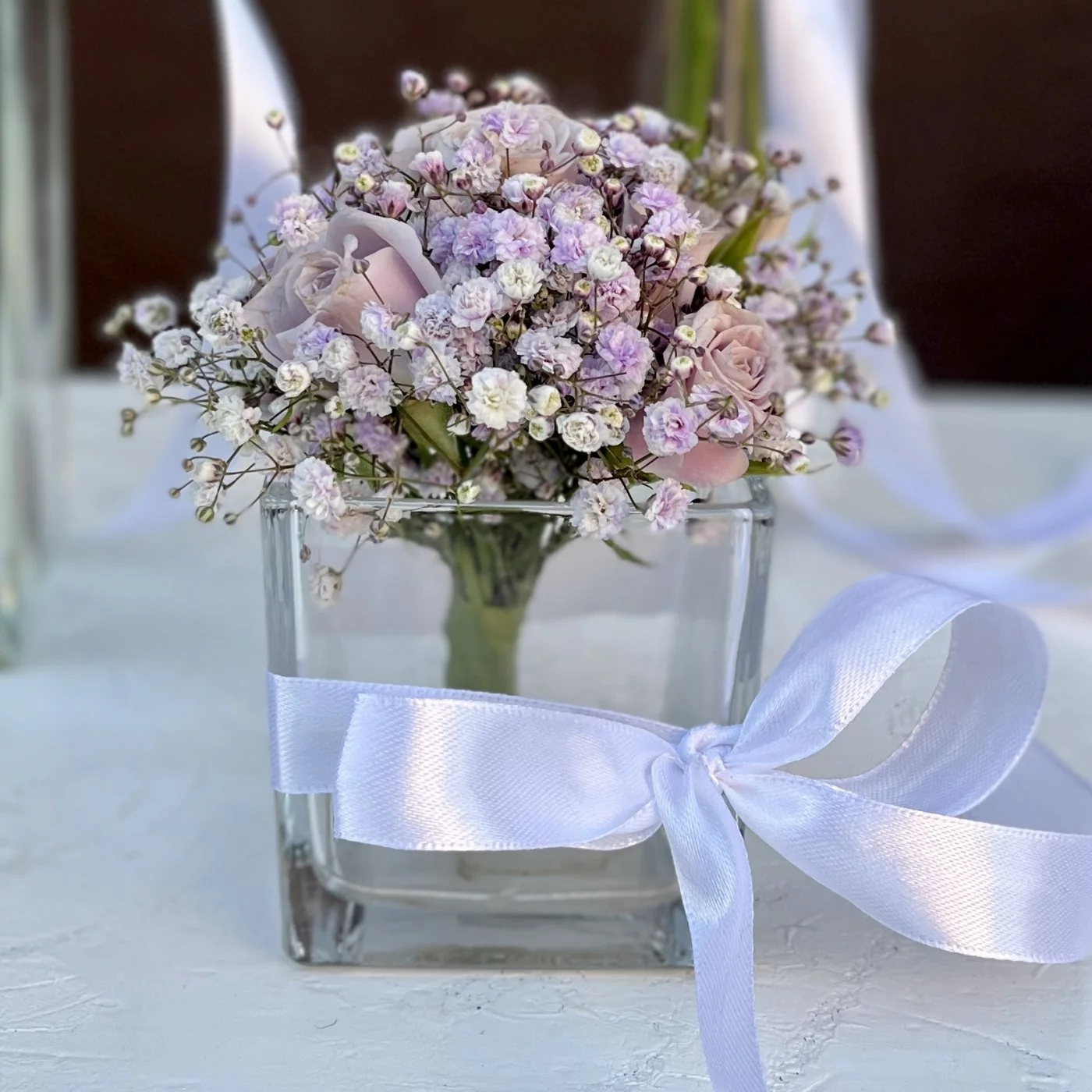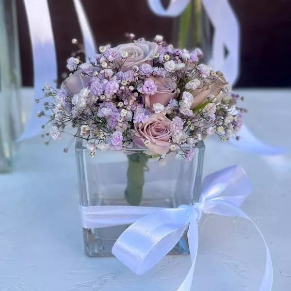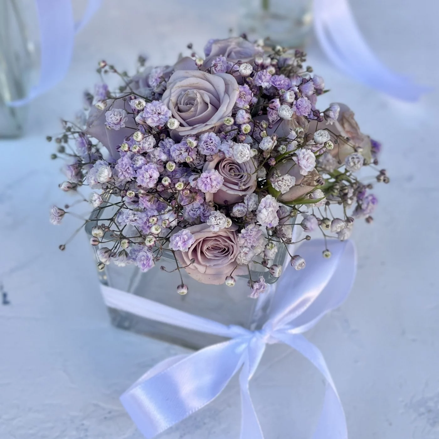 Настольная композиция для украшения праздничного стола жениха и невесты, в составе которой присутствуют сиреневые кустовые розы и гипсофила. Композиция прекрасно подойдет для оформления свадьбы и других мероприятий.