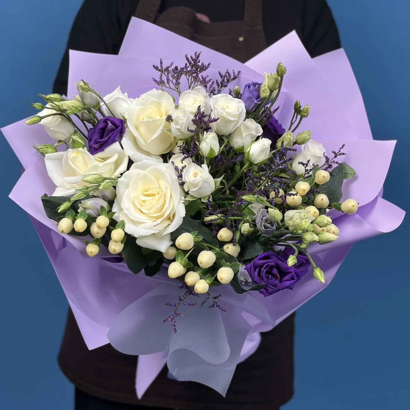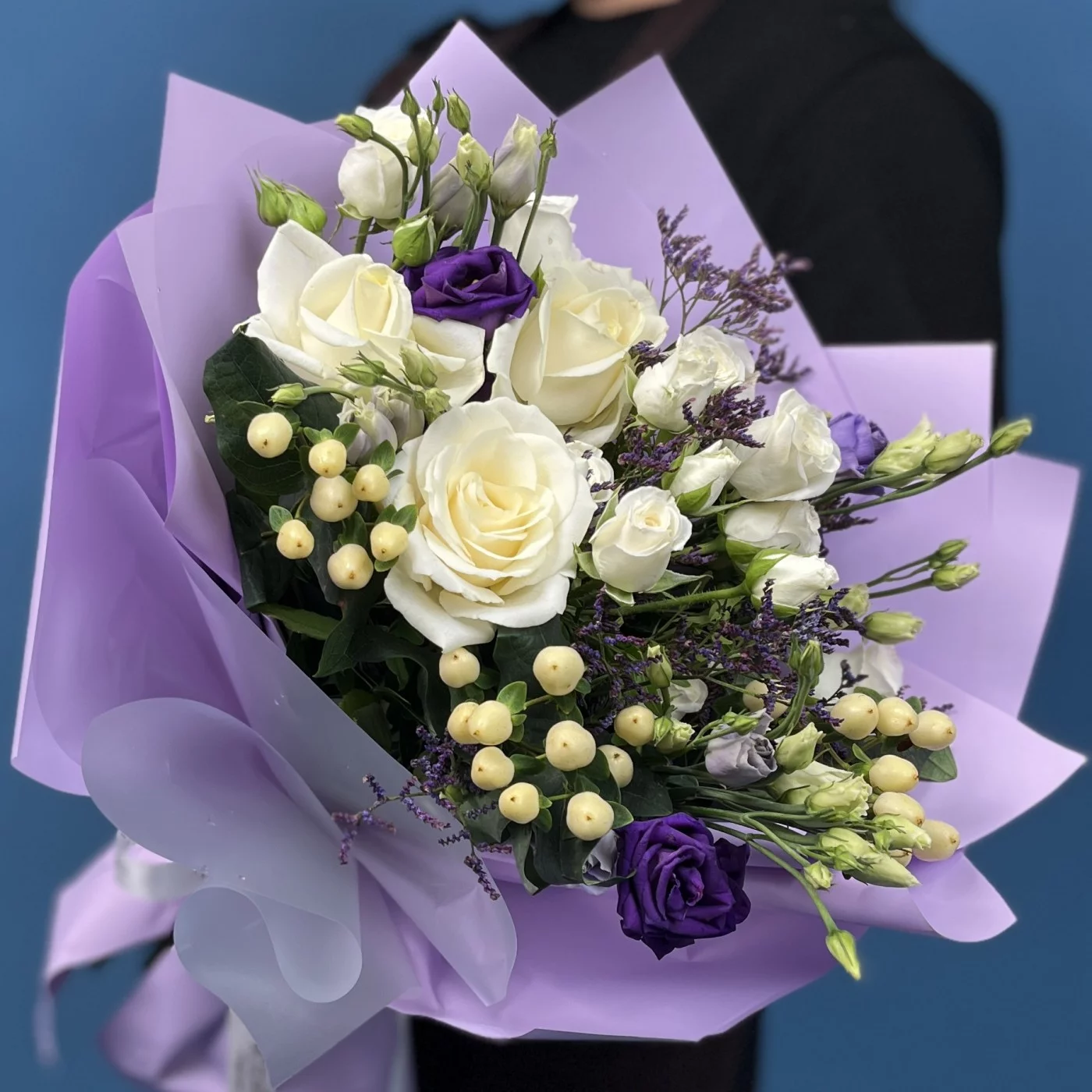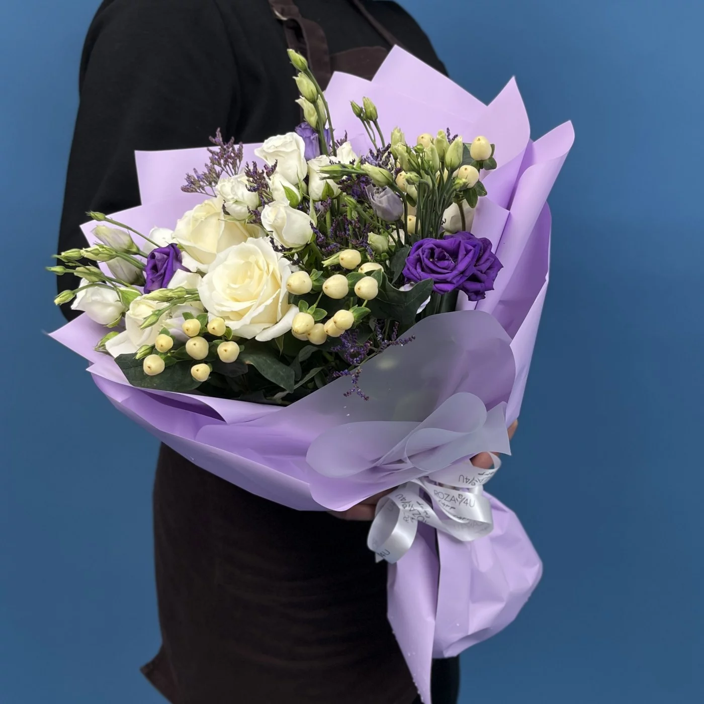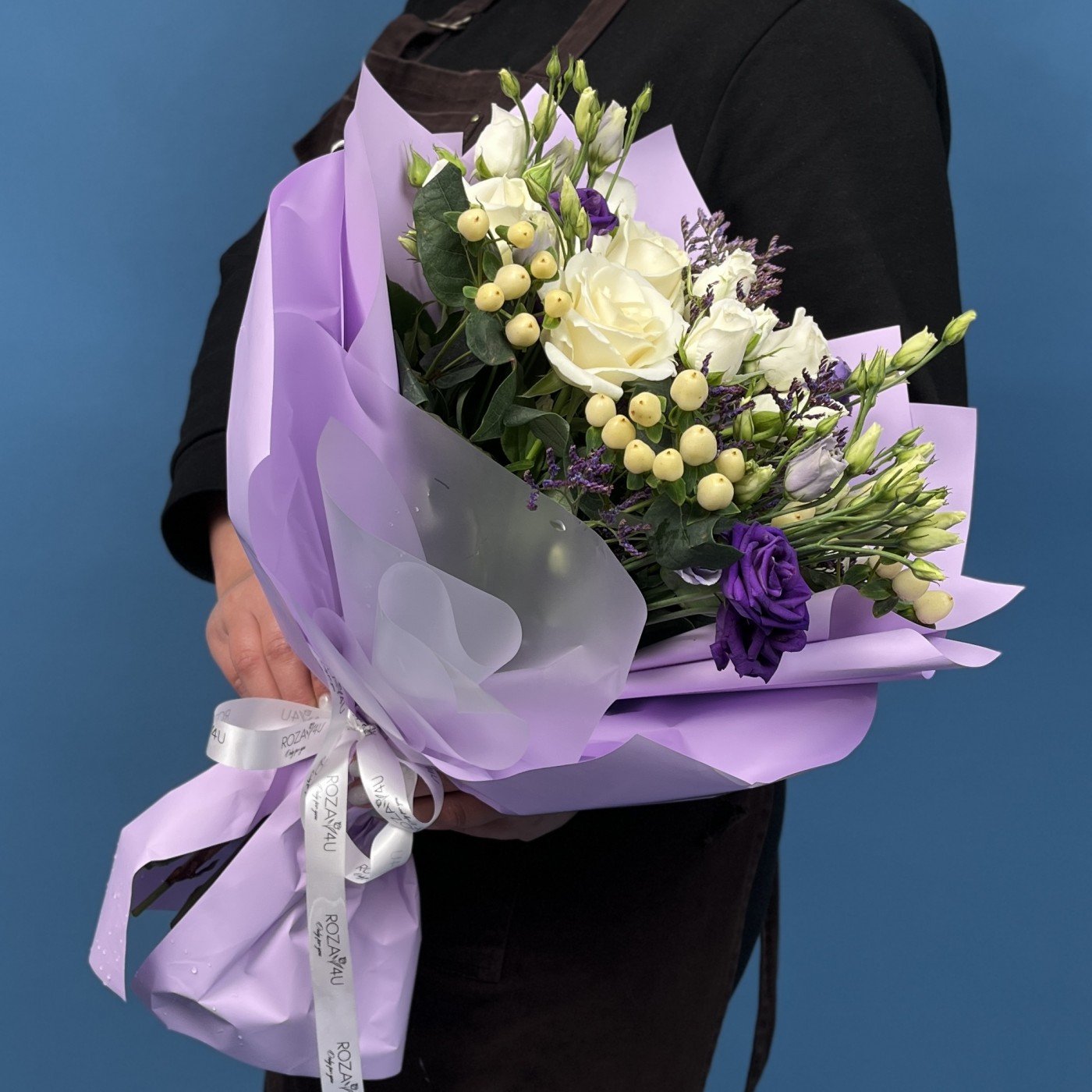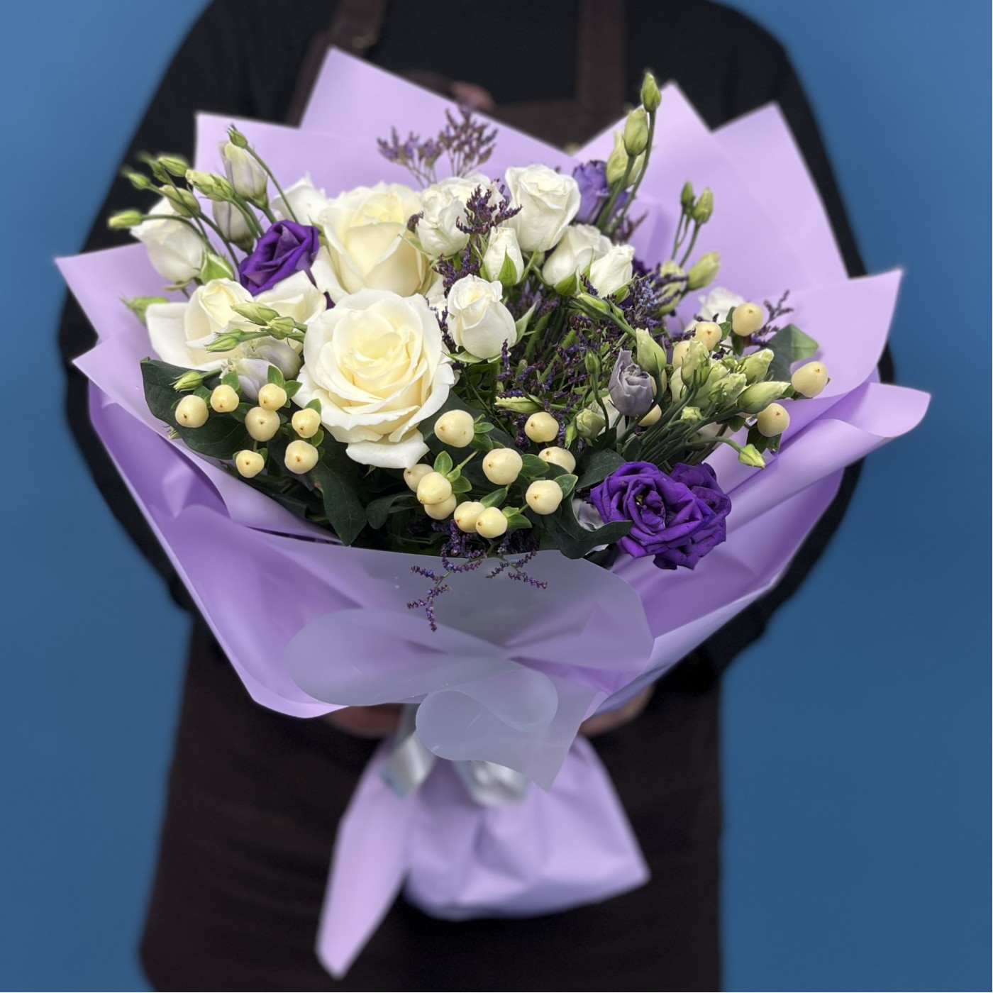 Этот изысканный цветочный ансамбль создан для того, чтобы подарить ощущение спокойствия, гармонии и восхищения. Сочетание глубоких фиолетовых оттенков и чистого белого цвета создает завораживающий контраст, который притягивает взгляд и наполняет пространство особой атмосферой.