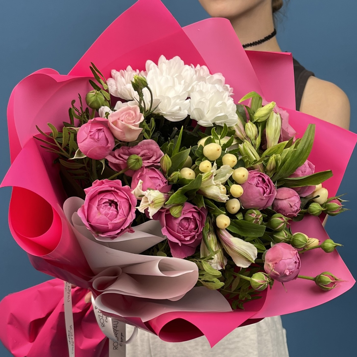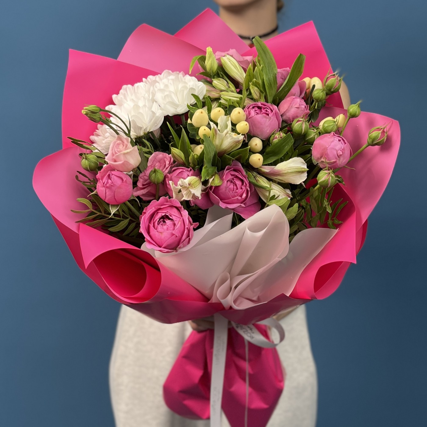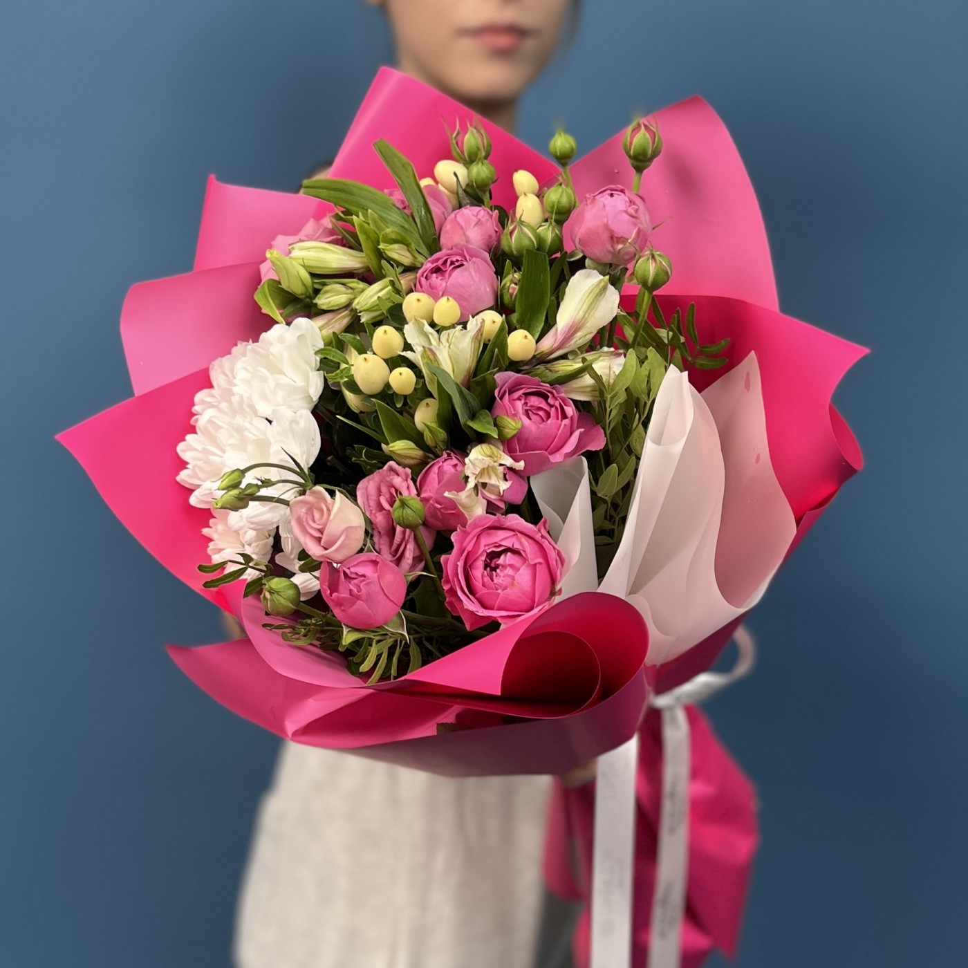 Этот восхитительный букет — ода нежности и красоты. В его составе собраны классические кустовые пионовидные розы, нежные эустомы и изящные хризантемы, создающие мягкую игривость и элегантность. Такой ансамбль дарит ощущение праздника, тепла и романтики, прекрасно дополняя любой интерьер или становясь особенным подарком для любимого человека.