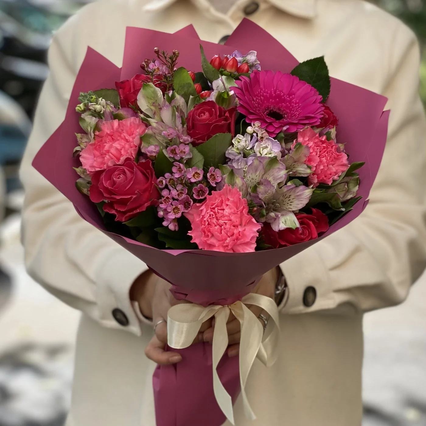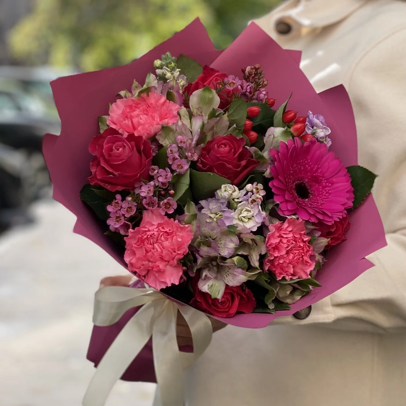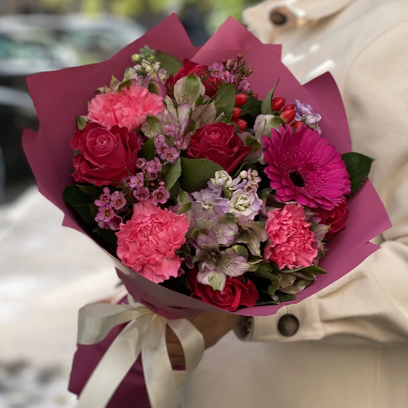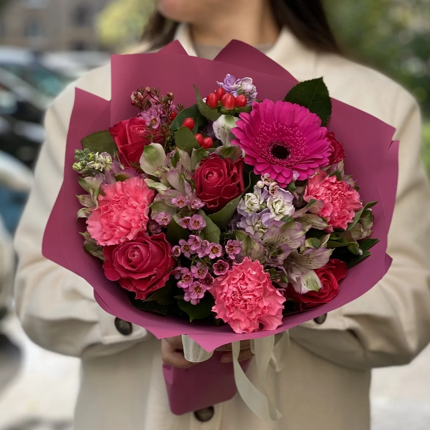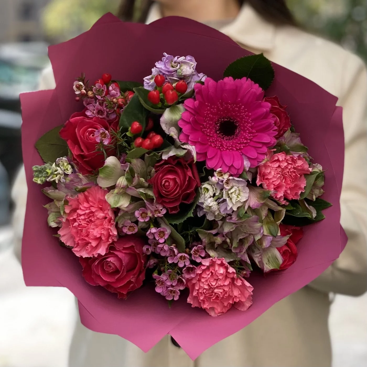 Букет с малиновыми розами, маттиолами и яркими гермини в упаковке под тон. Превосходно подходит в качестве комплимента, дополнения к подарку или как самостоятельный презент.