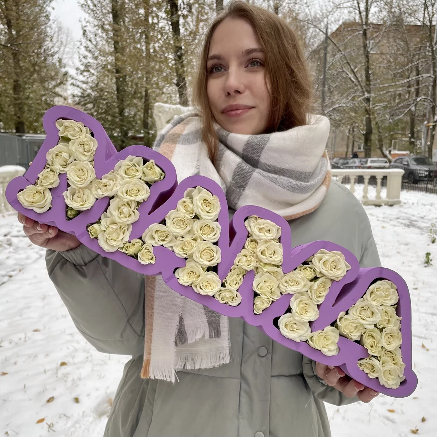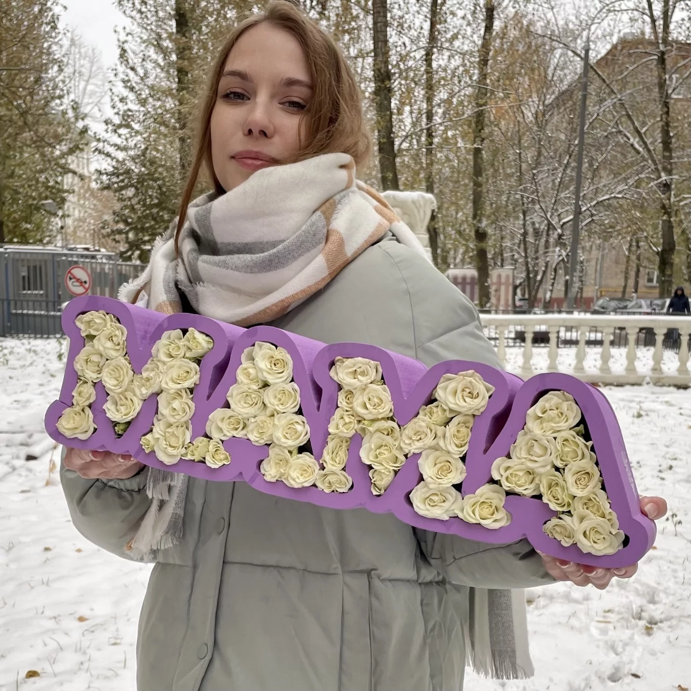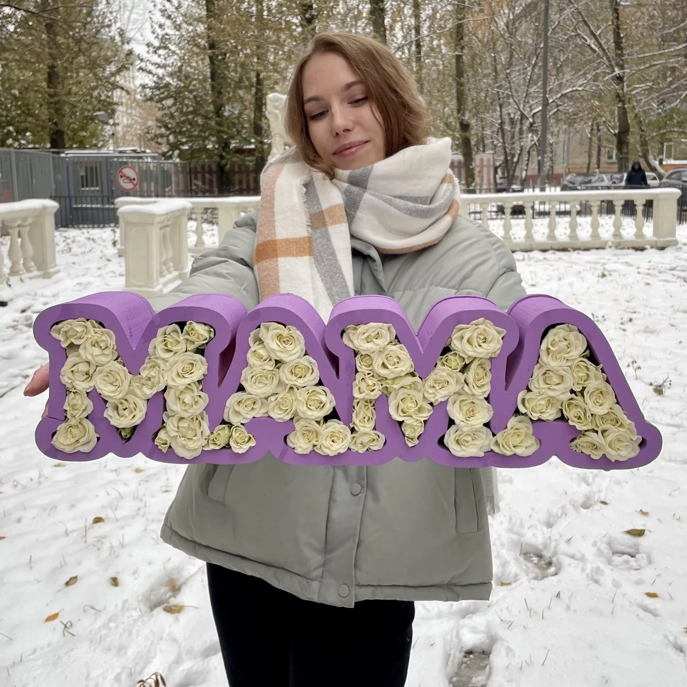 Коробка в виде надписи Мама с кустовыми розами сорта Сноуфлейк , станет очень красивым и приятным подарком для вашей мамочки. Композицию очень актуально подарить на день матери или день рождение.