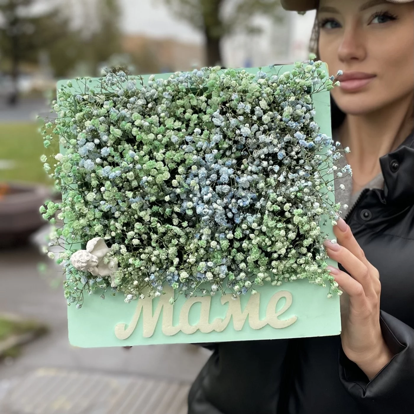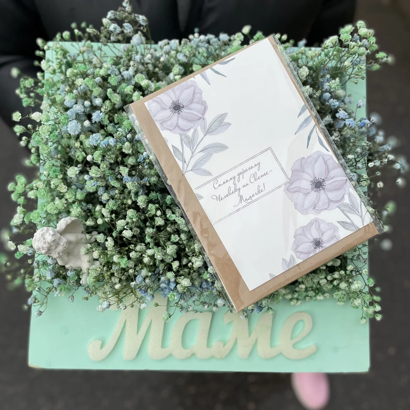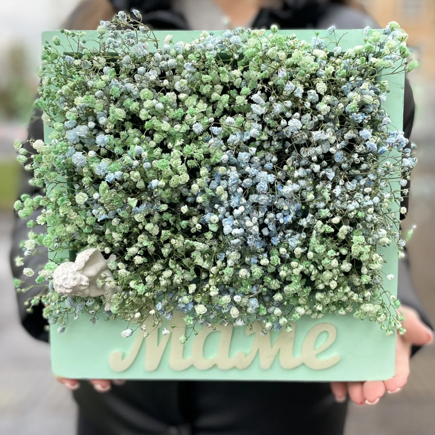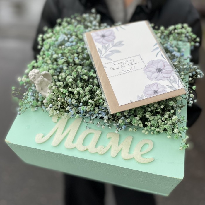 Коробка Мама с гипсофилой и ангелочком, станет очень красивым и приятным подарком для вашей мамочки. Композицию очень актуально подарить на день матери или день рождение.