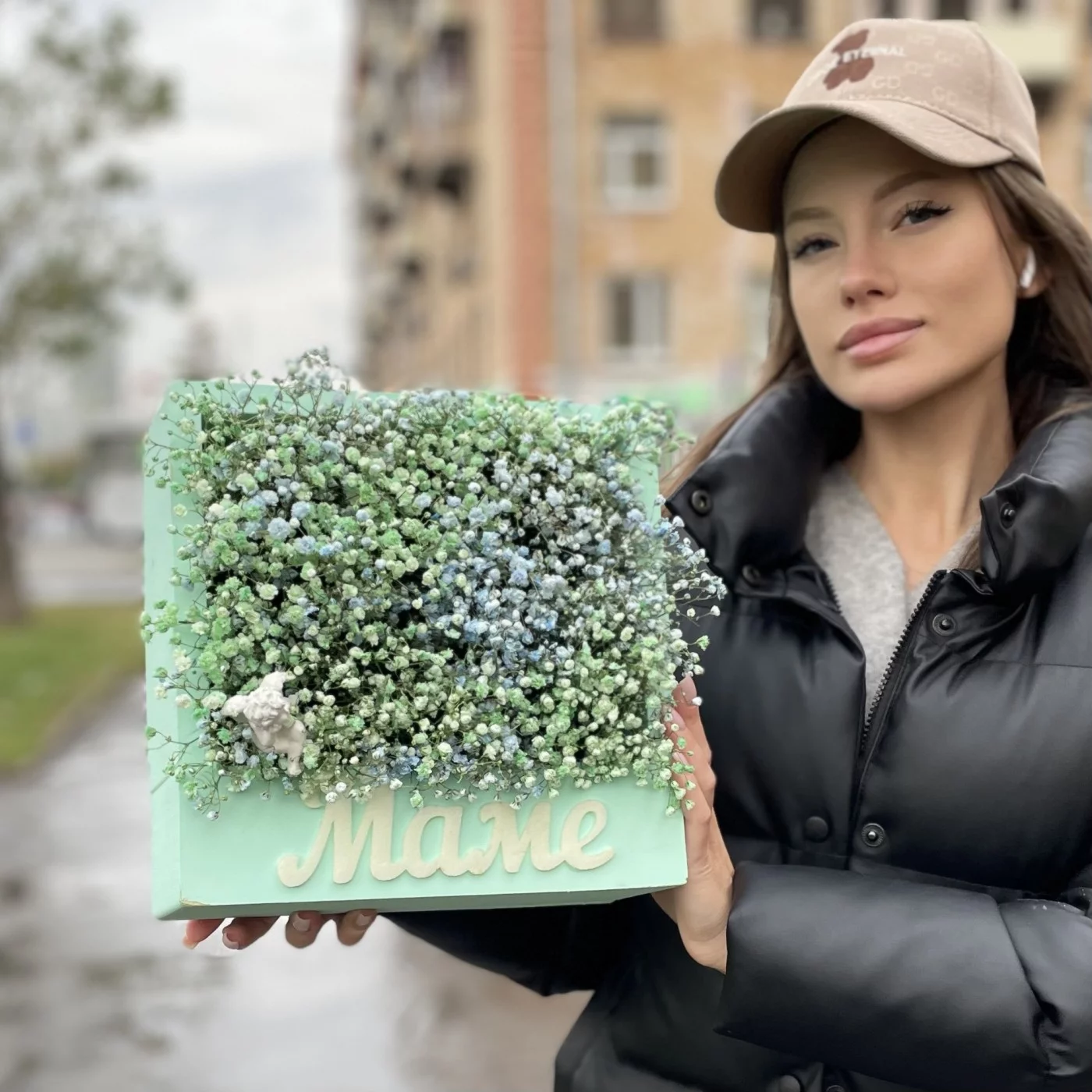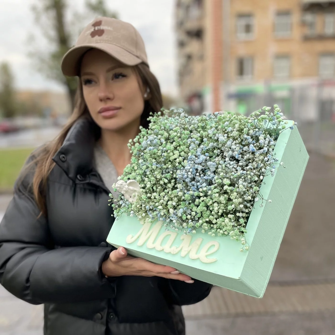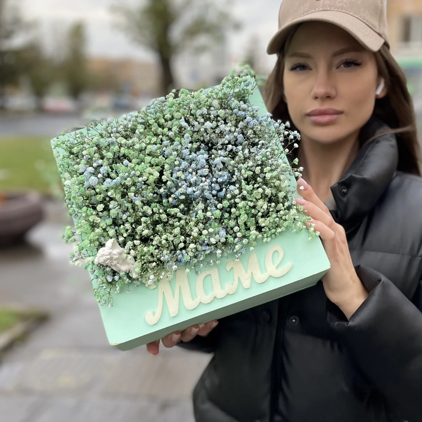 Коробка Мама с гипсофилой и ангелочком, станет очень красивым и приятным подарком для вашей мамочки. Композицию очень актуально подарить на день матери или день рождение.