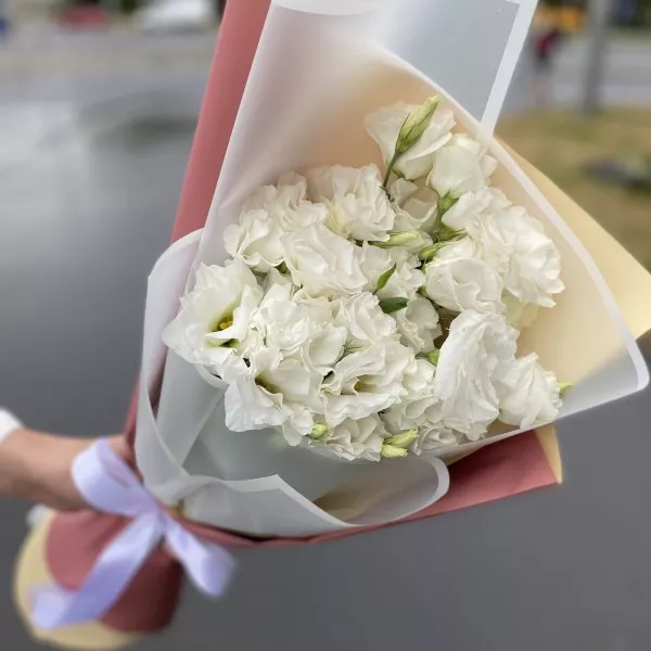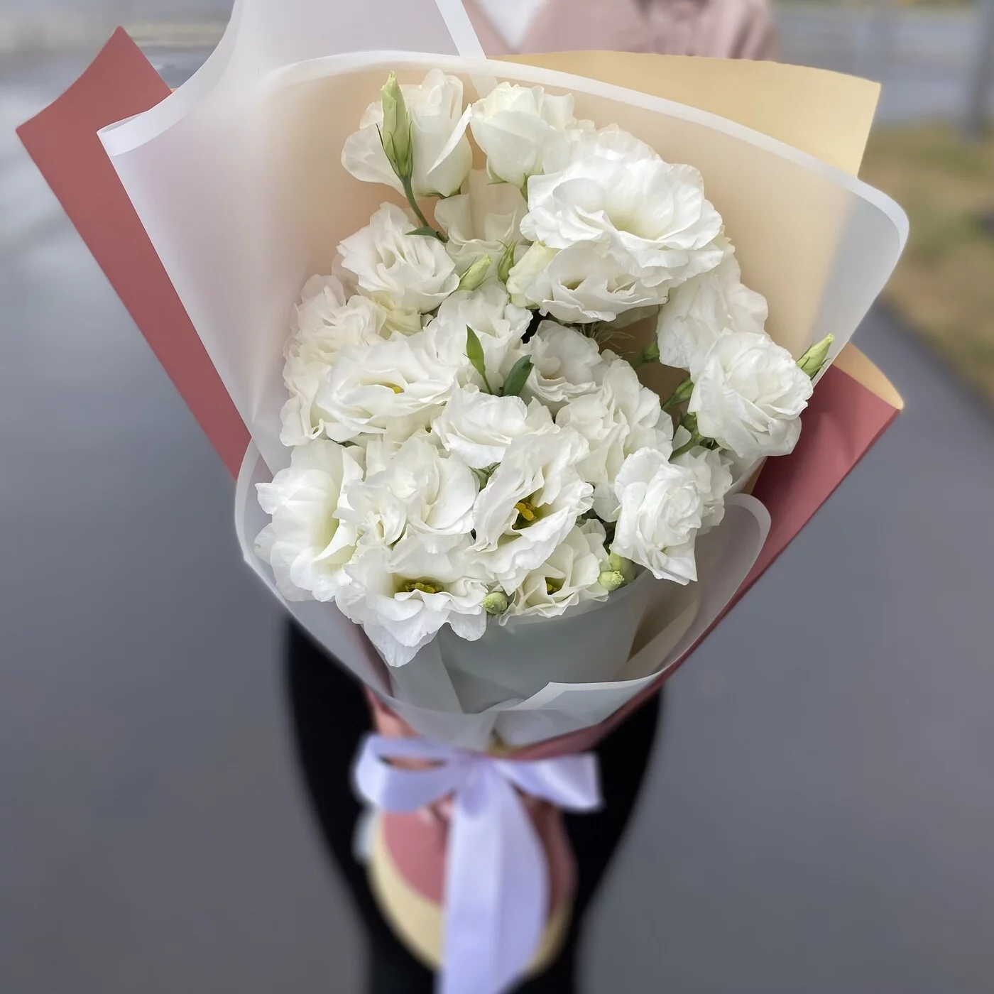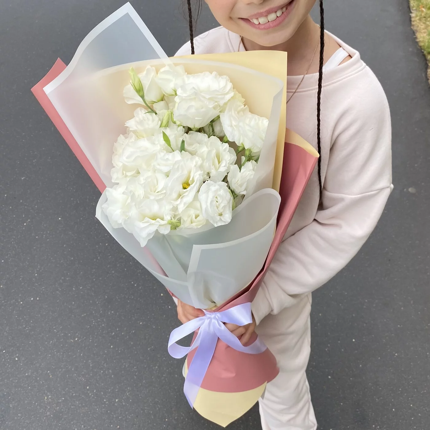 Нежный и стойкий букет из белых эустом в стильной упаковке. Такой букет универсальный и подойдет в качестве презента для любимого человека. Еще его можно взять первоклашке, выпускнику для подарка учителю или воспитателю. Букет очень легкий поэтому его сможет торжественно нести даже выпускник детского садика.