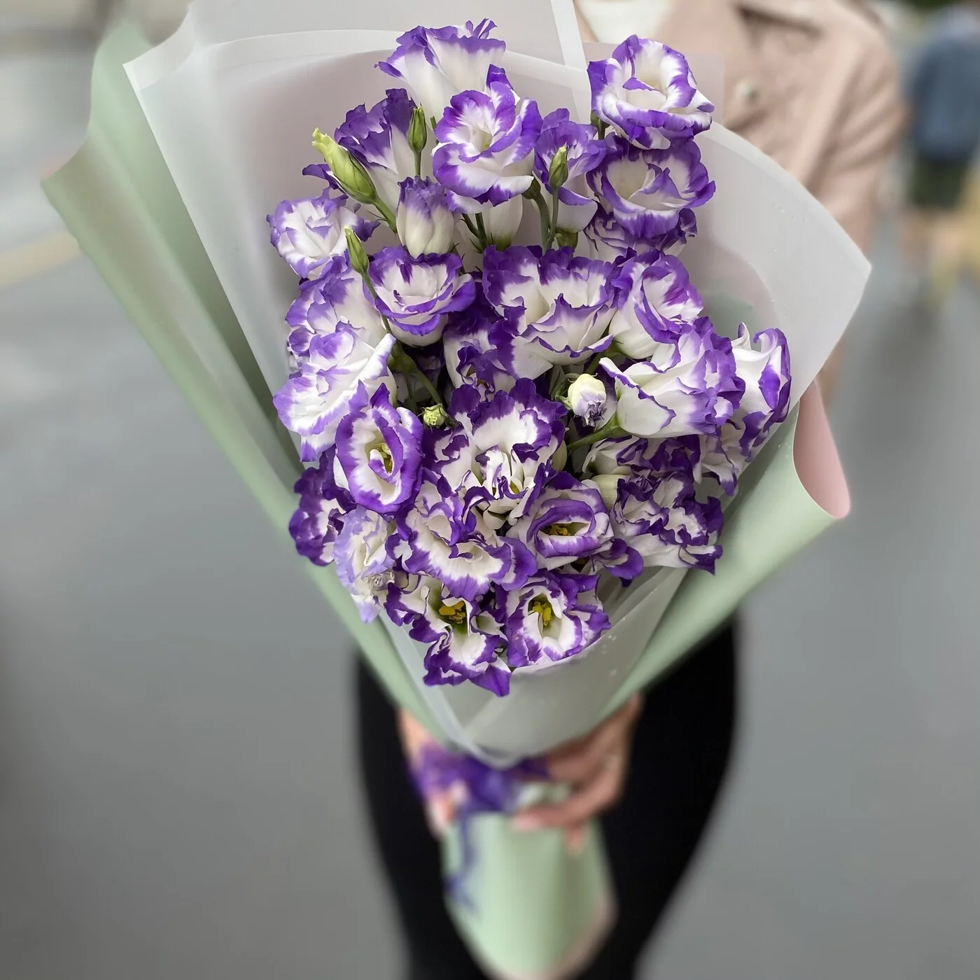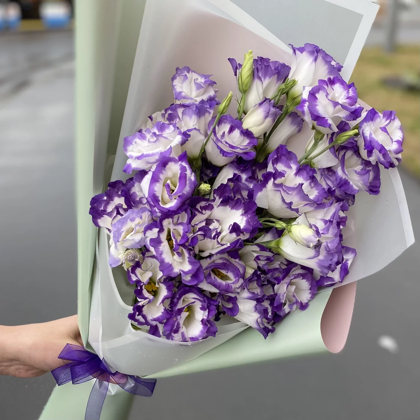 Радостный и красивый букет из бело фиолетовых эустом в стильной упаковке. Такой букет универсальный и подойдет в качестве презента для любимого человека. Еще его можно взять первоклашке, выпускнику для подарка учителю или воспитателю. Букет очень легкий поэтому его сможет торжественно нести даже выпускник детского садика.