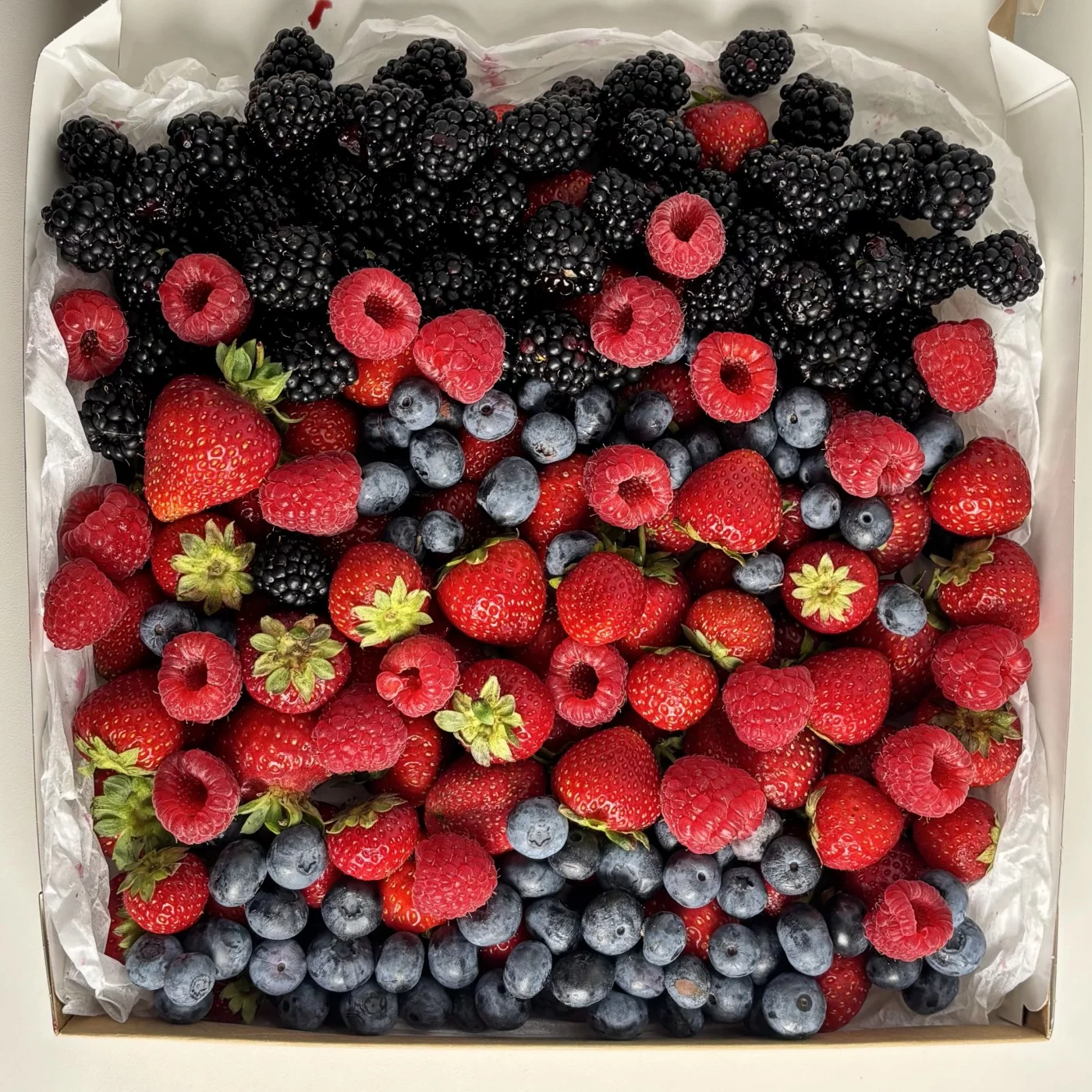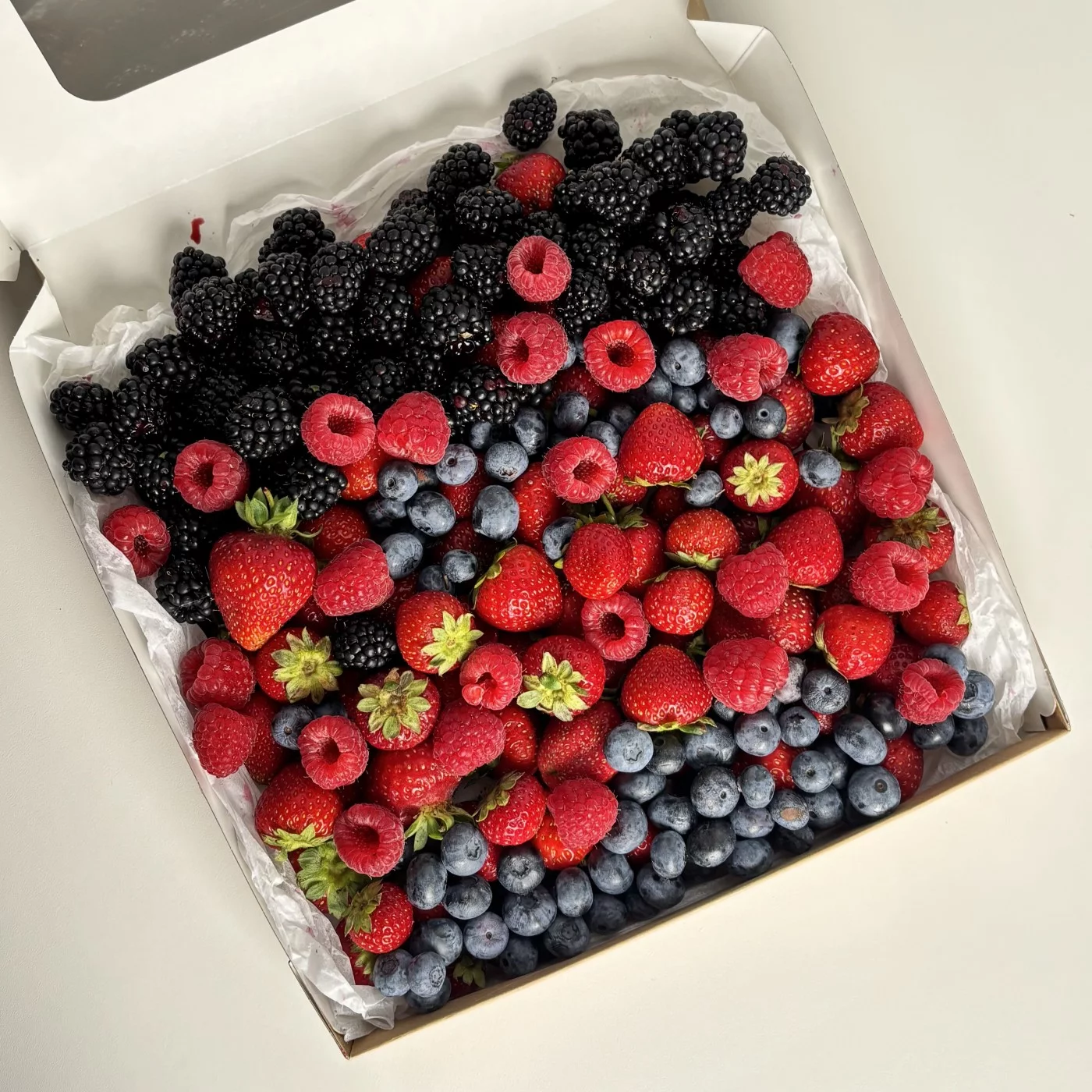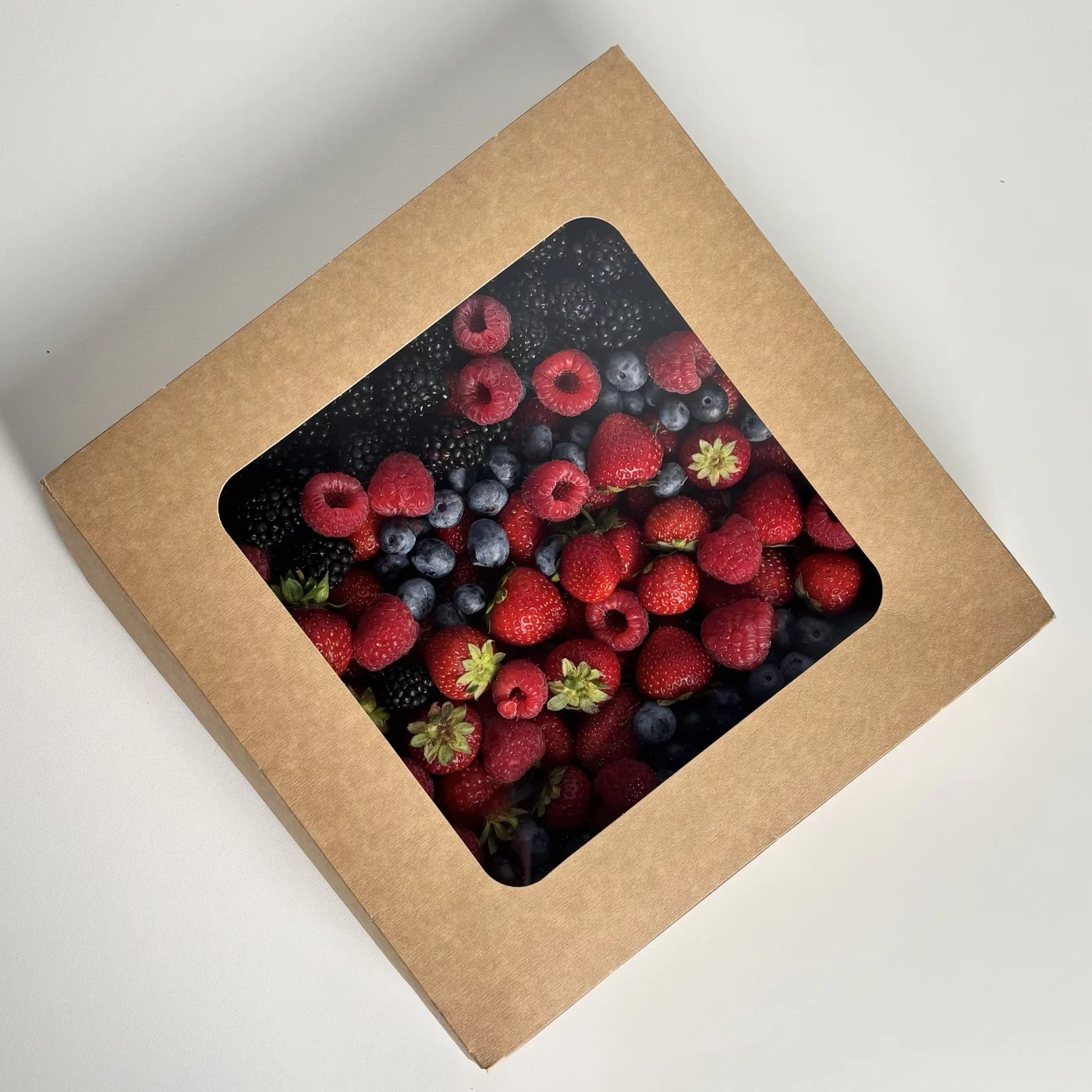 125грБольшая коробка 26/26 см с ягодами клубники, голубики, ежевики и малины. Супер подарок на любой праздник.