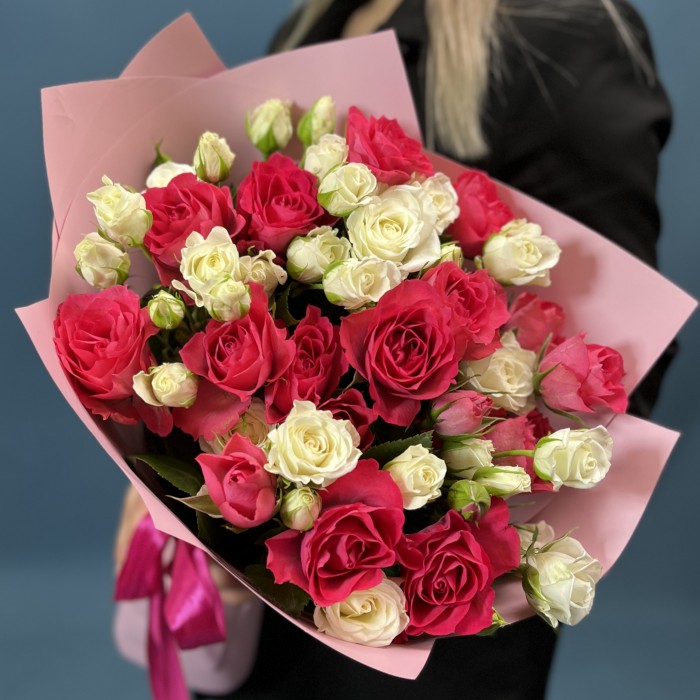 Микс из 11 малиновых и белых кустовых роз — это изысканный и романтичный букет, который отлично подойдет для подарка, особого случая или украшения интерьера. Такой микс создает красивый контраст и гармонию между яркими малиновыми оттенками и чистотой белых роз.
