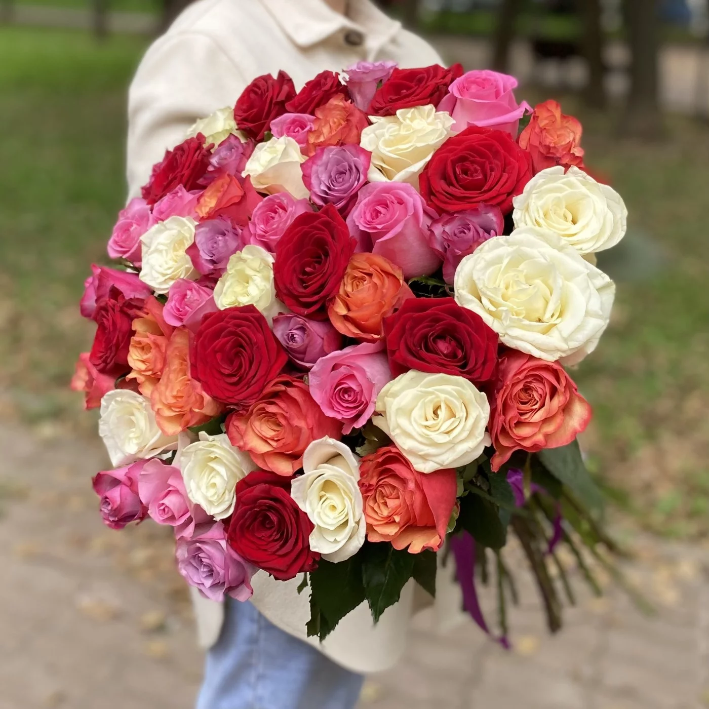 Красивый яркий микс из 5 сортов высоких роз 60 сантиметров. Подарите на день рождения или юбилей прекрасный букет из роз. Такие розы поднимут настроение своими яркими красками и тонким ароматом.