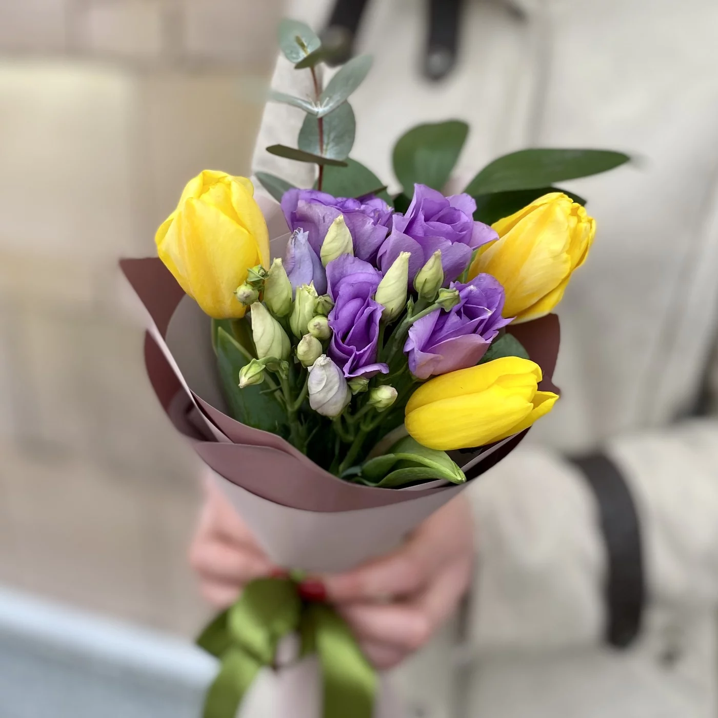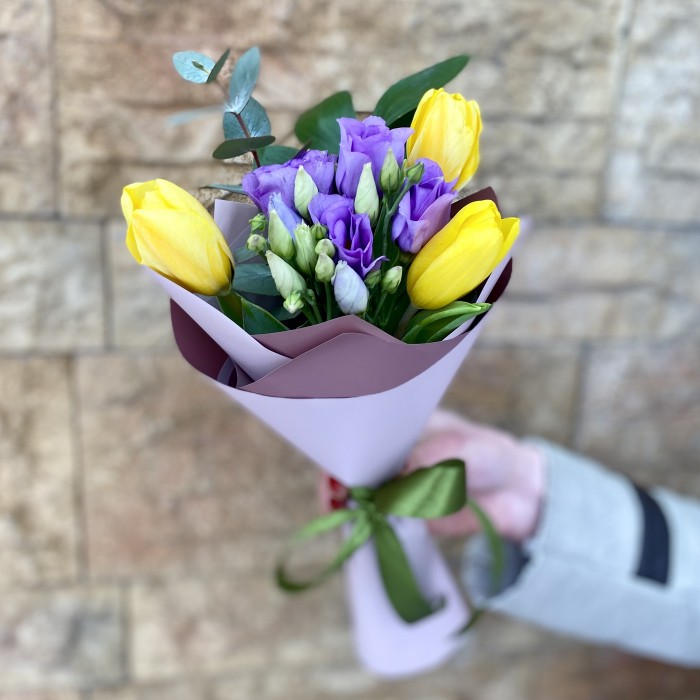 Небольшой букетик из тюльпанов в сочетании с эустомой и ароматным эвкалиптом – прекрасный подарок для сотрудников, коллег, людей, которым хочется сделать комплимент.