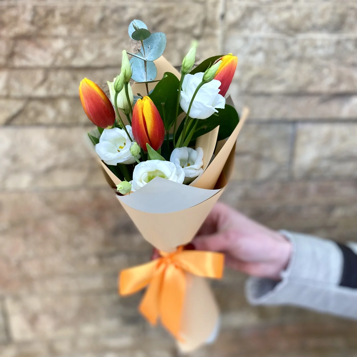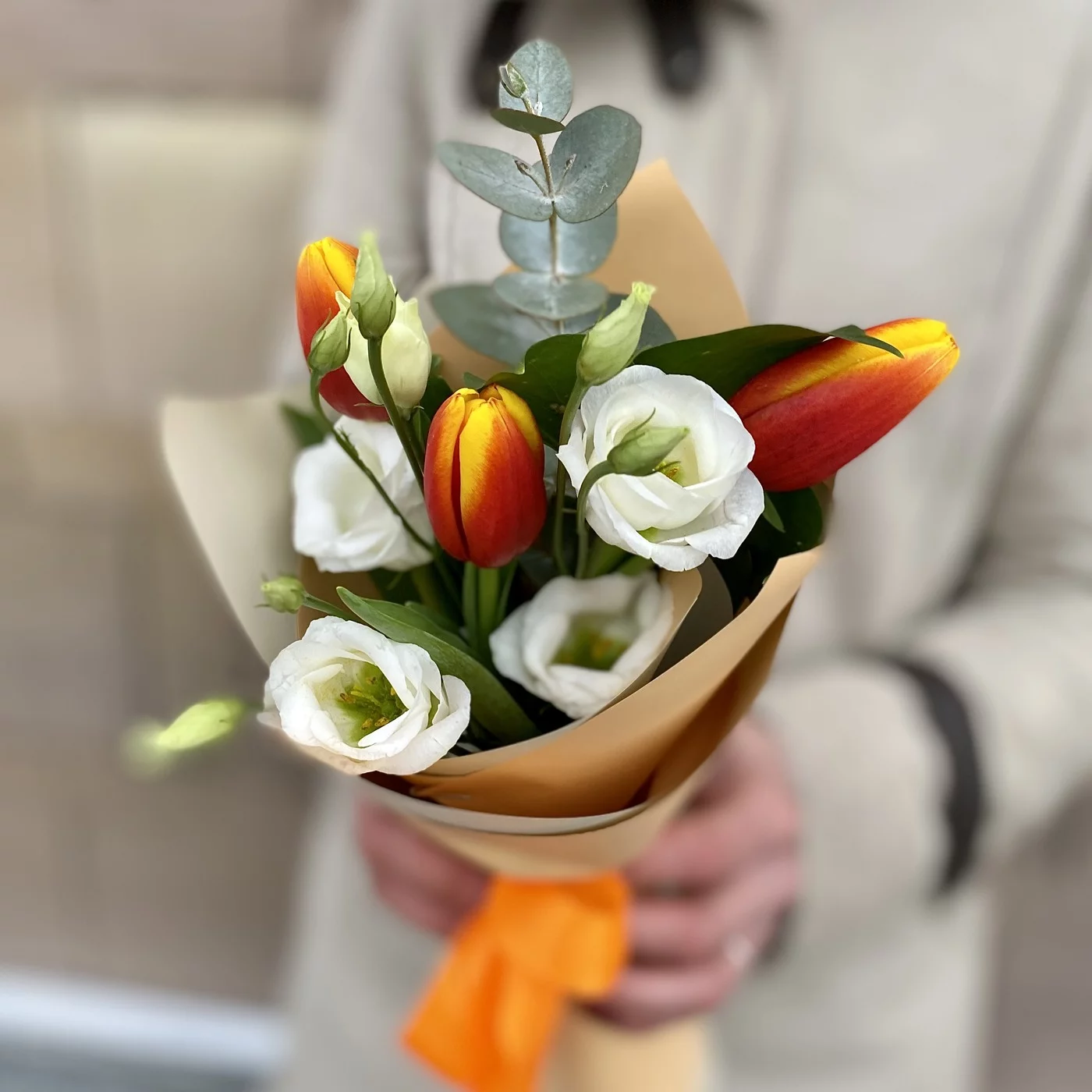 Небольшой букетик из тюльпанов в сочетании с эустомой и ароматным эвкалиптом – прекрасный подарок для сотрудников, коллег, людей, которым хочется сделать комплимент.