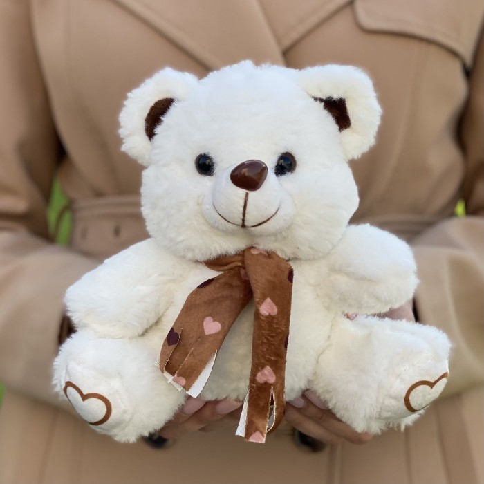 Мишка белый с коричневым бантом 18 см.