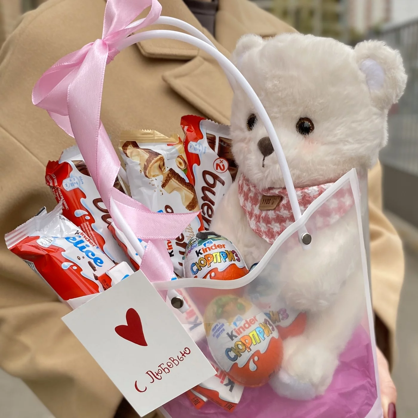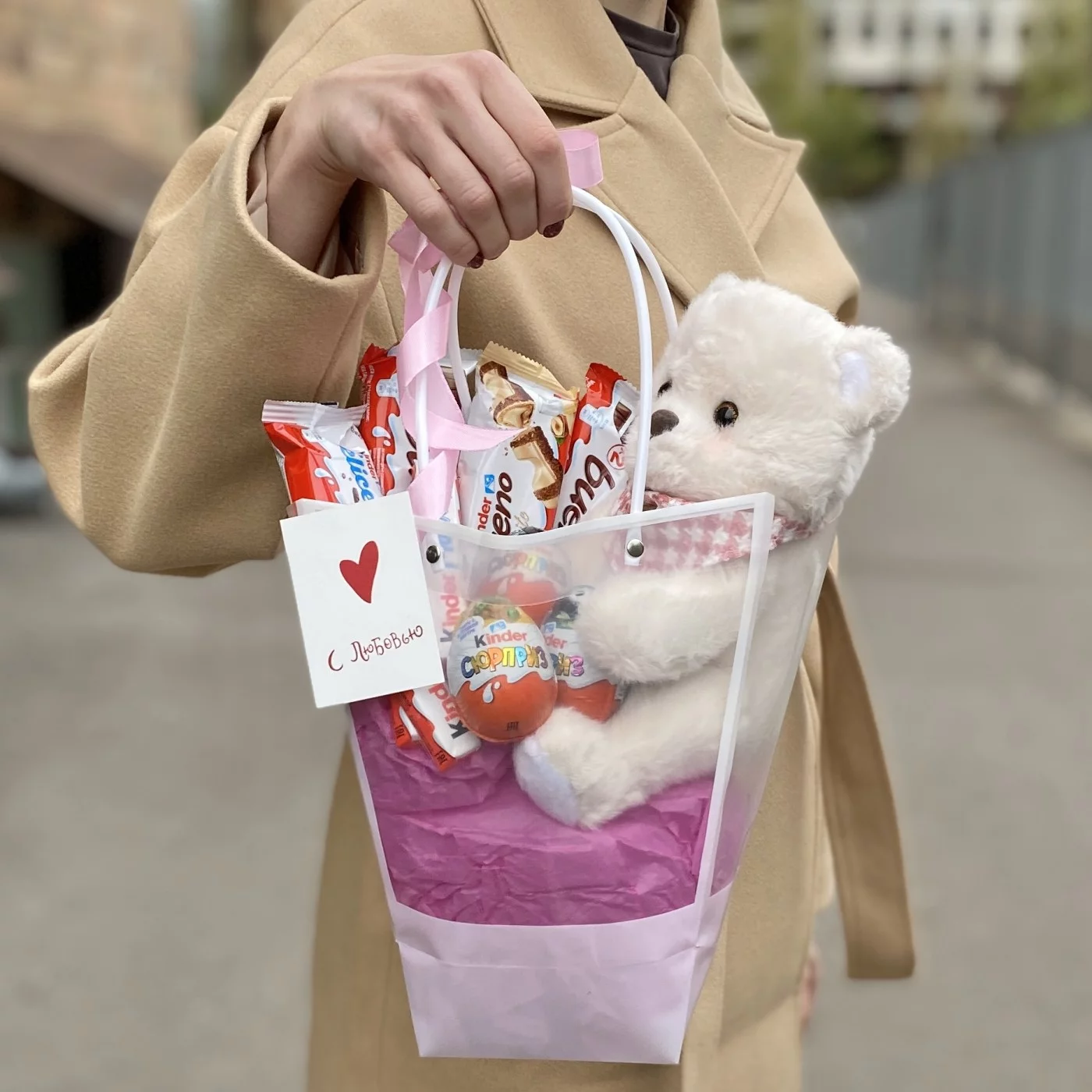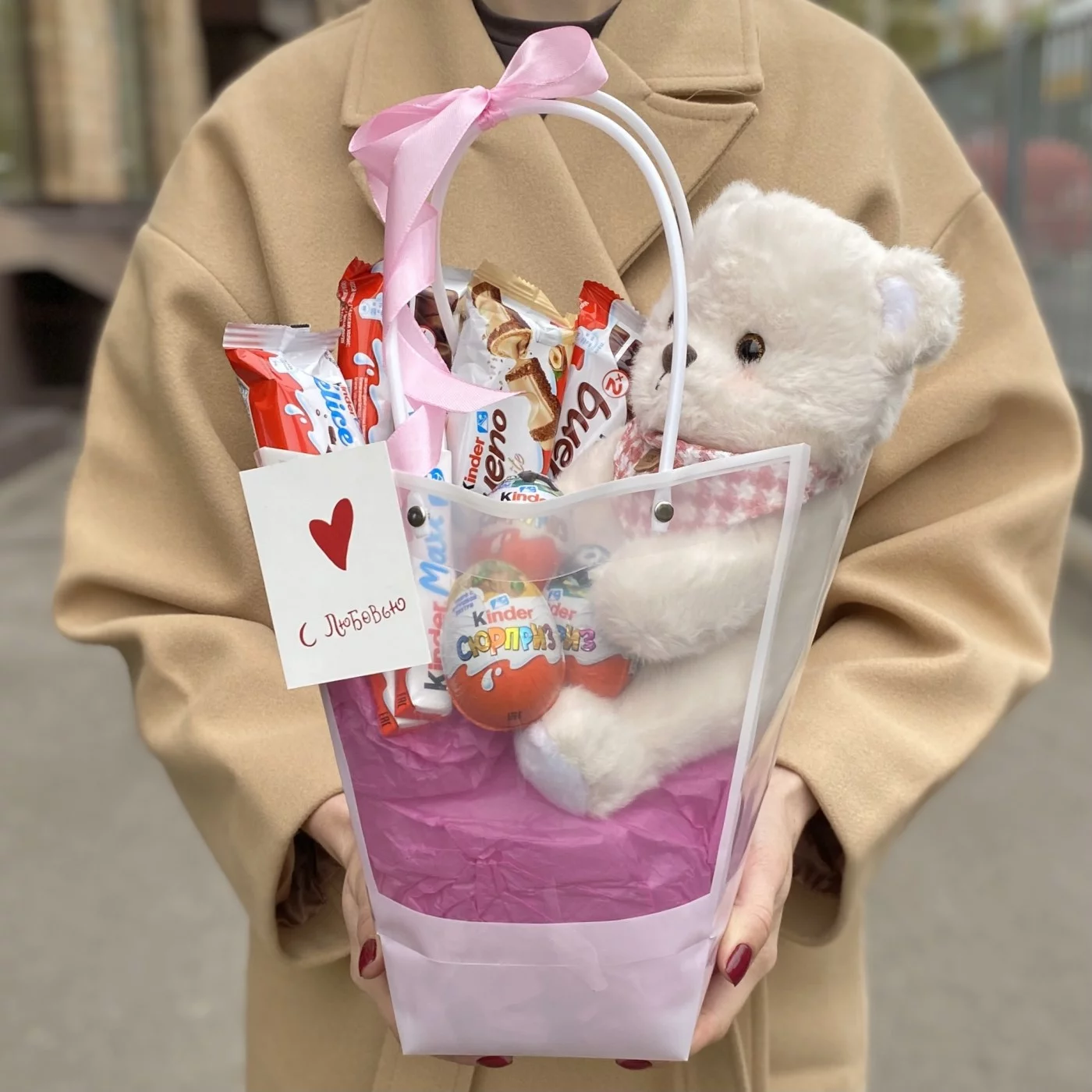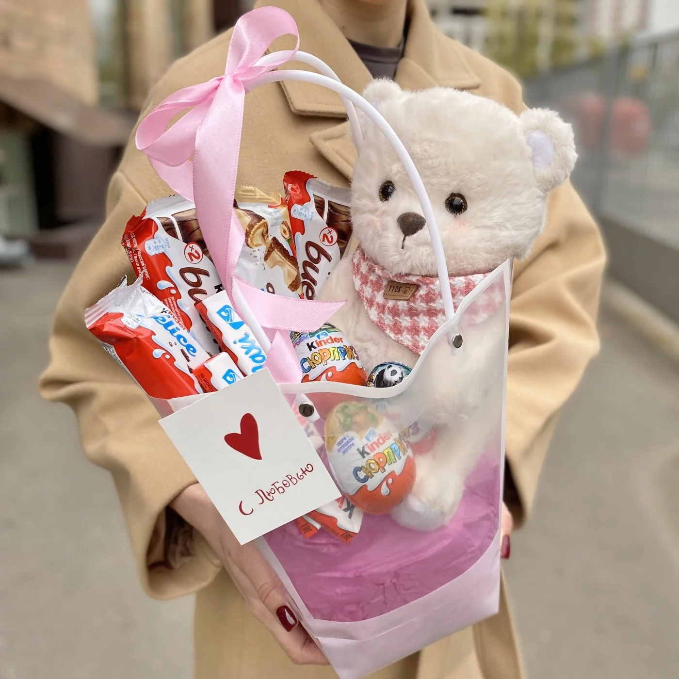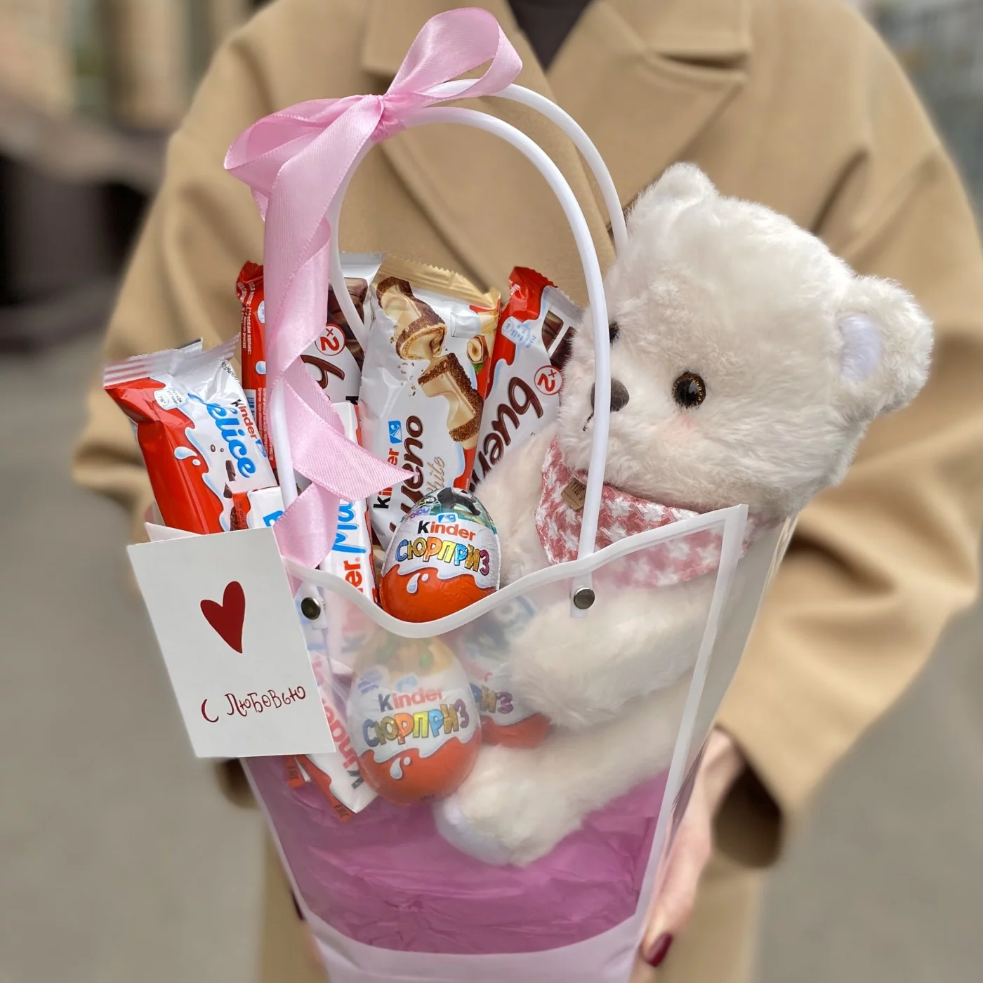 Состав букета: Киндер Сюрприз – 3 шт, Киндер Буэно - 2 шт, Киндер Буэно белый шоколад - 1 шт, Киндер Делис - 1 шт, киндер Макси - 3 шт, Мишка с шарфиком - 1 шт, лента атлас, тишью, открытка, пакет