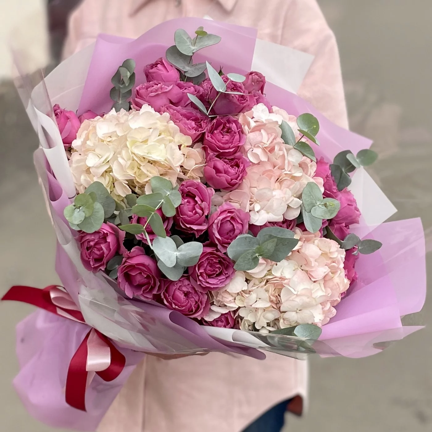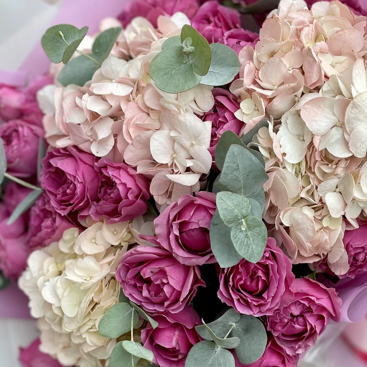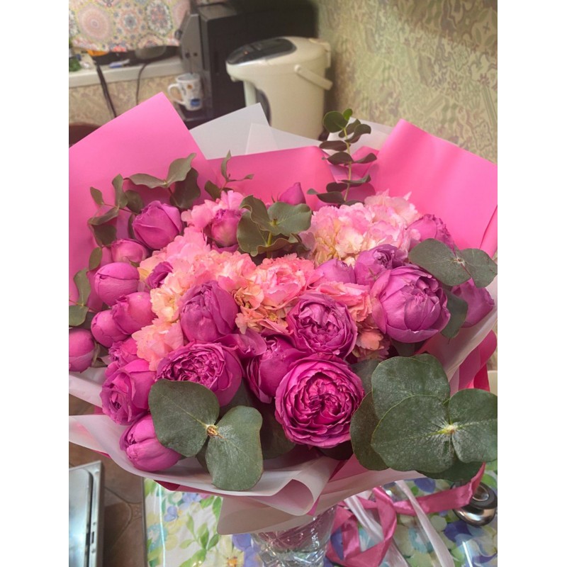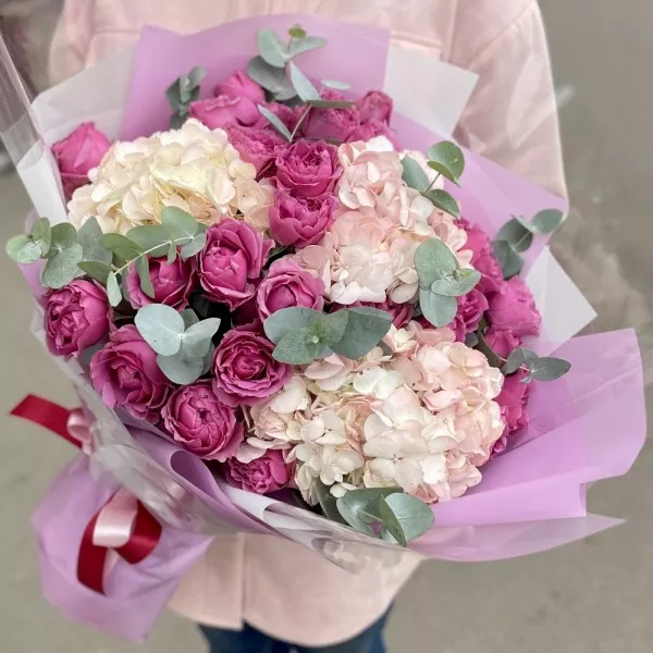 Трио-букет из кустовых пионовидных роз, воздушной гортензии и ароматного эвкалипта.
