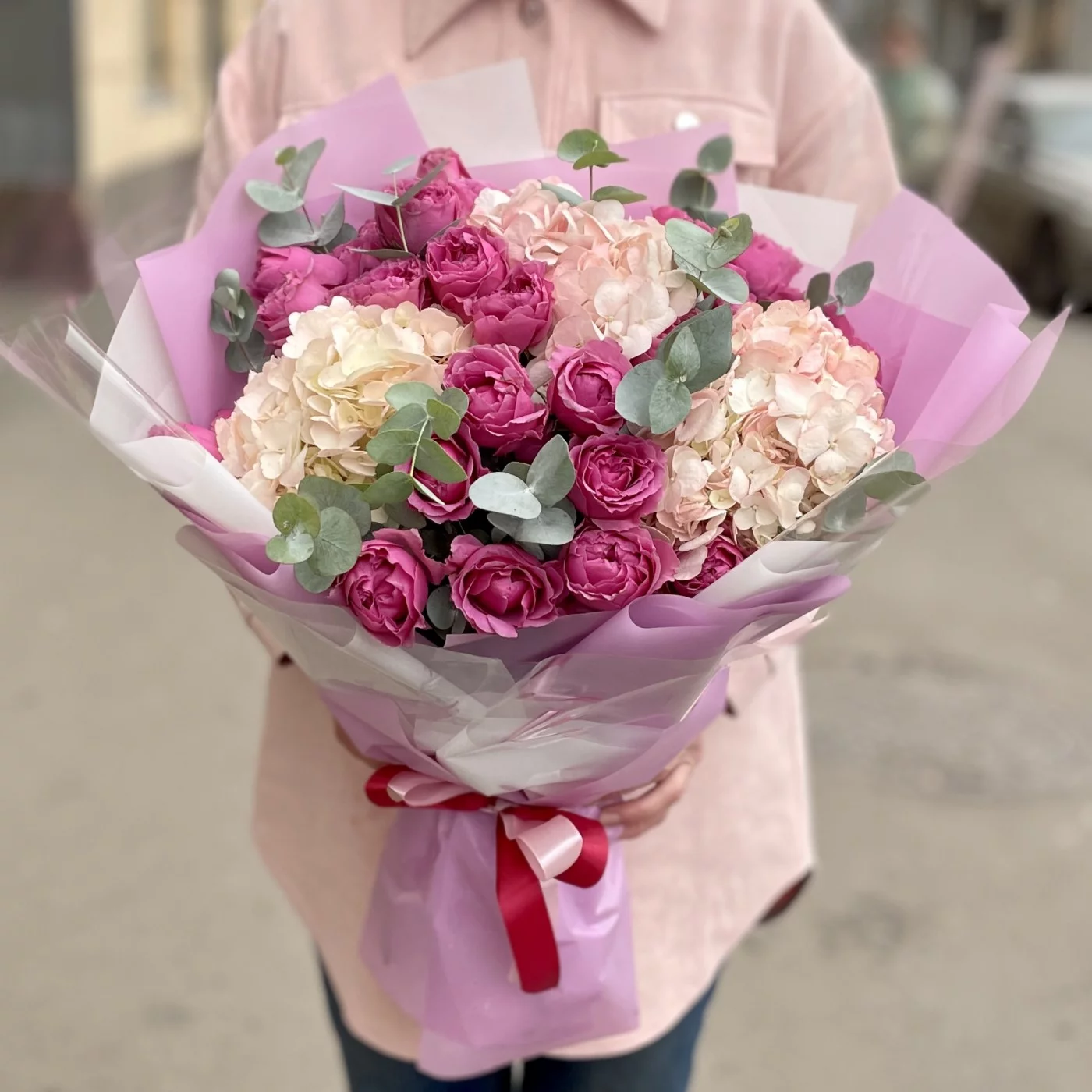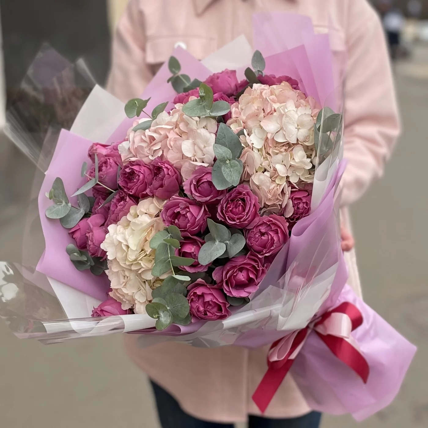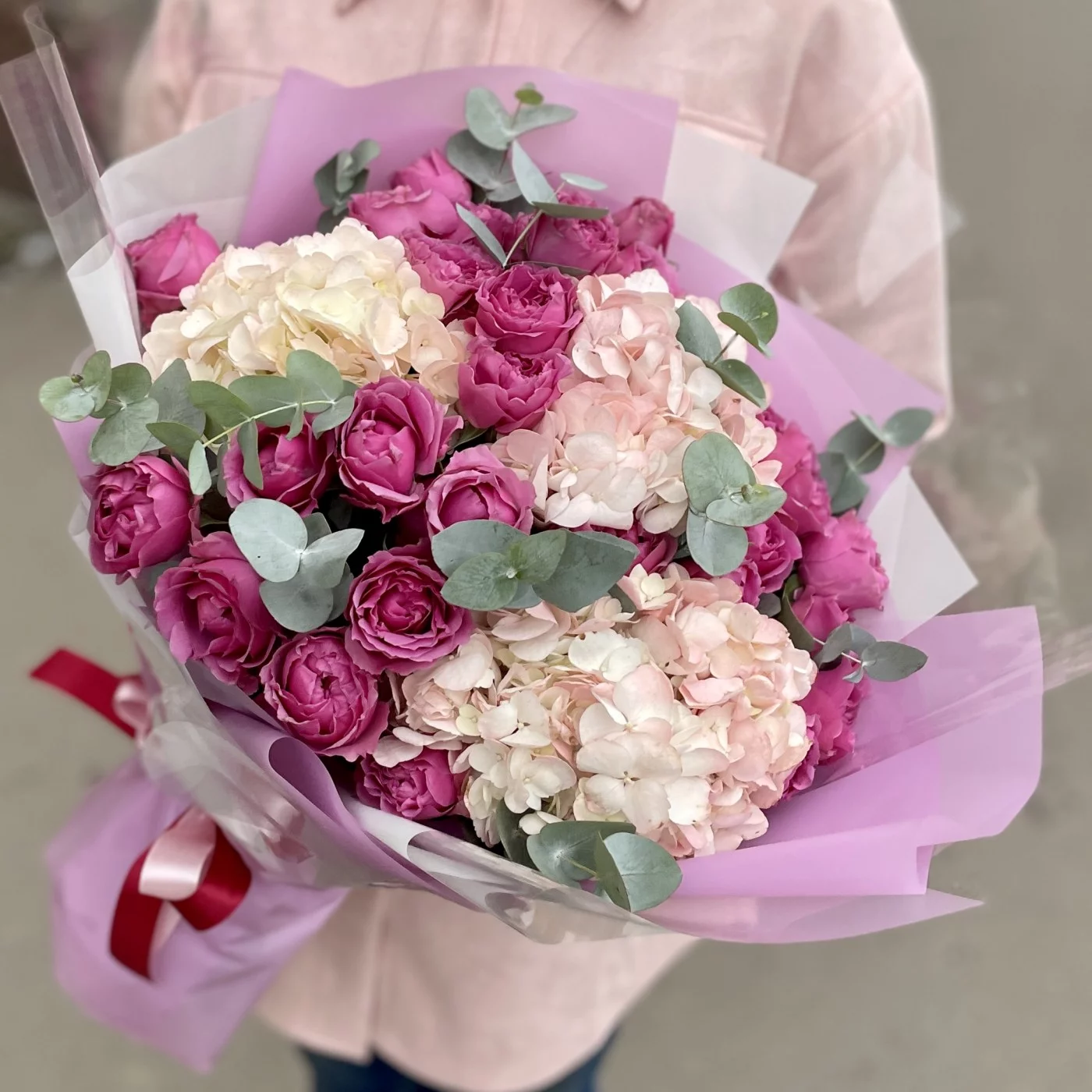 Трио-букет из кустовых пионовидных роз, воздушной гортензии и ароматного эвкалипта.
