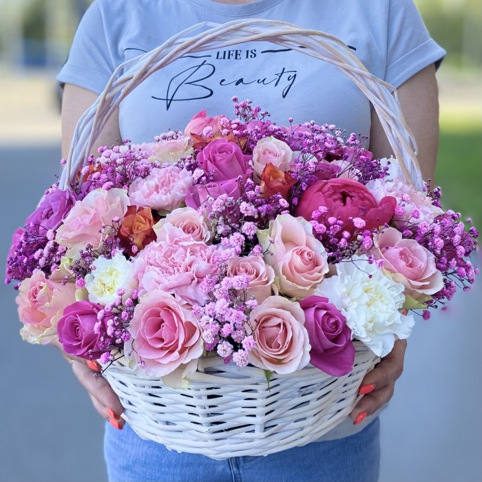 Прекрасная композиция из розы микс, гвоздики и гипсофилы в корзине подарит своей получательнице радость и улыбку.