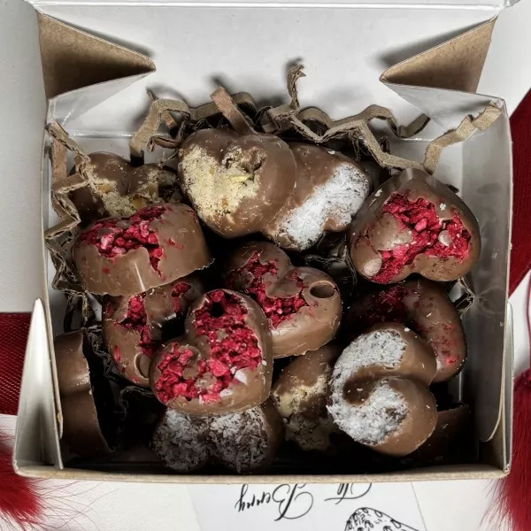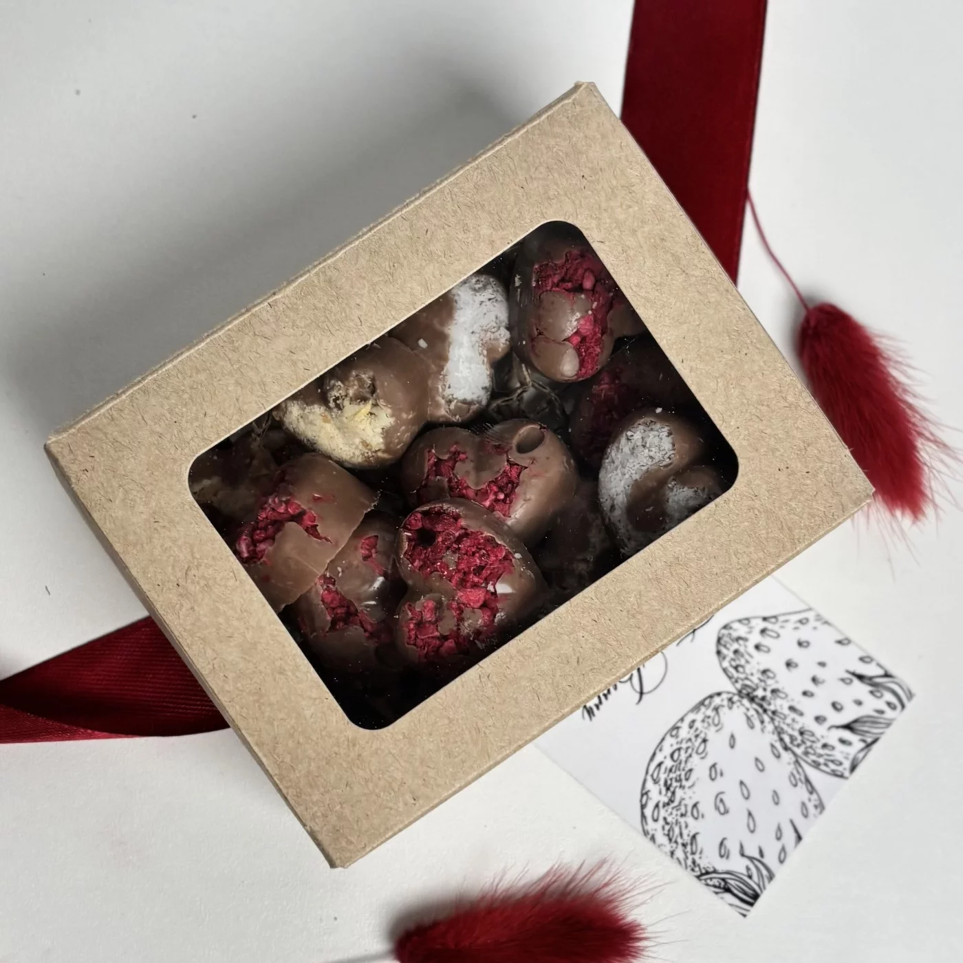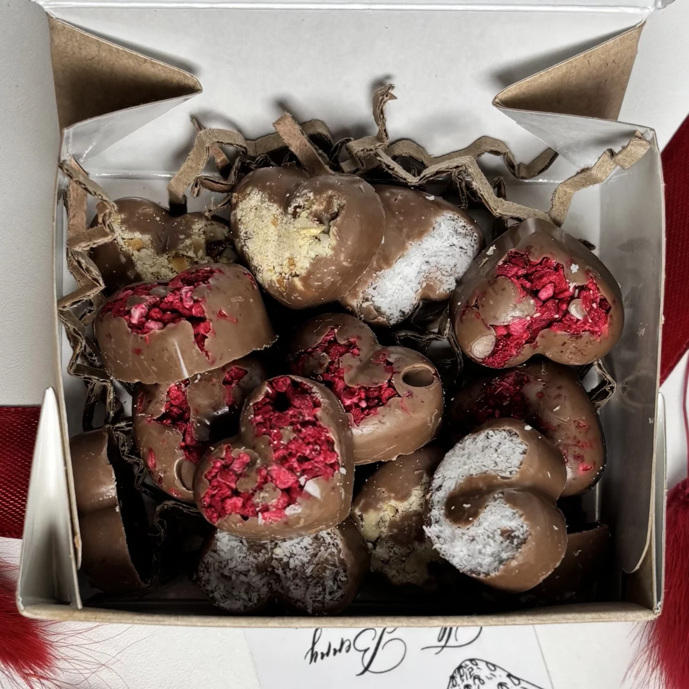 Вкусный набор из молочного шоколада ручной работы с начинками из кокоса, орехов и малины.