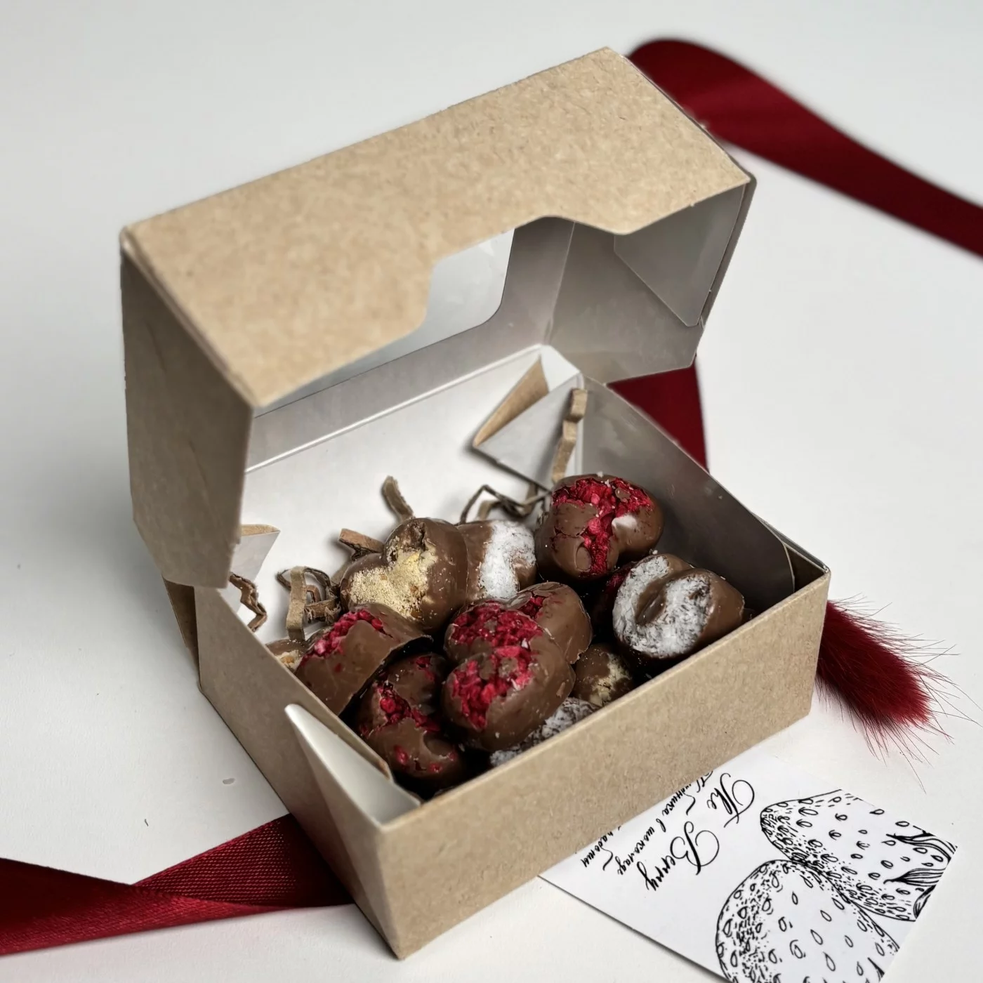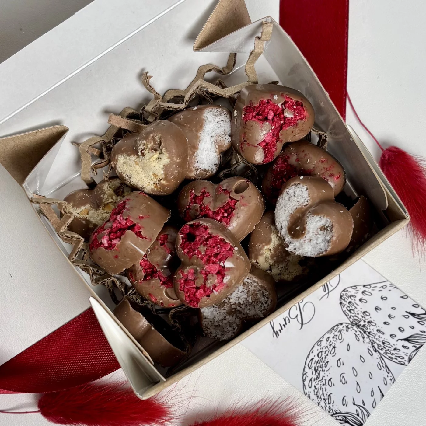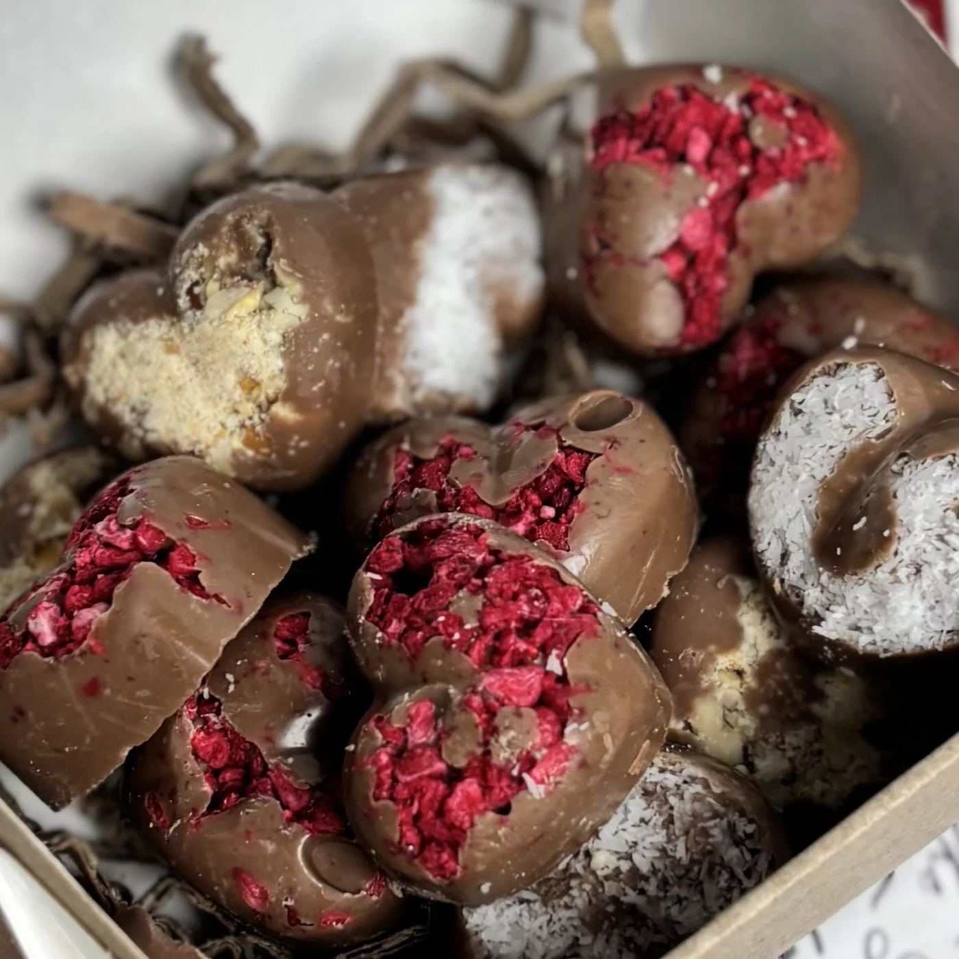 Вкусный набор из молочного шоколада ручной работы с начинками из кокоса, орехов и малины.