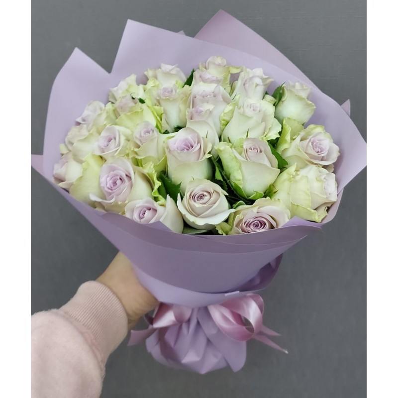 Букет собран с невероятной красоты роз, бутоны которых немного раскрыты, имеют молочное основание и к верху переходят в нежные розово-лиловые оттенки. Этот букет упаковывают в плотную бумагу пастельных оттенков и перевязывают атласной лентой в тон.