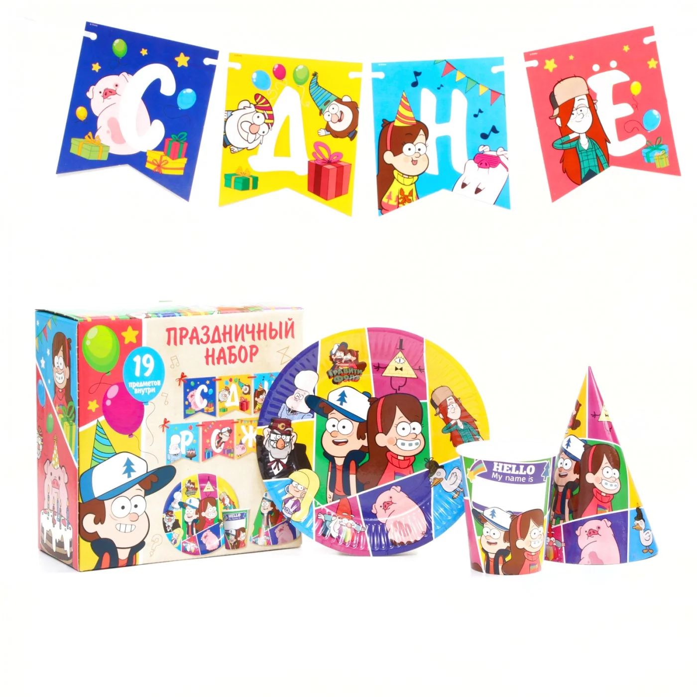 Набор одноразовой бумажной посуды С днем рождения Гравити Фолз на 6 персон.