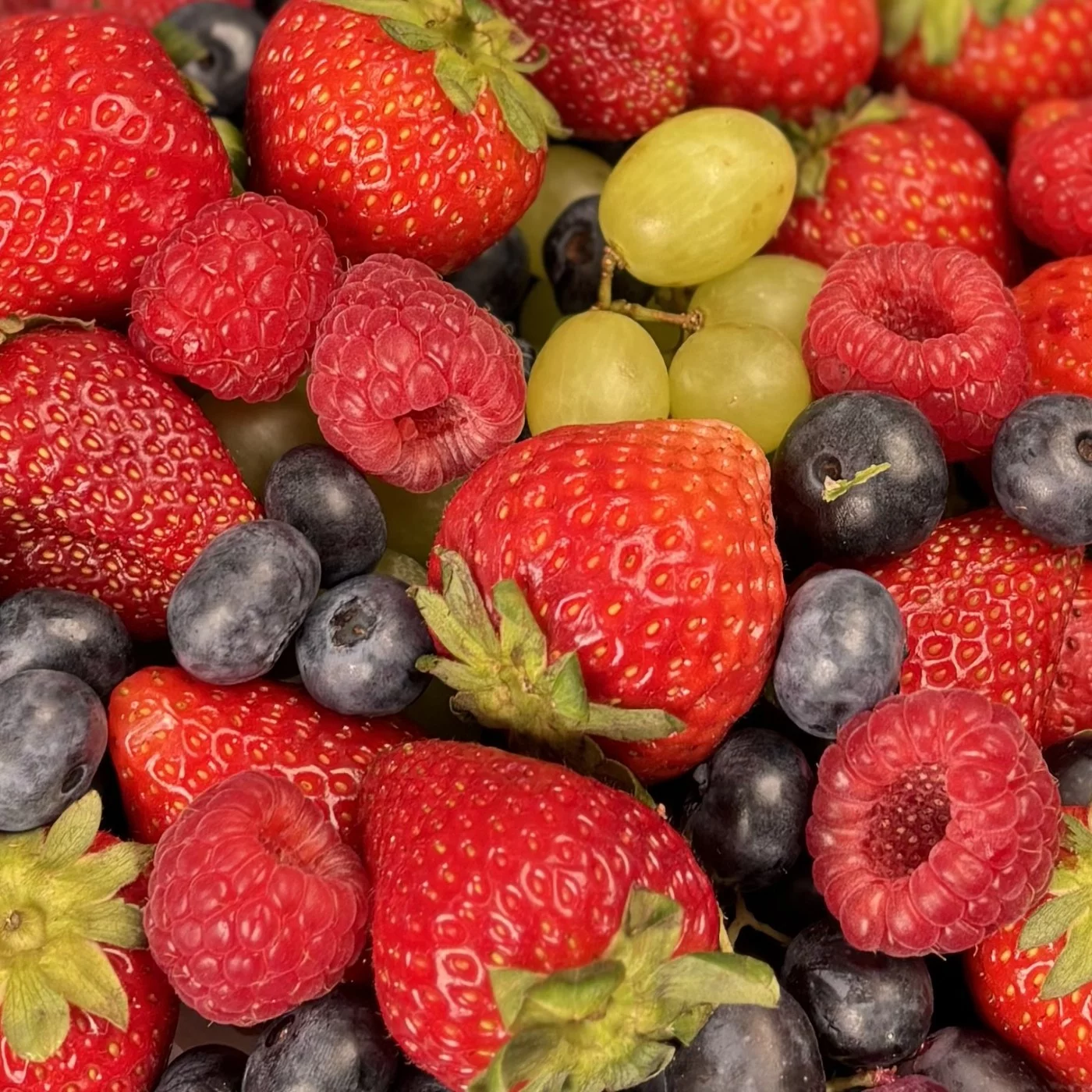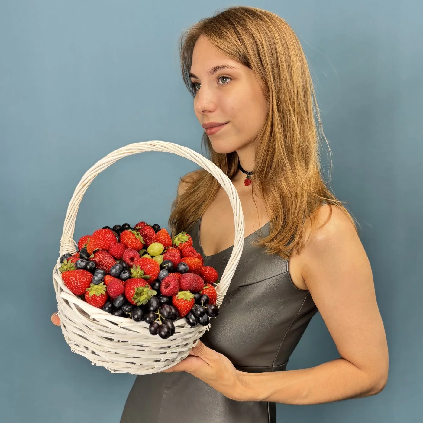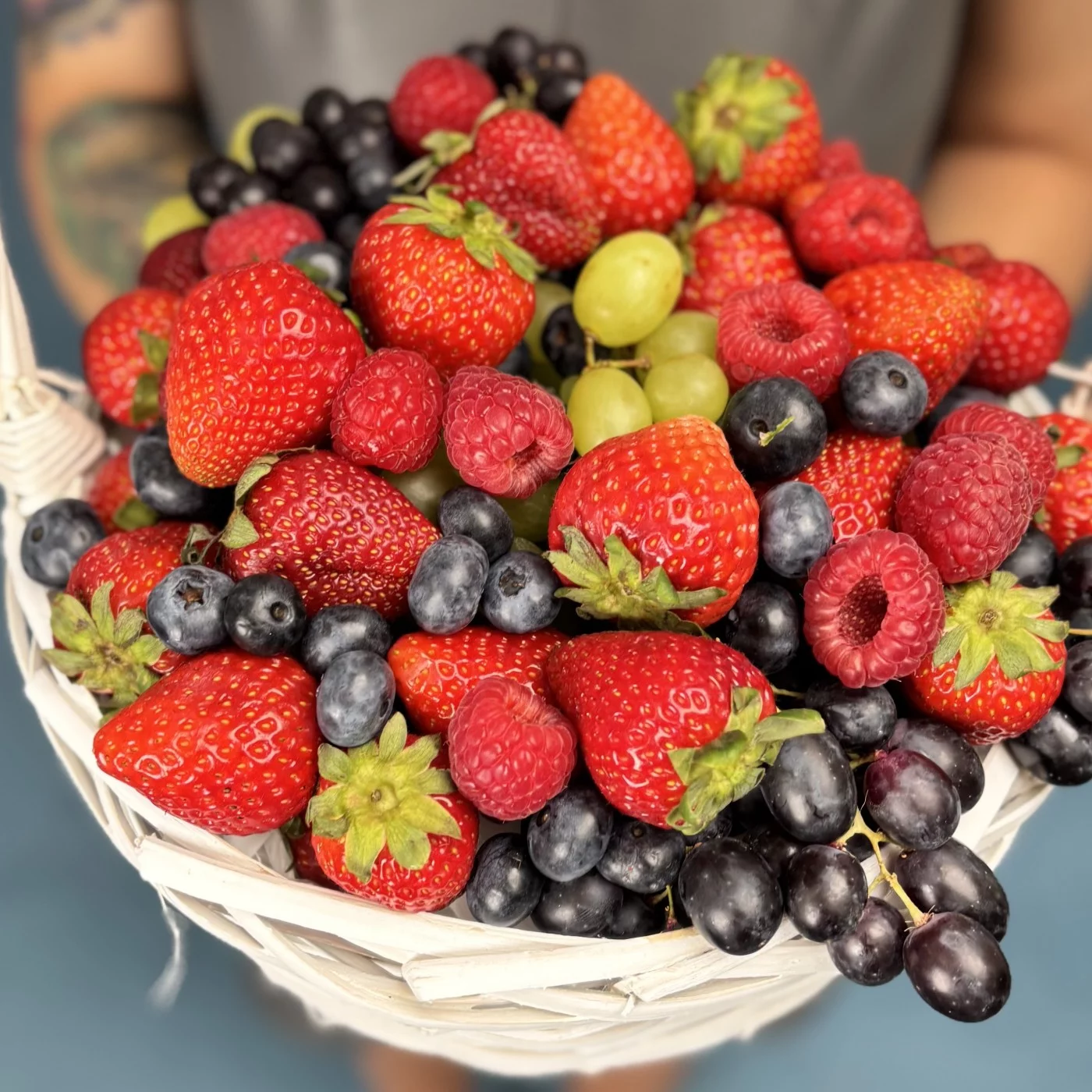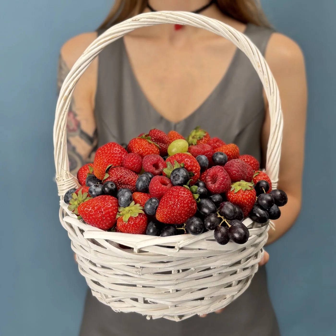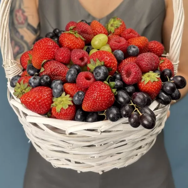 Ягодная корзина из клубники, малины, голубики и винограда. Приятный сюрприз для любимых. На дне корзины содержится пленка, она нужна для того чтобы приподнять ягоды.